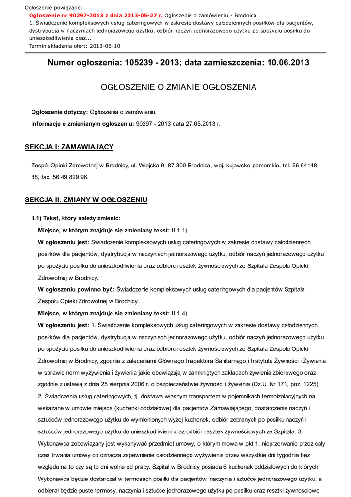 Ogłoszenie powiązane: Ogłoszenie nr 90297-2013 z dnia 2013-05-27 r. Ogłoszenie o zamówieniu - Brodnica 1. Świadczenie kompleksowych usług cateringowych w zakresie dostawy całodziennych posiłków dla pacjentów, dystrybucja w naczyniach jednorazowego użytku, odbiór naczyń jednorazowego użytku po spożyciu posiłku do unieszkodliwienia oraz... Termin składania ofert: 2013-06-10 Numer ogłoszenia: 105239 - 2013; data zamieszczenia: 10.06.2013 OGŁOSZENIE O ZMIANIE OGŁOSZENIA Ogłoszenie dotyczy: Ogłoszenia o zamówieniu. Informacje o zmienianym ogłoszeniu: 90297 - 2013 data 27.05.2013 r. SEKCJA I: ZAMAWIAJĄCY Zespół Opieki Zdrowotnej w Brodnicy, ul. Wiejska 9, 87-300 Brodnica, woj. kujawsko-pomorskie, tel. 56 64148 88, fax. 56 49 829 96. SEKCJA II: ZMIANY W OGŁOSZENIU II.1) Tekst, który należy zmienić: Miejsce, w którym znajduje się zmieniany tekst: II.1.1). W ogłoszeniu jest: Świadczenie kompleksowych usług cateringowych w zakresie dostawy całodziennych posiłków dla pacjentów, dystrybucja w naczyniach jednorazowego użytku, odbiór naczyń jednorazowego użytku po spożyciu posiłku do unieszkodliwienia oraz odbioru resztek żywnościowych ze Szpitala Zespołu Opieki Zdrowotnej w Brodnicy. W ogłoszeniu powinno być: Świadczenie kompleksowych usług cateringowych dla pacjentów Szpitala Zespołu Opieki Zdrowotnej w Brodnicy.. Miejsce, w którym znajduje się zmieniany tekst: II.1.4). W ogłoszeniu jest: 1. Świadczenie kompleksowych usług cateringowych w zakresie dostawy całodziennych posiłków dla pacjentów, dystrybucja w naczyniach jednorazowego użytku, odbiór naczyń jednorazowego użytku po spożyciu posiłku do unieszkodliwienia oraz odbioru resztek żywnościowych ze Szpitala Zespołu Opieki Zdrowotnej w Brodnicy, zgodnie z zaleceniami Głównego Inspektora Sanitarnego i Instytutu Żywności i Żywienia w sprawie norm wyżywienia i żywienia jakie obowiązują w zamkniętych zakładach żywienia zbiorowego oraz zgodnie z ustawą z dnia 25 sierpnia 2006 r. o bezpieczeństwie żywności i żywienia (Dz.U. Nr 171, poz. 1225). 2. Świadczenia usług cateringowych, tj. dostawa własnym transportem w pojemnikach termoizolacyjnych na wskazane w umowie miejsca (kuchenki oddziałowe) dla pacjentów Zamawiającego, dostarczenie naczyń i sztućców jednorazowego użytku do wymienionych wyżej kuchenek, odbiór zebranych po posiłku naczyń i sztućców jednorazowego użytku do unieszkodliwieni oraz odbiór resztek żywnościowych ze Szpitala. 3. Wykonawca zobowiązany jest wykonywać przedmiot umowy, o którym mowa w pkt 1, nieprzerwanie przez cały czas trwania umowy co oznacza zapewnienie całodziennego wyżywienia przez wszystkie dni tygodnia bez względu na to czy są to dni wolne od pracy. Szpital w Brodnicy posiada 6 kuchenek oddziałowych do których Wykonawca będzie dostarczał w termosach posiłki dla pacjentów, naczynia i sztućce jednorazowego użytku, a odbierał będzie puste termosy, naczynia i sztućce jednorazowego użytku po posiłku oraz resztki żywnościowe do unieszkodliwienia. Zestawienie kuchenek: 1. Oddział Anestezjologii i Intensywnej Terapii 2. Oddział Położniczo - Ginekologiczny z Pododdziałem Neonatologicznym 3. Oddział Wewnętrzny z Salą Intensywnego Nadzoru Kardiologicznego 4. Oddział Dziecięcy 5. Oddział Chirurgii Ogólnej z Pododdziałem Urazowo Ortopedycznym 6. Zakład Pielęgnacyjno - Opiekuńczy Przewidywana ilość posiłków składających się na całodzienne wyżywienie dotyczące 12 miesięcy wynosi około: Śniadania, Obiady, Kolacje - w ilości 44 000 osobodni II Śniadania, Podwieczorki - w ilości 27 500 porcji II Kolacje - w ilości 3 500 porcji Podana przez Zamawiającego przewidywana ilość posiłków będących przedmiotem niniejszego postępowania przetargowego jest wyliczone w sposób szacunkowy i w trakcie realizacji przedmiotowej umowy może ulec zmianie (zmniejszeniu lub zwiększeniu) w zależności od bieżących rzeczywistych potrzeb Zamawiającego związanych z ilością hospitalizowanych pacjentów oraz zawartymi umowami z Narodowym Funduszem Zdrowia. Oznaczenie wg. Wspólnego Słownika Zamówień Publicznych kod CPV: 55.32.10.00-6 usługa przygotowywania posiłków 55.52.00.00-1 usługa dostarczania posiłków Usługi o charakterze niepriorytetowym (załącznik nr 2 w Rozporządzeniu Prezesa Rady Ministrów z dnia 28 stycznia 2010 r. w sprawie wykazu usług o charakterze priorytetowym i niepriorytetowym (Dz. U. 2010.12.68). 4. Dostarczanie posiłków odbywać się będzie z uwzględnieniem diet stosowanych w Szpitalu. Żywienie chorych obejmuje następujące diety i dodatki: pełna, łatwostrawna, łatwostrawna bogatobiałkowa, łatwostrawna niskobiałkowa, łatwostrawna z ograniczeniem tłuszczu, o kontrolowanej zawartości kwasów tłuszczowych, z ograniczeniem łatwo przyswajalnych węglowodanów, niskoenergetyczna, wysokoenergetyczna, z ograniczeniem substancji pobudzających wydzielanie soku żołądkowego, bezmleczna / bezlaktozowa, nisko solna, bogatoresztkowa, łatwo strawna o zmiennej konsystencji: płynna, płynna miksowana do żywienia przez: sondę / PEG / gastr. papkowa / mielona, diety specjalne: bezglutenowa, wegetariańska, diety chirurgiczne, kleik + suchary, kisiel, zupa ryżowa, diety inne opracowane wg zaleceń lekarza, Dzieci od 1 roku życia do 3 lat - 1/2 porcji - 50% stawki żywieniowej. Posiłki przysługujące pacjentom w zależności od przybycia pacjenta na oddział: przyjście pacjenta do godz. 6;00 - śniadanie + obiad + kolacja przyjście pacjenta do godz. 10;00 - obiad + kolacja przyjście pacjenta w godz. 10;00 ÷ 15;00 - kolacja w dniu wypisu pacjenta ze szpitala - śniadanie + obiad 5. Wymaganie dostarczanie posiłków w godzinach: Śniadanie, II Śniadanie od 7:00 do 7:30 Obiad, Podwieczorek, Kolacja, II Kolacja od 12:30 do 13:00 Podany opis przedmiotu zamówienia został szczegółowo przedstawiony i opisany poprzez zapisy SIWZ wraz z załącznikam