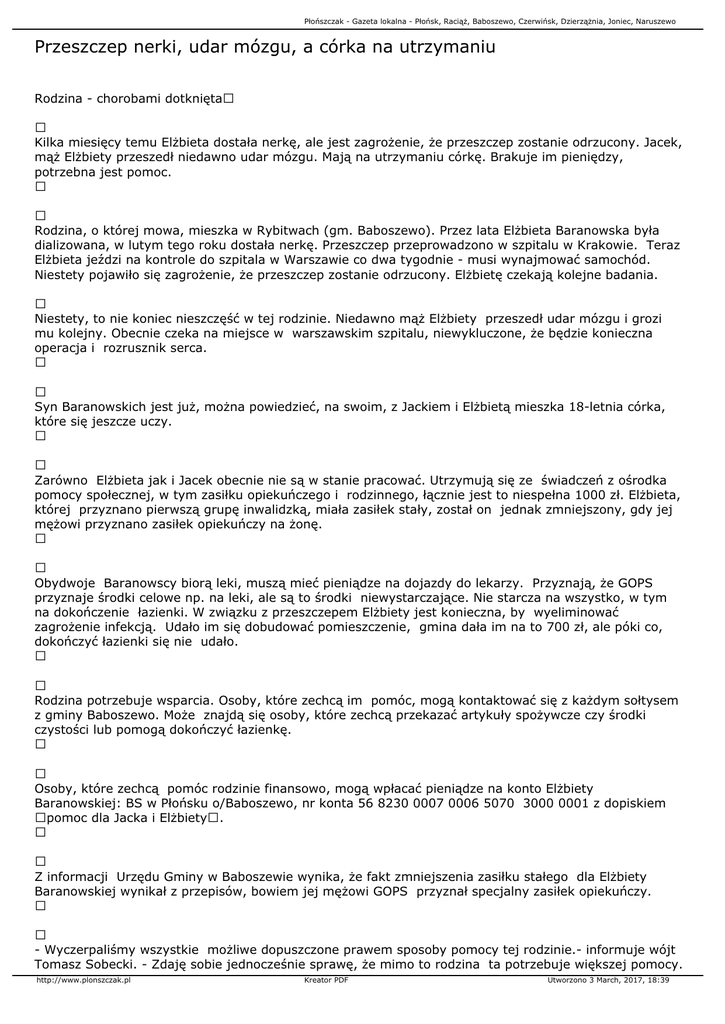 Płońszczak - Gazeta lokalna - Płońsk, Raciąż, Baboszewo, Czerwińsk, Dzierzążnia, Joniec, Naruszewo Przeszczep nerki, udar mózgu, a córka na utrzymaniu Rodzina - chorobami dotknięta Kilka miesięcy temu Elżbieta dostała nerkę, ale jest zagrożenie, że przeszczep zostanie odrzucony. Jacek, mąż Elżbiety przeszedł niedawno udar mózgu. Mają na utrzymaniu córkę. Brakuje im pieniędzy, potrzebna jest pomoc. Rodzina, o której mowa, mieszka w Rybitwach (gm. Baboszewo). Przez lata Elżbieta Baranowska była dializowana, w lutym tego roku dostała nerkę. Przeszczep przeprowadzono w szpitalu w Krakowie. Teraz Elżbieta jeździ na kontrole do szpitala w Warszawie co dwa tygodnie - musi wynajmować samochód. Niestety pojawiło się zagrożenie, że przeszczep zostanie odrzucony. Elżbietę czekają kolejne badania. Niestety, to nie koniec nieszczęść w tej rodzinie. Niedawno mąż Elżbiety przeszedł udar mózgu i grozi mu kolejny. Obecnie czeka na miejsce w warszawskim szpitalu, niewykluczone, że będzie konieczna operacja i rozrusznik serca. Syn Baranowskich jest już, można powiedzieć, na swoim, z Jackiem i Elżbietą mieszka 18-letnia córka, które się jeszcze uczy. Zarówno Elżbieta jak i Jacek obecnie nie są w stanie pracować. Utrzymują się ze świadczeń z ośrodka pomocy społecznej, w tym zasiłku opiekuńczego i rodzinnego, łącznie jest to niespełna 1000 zł. Elżbieta, której przyznano pierwszą grupę inwalidzką, miała zasiłek stały, został on jednak zmniejszony, gdy jej mężowi przyznano zasiłek opiekuńczy na żonę. Obydwoje Baranowscy biorą leki, muszą mieć pieniądze na dojazdy do lekarzy. Przyznają, że GOPS przyznaje środki celowe np. na leki, ale są to środki niewystarczające. Nie starcza na wszystko, w tym na dokończenie łazienki. W związku z przeszczepem Elżbiety jest konieczna, by wyeliminować zagrożenie infekcją. Udało im się dobudować pomieszczenie, gmina dała im na to 700 zł, ale póki co, dokończyć łazienki się nie udało. Rodzina potrzebuje wsparcia. Osoby, które zechcą im pomóc, mogą kontaktować się z każdym sołtysem z gminy Baboszewo. Może znajdą się osoby, które zechcą przekazać artykuły spożywcze czy środki czystości lub pomogą dokończyć łazienkę. Osoby, które zechcą pomóc rodzinie finansowo, mogą wpłacać pieniądze na konto Elżbiety Baranowskiej: BS w Płońsku o/Baboszewo, nr konta 56 8230 0007 0006 5070 3000 0001 z dopiskiem pomoc dla Jacka i Elżbiety. Z informacji Urzędu Gminy w Baboszewie wynika, że fakt zmniejszenia zasiłku stałego dla Elżbiety Baranowskiej wynikał z przepisów, bowiem jej mężowi GOPS przyznał specjalny zasiłek opiekuńczy. - Wyczerpaliśmy wszystkie możliwe dopuszczone prawem sposoby pomocy tej rodzinie.- informuje wójt Tomasz Sobecki. - Zdaję sobie jednocześnie sprawę, że mimo to rodzina ta potrzebuje większej pomocy. http://www.plonszczak.pl Kreator PDF Utworzono 3 March, 2017, 18:39 Płońszczak - Gazeta lokalna - Płońsk, Raciąż, Baboszewo, Czerwińsk, Dzierzążnia, Joniec, Naruszewo Tej pomocy upatrywałbym jednak w strukturach organizacji pozarządowych np. fundacjach czy stowarzyszeniach. Deklaruję jednocześnie, że postaram się pomóc w ten właśnie sposób szukając jakiegoś wsparcia ze strony organizacji pozarządowych. Katarzyna Olszewska foto: Katarzyna Olszewska http://www.plonszczak.pl Kreator PDF Utworzono 3 March, 2017, 18:39