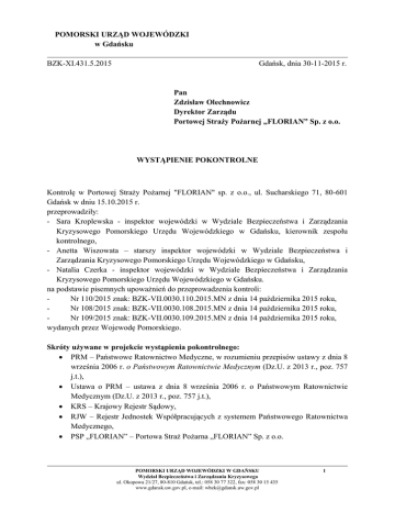 POMORSKI URZĄD WOJEWÓDZKI w Gdańsku Gdańsk, dnia 30-11-2015 r. BZK-XI.431.5.2015 Pan Zdzisław Olechnowicz Dyrektor Zarządu Portowej Straży Pożarnej „FLORIAN” Sp. z o.o. WYSTĄPIENIE POKONTROLNE Kontrolę w Portowej Straży Pożarnej "FLORIAN" sp. z o.o., ul. Sucharskiego 71, 80-601 Gdańsk w dniu 15.10.2015 r. przeprowadziły: - Sara Kroplewska - inspektor wojewódzki w Wydziale Bezpieczeństwa i Zarządzania Kryzysowego Pomorskiego Urzędu Wojewódzkiego w Gdańsku, kierownik zespołu kontrolnego, - Anetta Wiszowata – starszy inspektor wojewódzki w Wydziale Bezpieczeństwa i Zarządzania Kryzysowego Pomorskiego Urzędu Wojewódzkiego w Gdańsku, - Natalia Czerka - inspektor wojewódzki w Wydziale Bezpieczeństwa i Zarządzania Kryzysowego Pomorskiego Urzędu Wojewódzkiego w Gdańsku. na podstawie pisemnych upoważnień do przeprowadzenia kontroli: Nr 110/2015 znak: BZK-VII.0030.110.2015.MN z dnia 14 października 2015 roku, Nr 108/2015 znak: BZK-VII.0030.108.2015.MN z dnia 14 października 2015 roku, Nr 109/2015 znak: BZK-VII.0030.109.2015.MN z dnia 14 października 2015 roku, wydanych przez Wojewodę Pomorskiego. Skróty używane w projekcie wystąpienia pokontrolnego: PRM – Państwowe Ratownictwo Medyczne, w rozumieniu przepisów ustawy z dnia 8 września 2006 r. o Państwowym Ratownictwie Medycznym (Dz.U. z 2013 r., poz. 757 j.t.), Ustawa o PRM – ustawa z dnia 8 września 2006 r. o Państwowym Ratownictwie Medycznym (Dz.U. z 2013 r., poz. 757 j.t.), KRS – Krajowy Rejestr Sądowy, RJW – Rejestr Jednostek Współpracujących z systemem Państwowego Ratownictwa Medycznego, PSP „FLORIAN” – Portowa Straż Pożarna „FLORIAN” Sp. z o.o. POMORSKI URZĄD WOJEWÓDZKI W GDAŃSKU Wydział Bezpieczeństwa i Zarządzania Kryzysowego ul. Okopowa 21/27, 80-810 Gdańsk, tel.: 058 30 77 322, fax: 058 30 15 435 www.gdansk.uw.gov.pl, e-mail: [email protected] 1 I. Temat, zakres kontroli i okres objęty kontrolą: Temat kontroli: Spełnienie przez jednostkę współpracującą z systemem Państwowego Ratownictwa Medycznego wymagań określonych w art. 17 ust. 2 z ustawy z dnia 8 września 2006 r. o Państwowym Ratownictwie Medycznym (Dz. U. z 2013, Nr 757 ze zm.). Zakres przedmiotowy kontroli oraz stan prawny dotyczący zakresu kontroli: 1) sprawdzenie spełnienia przez jednostkę kontrolowaną wymagań określonych w art. 17 ust. 2 ustawy z dnia 8 września 2006 r. o Państwowym Ratownictwie Medycznym tj.: zapewnienie gotowości operacyjnej, dysponowanie ratownikami posiadającymi ważne zaświadczenia o ukończeniu kursu i uzyskaniu tytułu ratownika w liczbie niezbędnej do zapewnienia gotowości operacyjnej, dysponowanie środkami łączności niezbędnymi do zapewnienia gotowości operacyjnej. 2) sprawdzenie zgodności stanu faktycznego z danymi jednostki w rejestrze jednostek współpracujących z systemem PRM tj. następujących danych: nazwę, siedzibę i adres jednostki współpracującej z systemem, teren działania jednostki współpracującej z systemem, liczbę ratowników posiadających ważne zaświadczenia o ukończeniu kursu i uzyskaniu tytułu ratownika, wykaz wyposażenia, jakim dysponuje jednostka współpracująca z systemem, maksymalny czas dotarcia ratowników tej jednostki na miejsce zdarzenia, numery telefonów kontaktowych. Okres objęty kontrolą: 24.03.2011 r. – 15.10.2015 r. II. Ocena skontrolowanej działalności ze wskazaniem ustaleń na których została oparta II.1 Ocena skontrolowanej działalności Wykonywanie zadań w kontrolowanym zakresie oceniam pozytywnie, gdyż nie stwierdzono nieprawidłowości, a uchybienia są sporadyczne i nie mają wpływu na kontrolowaną działalność. II.2. Ustalenia W wyniku przeprowadzonej kontroli dokonano następujących ustaleń, w okresie objętym kontrolą. 1. Wyjaśnień w trakcie czynności kontrolnych udzielał Pan Zdzisław Olechnowicz. Na podstawie KRS Numer: 0000043741 Pan Zdzisław Olechnowicz pełni funkcję Dyrektora Zarządu Portowej Straży Pożarnej „FLORIAN” Sp. z o.o. Dowód: akta kontroli, str. 23-29 2. Zgodnie z zapisami pkt. II 1. regulaminu organizacyjnego Portowej Straży Pożarnej „FLORIAN” Sp. z o.o. podstawową działalnością PSP „FLORIAN” jest ochrona przeciwpożarowa terenów i obiektów zarządzanych przez ZMPG S.A., polegająca na realizacji przedsięwzięć mających na celu ochronę życia, zdrowia, mienia lub środowiska przed pożarem, klęską żywiołową lub innym miejscowym zagrożeniem poprzez: - zapobieganie powstawaniu i rozprzestrzenianiu się pożaru, klęsk żywiołowych lub innego miejscowego zagrożenia, POMORSKI URZĄD WOJEWÓDZKI W GDAŃSKU Wydział Bezpieczeństwa i Zarządzania Kryzysowego ul. Okopowa 21/27, 80-810 Gdańsk, tel.: 058 30 77 322, fax: 058 30 15 435 www.gdansk.uw.gov.pl, e-mail: [email protected] 2 - zapewnienie sił i środków do zwalczania pożaru, klęski żywiołowej lub innego miejscowego zagrożenia, - prowadzenie działań ratowniczych i usuwanie ich skutków. Dowód: akta kontroli, płyta CD 3. Kontrolujący ustalili, iż do zadań ratowników medycznych PSP „FLORIAN” Sp. z o.o. należy w szczególności zabezpieczanie ćwiczeń oraz prowadzenie szkoleń, na podstawie zawartych z nimi umów zlecenia. Ratownicy kwalifikowanej pierwszej pomocy pracują na podstawie umowy o pracę w Zakładowej Straży Pożarnej. W skład PSP „FLORIAN” wchodzą następujący ratownicy kwalifikowanej pierwszej pomocy: (…)*.Kontrolujący ustalili, iż wszyscy ww. ratownicy posiadają ważne zaświadczenie o ukończeniu kursu w zakresie kwalifikowanej pierwszej pomocy. Liczba ratowników KPP ustalona w czasie kontroli jest równa liczbie ratowników KPP wykazanej w RJW. PSP „FLORIAN” zawiera umowy zlecenia z następującymi ratownikami medycznymi: (…)*. Kontrolujący ustalili, iż ww. ratownicy medyczni posiadają dyplom uzyskania tytułu ratownika medycznego. Ustalono, iż ratownicy medyczni wykazani w RJW nie są człon