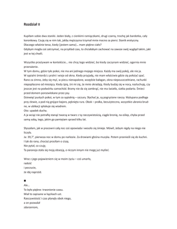Rozdział II Kupiłam sobie dwa staniki. Jeden biały, z cienkimi ramiączkami, drugi czarny, trochę jak bardotka, cały koronkowy. Czuję się w nim tak, jakby mężczyzna trzymał mnie mocno za piersi. Stanik erotyczny. Dlaczego właśnie teraz, kiedy (jestem sama)… mam piękne ciało? Gdybym mogła coś zatrzymać, na przykład czas, to chciałabym zachować na zawsze swój wygląd takim, jaki jest w tej chwili. Wszystko przeżywam w kontekście… nie chcę tego widzieć, bo kiedy zaczynam widzieć, ogarnia mnie przerażenie. W tym domu, gdzie tyle pokoi, nie ma ani jednego mojego miejsca. Każdy ma swój pokój, ale nie ja. W sypialni śmierdzi z pralni i wieje od okna. Kiedy przyjadę, nie mam właściwie gdzie się położyć spać. Rano za zimno, żeby się myć, w piecu nienapalone, wszędzie bałagan, okna niepouszczelniane, rachunki niepopłacone od miesięcy. Kiedy śpię, śni mi się, że mnie okradają. Kiedy budzę się w nocy, nasłuchuję, czy jeszcze jest na podwórku samochód. Bramy nie da się zamknąć, nie ma światła, siatka podarta. Śmieci przed domem porozwlekane przez psy. Dziewięć pustych pokoi, w tym za sypialnią – szczury. Słychać je, są pogryzione rzeczy. Wyłupana podłoga przy zlewie, a pod nią gnijące bajoro, pęknięta rura. Obok – pralka, bezużyteczna, wszystkie ubrania brudne, w ubikacji spłukuje się wiadrem. Oto: upadek ducha. A ja wciąż nie potrafię stanąć twarzą w twarz z tą rzeczywistością, ciągle bronię, na oślep, chyba przed samą sobą, tego, jakim go pamiętam sprzed kilku lat. Słyszałam, jak w pracowni całą noc coś opowiada i wesoło się śmieje. Mówił, żebym nigdy na niego nie liczyła. Ja: 39,7°, pierwsza noc w domu po narkozie. Za drzwiami głośna muzyka. Potem przenieśli się do kuchni. I tak do rana, chociaż prosiłam o ciszę. Nie pytał, co czuję. Ta paranoja stała się moją obsesją, o niczym innym nie mogę już myśleć. Wraz z jego pojawieniem się w moim życiu – coś umarło, radość i poczucie, że idę naprzód. Ale… To było piękne: trwonienie czasu. Miał to zapisane w kącikach ust. Rzeczywistość i czas płynęły obok niego, a on pozwalał zdarzeniom, niepodzielony czas / strona 12 jak kochankom, przychodzić i odchodzić. Przyjmował je z całym swoim ciepłem i pozwalał odejść, kiedy chciały. To, co mówię do ciebie, to jak kamień w ciemną wodę studni. Nie da się ocalić tych marzeń. Mam dreszcze, nie mogę spać. Sama tu weszłam i sama muszę znaleźć drogę wyjścia. między nami: pustka, jałowe pole smutek świadomość podjęcia błędnych decyzji zbyt brzemiennych w skutki to wszystko, co się wydarzyło, trwa między nami niema przestrzeń bez tlenu, przez którą nie da się przejść próżnia prawie rok, a jednak – czy nigdy nie będziemy wobec siebie bez emocji? jakim dziwnym jesteś człowiekiem jak intryguje mnie twoja przestrzeń jak echo powraca i mówi chyba o tym, że nadal nie jesteśmy rozdzieleni daleka miłość, jak dogasający żar ogniska ogień dawno nie płonie, a w głębi pod czarnym i spalonym, dogasa żar już nie parzy zdarzenia i obrazy / glina / strona 221 67 na tej stronie i na stronie obok: Ratowanie rzeźby Kochankowie, przygotowywanie formy z gipsu, 2005 zdarzenia i obrazy / marmur / strona 222 Cave Michelangelo, kamieniołom w Carrarze; na stronie obok: wybieranie marmuru, 2010