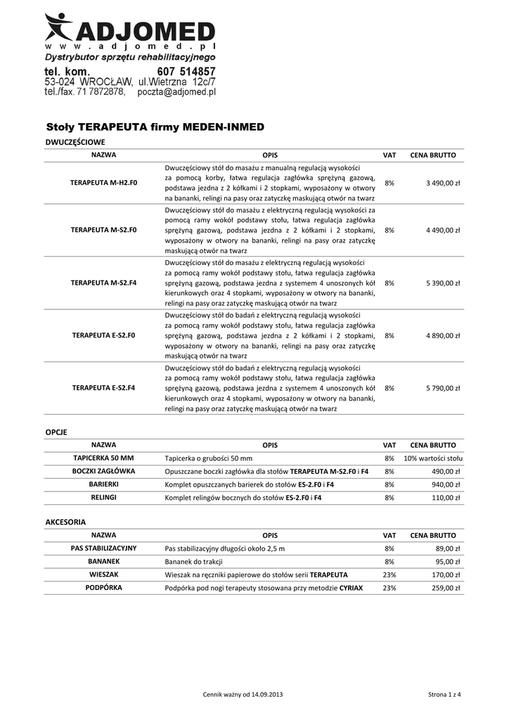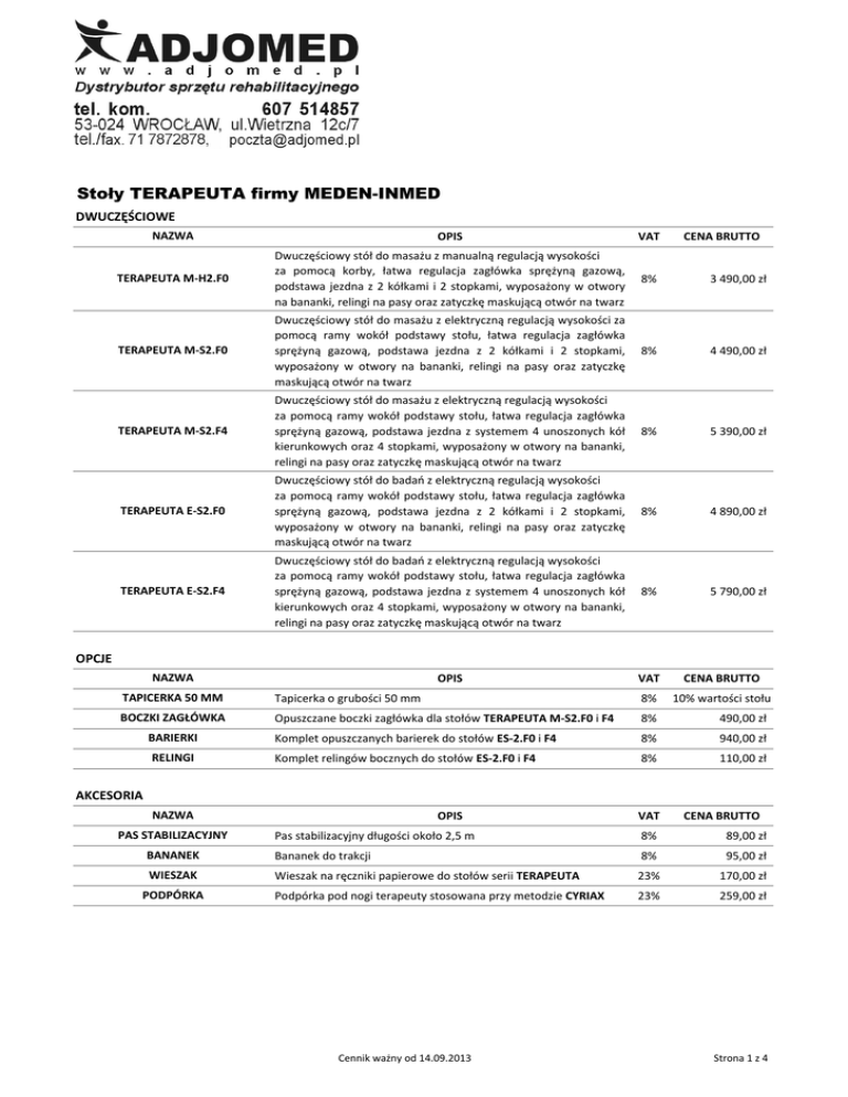 Stoły TERAPEUTA firmy MEDEN-INMED DWUCZĘŚCIOWE NAZWA OPIS VAT TERAPEUTA M-H2.F0 Dwuczęściowy stół do masażu z manualną regulacją wysokości za pomocą korby, łatwa regulacja zagłówka sprężyną gazową, podstawa jezdna z 2 kółkami i 2 stopkami, wyposażony w otwory na bananki, relingi na pasy oraz zatyczkę maskującą otwór na twarz 8% 3 490,00 zł TERAPEUTA M-S2.F0 Dwuczęściowy stół do masażu z elektryczną regulacją wysokości za pomocą ramy wokół podstawy stołu, łatwa regulacja zagłówka sprężyną gazową, podstawa jezdna z 2 kółkami i 2 stopkami, wyposażony w otwory na bananki, relingi na pasy oraz zatyczkę maskującą otwór na twarz 8% 4 490,00 zł TERAPEUTA M-S2.F4 Dwuczęściowy stół do masażu z elektryczną regulacją wysokości za pomocą ramy wokół podstawy stołu, łatwa regulacja zagłówka sprężyną gazową, podstawa jezdna z systemem 4 unoszonych kół kierunkowych oraz 4 stopkami, wyposażony w otwory na bananki, relingi na pasy oraz zatyczkę maskującą otwór na twarz 8% 5 390,00 zł TERAPEUTA E-S2.F0 Dwuczęściowy stół do badań z elektryczną regulacją wysokości za pomocą ramy wokół podstawy stołu, łatwa regulacja zagłówka sprężyną gazową, podstawa jezdna z 2 kółkami i 2 stopkami, wyposażony w otwory na bananki, relingi na pasy oraz zatyczkę maskującą otwór na twarz 8% 4 890,00 zł TERAPEUTA E-S2.F4 Dwuczęściowy stół do badań z elektryczną regulacją wysokości za pomocą ramy wokół podstawy stołu, łatwa regulacja zagłówka sprężyną gazową, podstawa jezdna z systemem 4 unoszonych kół kierunkowych oraz 4 stopkami, wyposażony w otwory na bananki, relingi na pasy oraz zatyczkę maskującą otwór na twarz 8% 5 790,00 zł OPIS CENA BRUTTO OPCJE NAZWA VAT CENA BRUTTO TAPICERKA 50 MM Tapicerka o grubości 50 mm 8% 10% wartości stołu BOCZKI ZAGŁÓWKA Opuszczane boczki zagłówka dla stołów TERAPEUTA M-S2.F0 i F4 8% 490,00 zł BARIERKI Komplet opuszczanych barierek do stołów ES-2.F0 i F4 8% 940,00 zł RELINGI Komplet relingów bocznych do stołów ES-2.F0 i F4 8% 110,00 zł AKCESORIA NAZWA PAS STABILIZACYJNY OPIS Pas stabilizacyjny długości około 2,5 m VAT 8% CENA BRUTTO 89,00 zł BANANEK Bananek do trakcji 8% 95,00 zł WIESZAK Wieszak na ręczniki papierowe do stołów serii TERAPEUTA 23% 170,00 zł Podpórka pod nogi terapeuty stosowana przy metodzie CYRIAX 23% 259,00 zł PODPÓRKA Cennik ważny od 14.09.2013 Strona 1 z 4 TRZYCZĘŚCIOWE NAZWA OPIS VAT TERAPEUTA M-S3.F0 Trzyczęściowy stół do masażu z elektryczną regulacją wysokości za pomocą ramy wokół podstawy stołu, łatwa regulacja zagłówka i podnóżka sprężyną gazową, podstawa jezdna z 2 kółkami i 2 stopkami, wyposażony w otwory na bananki, relingi na pasy oraz zatyczkę maskującą otwór na twarz 8% 5 090,00 zł TERAPEUTA M-S3.F4 Trzyczęściowy stół do masażu z elektryczną regulacją wysokości za pomocą ramy wokół podstawy stołu, łatwa regulacja zagłówka i podnóżka sprężyną gazową, podstawa jezdna z systemem 4 unoszonych kół kierunkowych oraz 4 stopkami, wyposażony w otwory na bananki, relingi na pasy oraz zatyczkę maskującą otwór na twarz 8% 5 990,00 zł TERAPEUTA M-P3.F0 Trzyczęściowy stół do masażu z elektryczną regulacją wysokości za pomocą ramy wokół podstawy stołu, dodatkowa opcja Pivota sterowanego elektrycznie, łatwa regulacja zagłówka i podnóżka sprężyną gazową, podstawa jezdna z 2 kółkami i 2 stopkami, wyposażony w otwory na bananki, relingi na pasy oraz zatyczkę maskującą otwór na twarz 8% 6 880,00 zł TERAPEUTA M-P3.F4 Trzyczęściowy stół do masażu z elektryczną regulacją wysokości za pomocą ramy wokół podstawy stołu, dodatkowa opcja Pivota sterowanego elektrycznie, łatwa regulacja zagłówka i podnóżka sprężyną gazową, podstawa jezdna z systemem 4 unoszonych kół kierunkowych oraz 4 stopkami, wyposażony w otwory na bananki, relingi na pasy oraz zatyczkę maskującą otwór na twarz 8% 7 780,00 zł NAZWA OPIS VAT CENA BRUTTO 8% 10% wartości stołu VAT CENA BRUTTO CENA BRUTTO OPCJE TAPICERKA 50 MM Tapicerka o grubości 50 mm AKCESORIA NAZWA PAS STABILIZACYJNY OPIS Pas stabilizacyjny długości około 2,5 m 8% 89,00 zł BANANEK Bananek do trakcji 8% 95,00 zł WIESZAK Wieszak na ręczniki papierowe do stołów serii TERAPEUTA 23% 170,00 zł Podpórka pod nogi terapeuty stosowana przy metodzie CYRIAX 23% 259,00 zł PODPÓRKA PIĘCIOCZĘŚCIOWE NAZWA OPIS VAT TERAPEUTA M-S5.F0 Pięcioczęściowy stół do masażu z elektryczną regulacją wysokości za pomocą ramy wokół podstawy stołu, łatwa regulacja zagłówka i podnóżka sprężyną gazową, podstawa jezdna z 2 kółkami i 2 stopkami, wyposażony w otwory na bananki, relingi na pasy oraz zatyczkę maskującą otwór na twarz 8% 5 580,00 zł TERAPEUTA M-S5.F4 Pięcioczęściowy stół do masażu z elektryczną regulacją wysokości za pomocą ramy wokół podstawy stołu, łatwa regulacja zagłówka i podnóżka sprężyną gazową, podstawa jezdna z systemem 4 unoszonych kół kierunkowych oraz 4 stopkami, wyposażony w otwory na bananki, relingi na pasy oraz zatyczkę maskującą otwór na twarz 8% 6 480,00 zł TERAPEUTA M-P5.F0 Pięcioczęściowy stół do masażu z elektryczną regulacją wysokości za pomocą ramy wokół podstawy stołu, dodatkowa opcja Pivota sterowanego elektrycznie, łatwa regulacja zagłówka i podnóżka sprężyną gazową, podstawa jezdna z 2 kółkami i 2 stopkami, wyposażony w otwory na bananki, relingi na pasy oraz zatyczkę maskującą otwór na twarz 8% 7 370,00 zł CENA BRUTTO Strona 2 z 4 TERAPEUTA M-P5.F4 Pięcioczęściowy stół do masażu z elektryczną regulacją wysokości za pomocą ramy wokół podstawy stołu, dodatkowa opcja Pivota sterowanego elektrycznie, łatwa regulacja zagłówka i podnóżka sprężyną gazową, podstawa jezdna z systemem 4 unoszonych kół kierunkowych oraz 4 stopkami, wyposażony w otwory na b