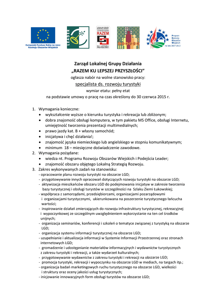 Zarząd Lokalnej Grupy Działania „RAZEM KU LEPSZEJ PRZYSZŁOŚCI” ogłasza nabór na wolne stanowisko pracy: specjalista ds. rozwoju turystyki wymiar etatu: pełny etat na podstawie umowy o pracę na czas określony do 30 czerwca 2015 r. 1. Wymagania konieczne: wykształcenie wyższe o kierunku turystyka i rekreacja lub zbliżonym; dobra znajomość obsługi komputera, w tym pakietu MS Office, obsługi Internetu, umiejętność tworzenia prezentacji multimedialnych; prawo jazdy kat. B + własny samochód; inicjatywa i chęć działania!; znajomość języka niemieckiego lub angielskiego w stopniu komunikatywnym; minimum 18 – miesięczne doświadczenie zawodowe. 2. Wymagania pożądane: wiedza nt. Programu Rozwoju Obszarów Wiejskich i Podejścia Leader; znajomość obszaru objętego Lokalną Strategią Rozwoju. 3. Zakres wykonywanych zadań na stanowisku: ‐ opracowanie planu rozwoju turystyki na obszarze LGD; ‐ przygotowywanie innych opracowań dotyczących rozwoju turystyki na obszarze LGD; ‐ aktywizacja mieszkańców obszaru LGD do podejmowania inicjatyw w zakresie tworzenia bazy turystycznej i obsługi turystów w szczególności na Szlaku Ziemi Łukowskiej; ‐ współpraca z samorządami, przedsiębiorcami, organizacjami pozarządowymi i organizacjami turystycznymi, ukierunkowana na poszerzenie turystycznego łańcucha wartości; ‐ inspirowanie działań zmierzających do rozwoju infrastruktury turystycznej, rekreacyjnej i wypoczynkowej ze szczególnym uwzględnieniem wykorzystanie na ten cel środków unijnych; ‐ organizacja seminariów, konferencji i szkoleń o tematyce związanej z turystyką na obszarze LGD; ‐ organizacja systemu informacji turystycznej na obszarze LGD; ‐ uzupełnianie i aktualizacja informacji w Systemie Informacji Przestrzennej oraz stronach internetowych LGD; ‐ gromadzenie i udostępnianie materiałów informacyjnych i wydawnictw turystycznych z zakresu turystyki i rekreacji, a także wydarzeń kulturalnych; ‐ przygotowywanie wydawnictw z zakresu turystyki i rekreacji na obszarze LGD; ‐ promocja turystyki, rekreacji i wypoczynku na obszarze LGD w mediach, na targach itp.; ‐ organizacja badań marketingowych ruchu turystycznego na obszarze LGD, wielkości i struktury oraz oceny jakości usług turystycznych; ‐ inicjowanie innowacyjnych form obsługi turystów na obszarze LGD; ‐ przygotowanie programów i organizacja pobytu grup studyjnych na obszarze LGD. 4. Wymagane dokumenty: list motywacyjny życiorys – curriculum vitae kwestionariusz osobowy kserokopia dowodu osobistego kserokopie dokumentów potwierdzających wykształcenie kserokopie zaświadczeń o ukończonych kursach, szkoleniach itp. oświadczenie kandydata o korzystaniu z pełni praw publicznych i o niekaralności za przestępstwa popełnione umyślnie. Wymagane dokumenty aplikacyjne należy składać osobiście w siedzibie Lokalnej Grupy Działania „RAZEM KU LEPSZEJ PRZYSZŁOŚCI” ul. Świderska 12, 21‐400 Łuków lub pocztą listem poleconym na adres: Lokalna Grupa Działania „RAZEM KU LEPSZEJ PRZYSZŁOŚCI” ul. Świderska 12, 21‐400 Łuków, z dopiskiem „Nabór na wolne stanowisko”, w terminie do dnia 25 marca 2014 r.. Dodatkowe informacje: tel. 25 7983194. Aplikacje, które wpłyną do LGD po wyżej określonym terminie nie będą rozpatrywane. Informacja o wynikach naboru będzie umieszczona na stronie internetowej www.lgdrazem.pl w zakładce ogłoszenia oraz na tablicy ogłoszeń w siedzibie Lokalnej Grupy Działania, ul. Świderska 12, 21‐400 Łuków. Wymagane dokumenty aplikacyjne: list motywacyjny, CV powinny być opatrzone klauzulą: „Wyrażam zgodę na przetwarzanie moich danych osobowych zawartych w ofercie pracy dla potrzeb niezbędnych do realizacji procesu rekrutacji zgodnie z ustawą z dnia 29 sierpnia 1997 r. o ochronie danych osobowych (Dz. U. z 2002 r., Nr 101, poz. 926 z późn. zm.).