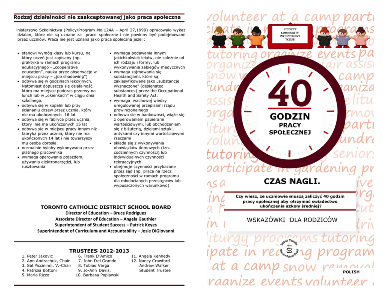Rodzaj działalności nie zaakceptowanej jako praca społeczna STUDENT COMMUNITY INVOLVEMENT TCDSB inisterstwo Szkolnictwa (Policy/Program No.124A – April 27,1999) opracowało wykaz które nie są uznane za prace społeczne i nie powinny być podejmowane działań, przez uczniów. Praca nie jest uznana jako praca społeczna jeżeli: • stanowi wymóg klasy lub kursu, na • wymaga podawania innym który uczeń jest zapisany (np. jakichkolwiek leków, nie zależnie od praktyka w ramach programu ich rodzaju i formy, lub edukacyjnego - „cooperative wykonywania zabiegów medycznych education”, nauka przez obserwacje w • wymaga zajmowania się miejscu pracy – „job shadowing”) substancjami, które są • odbywa się w godzinach lekcyjnych. zaklasyfikowane jako „substancje Natomiast dopuszcza się działalność, wyznaczone” (designated która ma miejsce podczas przerwy na substances) przez the Occupational lunch lub w „okienkach” w ciągu dnia Health and Safety Act. szkolnego. • wymaga wachowej wiedzy • odbywa się w kopalni lub przy uregulowanej przepisami rządu ściananiu drzew przez ucznia, który prowincjonalnego • odbywa sie w bankowości, wiąże się nie ma ukończonych 16 lat • odbywa się w fabryce przez ucznia, z operowaniem papierami ktory nie ma ukończonych 15 lat wartościowymi, lub obchodzeniem się z biżuterią, dziełami sztuki, • odbywa sie w miejscu pracy innym niż fabryka przez ucznia, który nie ma antykami czy innymi wartościowymi ukończonych 14 lat i nie towarzyszy rzeczami • składa się z wykonywania mu osoba dorosła. normalnie byłaby wykonywana przez obowiązków domowych (tzn. • płatnego pracownika codziennych czynności) lub • wymaga operowania pojazdem, indywidualnych czynności używania elektronarzędzi, lub rekraacyjnych rusztowania • obejmuje czynności przykazane przez sąd (np. praca na rzecz społeczności w ramach programu dla młodocianych przestępców lub wypuszczonych warunkowo) TORONTO CATHOLIC DISTRICT SCHOOL BOARD Director of Education – Bruce Rodrigues Associate Director of Education – Angela Gauthier Superintendent of Student Success – Patrick Keyes Superintendent of Curriculum and Accountability – Josie DiGiovanni GODZIN PRACY SPOŁECZNEJ CZAS NAGLI. Czy wiesz, że uczniowie muszą zaliczyć 40 godzin pracy społecznej aby otrzymać swiadectwo ukończenia szkoły średniej? WSKAZÓWKI DLA RODZICÓW TRUSTEES 2012-2013 1. 2. 3. 4. 5. Peter Jakovic Ann Andrachuk, Chair Sal Piccininni, V.-Chair Patrizia Bottoni Maria Rizzo 6. Frank D’Amico 7. John Del Grande 8. Tobias Verga 9. Jo-Ann Davis, 10. Barbara Poplawski 11. Angela Kennedy 12. Nancy Crawford Andrew Walker Student Trustee POLISH Ogólna informacja i cel Zgodnie z wymaganiami określonymi w dokumencie „Ontario Secondary Schools, Grade 9 to 12: Program and Diploma Requirements, 1999 (OSS)”, każdy uczeń, który rozpoczął naukę w szkole średniej w roku szkolnym 1999/2000 lub póżniej, ma obowiązek zaliczenia przynajmniej 40 godzin pracy na rzecz społeczności jako jednego z warunków uzyskania dyplomu ukończenia szkoły średniej (OSSD). Zmierzamy ku temu by nasi uczniowie byli uformowani w wierze katolickiej, dążyli osiągnięcia jak najlepszych wyników w nauce, wykazywali zrozumienie do perspektywy globalnej i odpowiedzialności społecznej. Wytyczne • • • • • • Począwszy od lipca 2011 każdy uczeń może zacząć pracować społecznie już w miesiącach letnich poprzedzających rozpoczęcie 9 klasy. Zajęcia wykonywane w ramach pracy społecznej nie mogą być częścią kursu kredytowego (credit course). Uczeń nie może otrzymywać wynagrodzenia. „Wolontariat ” nie koniecznie znaczy „działalność na rzecz społeczności „ Uczniowie nie stają się wolontariuszami w zakładach pracy przez to, że pracują tam „za darmo” W miarę wykonywania pracy społecznej uczniowie są zobowiązani do dostarczania aktualnych świadectw potwierdzających jej zakończenie Od czego zacząć • Przejrzyj wraz z Twoim nastolatkiem poniższy wykaz działalności uznanych i nie uznanych za prace społeczne i zorientuj się co może zainteresować Twoje dziecko. • Odwiedzając strony internetowe www.40hours.ca i www.volunteertoronto.ca , dowiedz się jaka działalność społeczna jest dostępna na terenie Toronto (GTA) • Sprawdz inne zródła. Dobrze jest zacząć od broszury (Zaangażowanie ucznia w dzialalność na rzecz społeczności) Student Community Involvement, która jest dostępna na stronie www.tcdsb.org>Students>Community Involvement>Community Involvement Information>Community Involvement Activity Form • Uczniowie lub rodzice mogą wydrukować tyle egzemplarzy formularza Activity Form ile potrzeba. Uczniowie powinni zrobić kopię formularza przed dostarczeniem go do szkoły. • „W miarę wykonywania pracy społecznej uczniowie są zobowiązani do dostraczania aktualnych świadectw potwierdzających jej zakończenie.” USILNIE ZALECA SIĘ ABY UCZNIOWIE ZACZĘLI ODBYWAĆ 40 GODZINNĄ PRACĘ SPOŁECZNĄ JAK NAJSZYBCIEJ. Rodzaj działalności uznanej za pracę społeczną Następująca lista zawiera przykłady prac społecznych które, jeżeli są zgodne z obowiązującymi założeniami oraz odpowiadają standardom etycznym, mogą być brane pod uwagę: • Zbieranie funduszy (fundraising) – obejmuje pozyskiwanie donatorów i asystowanie przy organizowaniu imprez charytatywnych takich jak marsze (walkethon), rozgrywki z udziałem znanych osób, gale, kiermasze • Sport/rekreacja – obejmuje trenowanie, pomoc na pływalniach, w organizowaniu turniejów, imprez sportowych, letnich rozgrywek, zawodów lekkoatletycznych lub wolontariat jako „leisure buddy” • Imprezy środowiskowe (community events) – obejmują pomoc w organizowaniu karanawałów zimowych, pochodów i letnich targów • Projekty wspólnotowe (community projects) – obejmują branie udziału w zorganizowanej zbiórce 