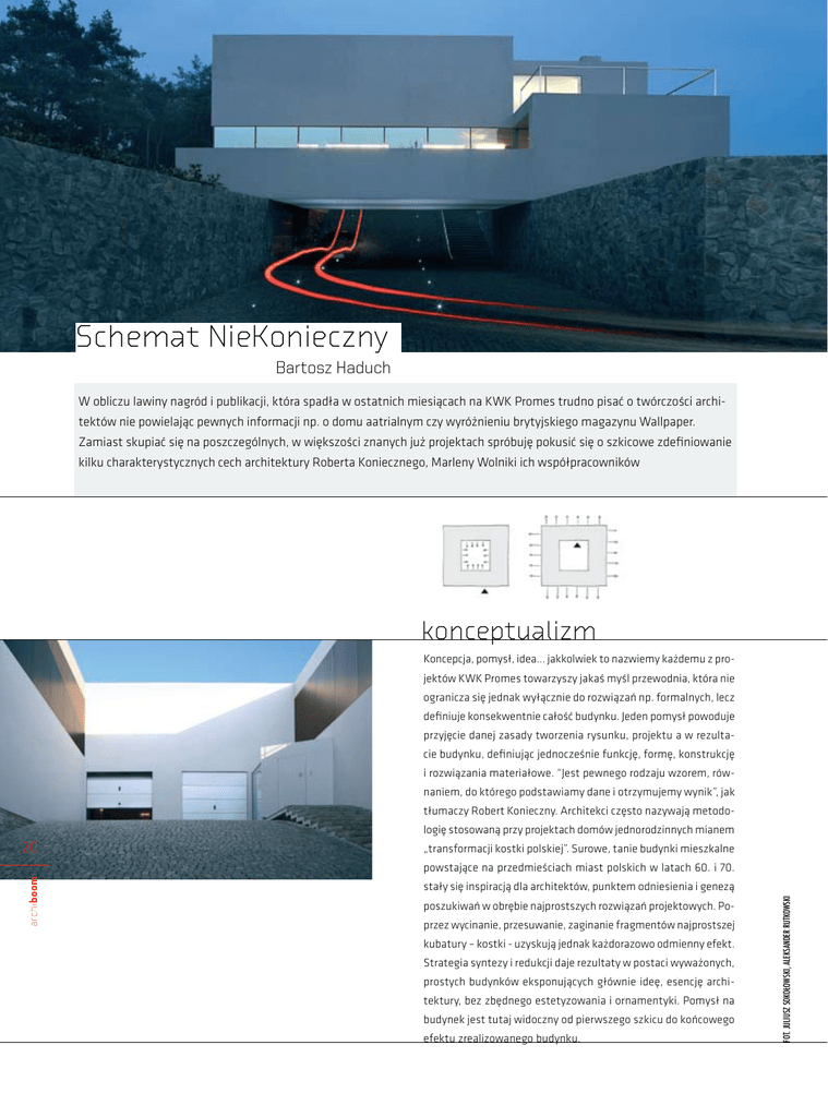 Schemat NieKonieczny Bartosz Haduch W obliczu lawiny nagród i publikacji, która spadła w ostatnich miesiącach na KWK Promes trudno pisać o twórczości architektów nie powielając pewnych informacji np. o domu aatrialnym czy wyróżnieniu brytyjskiego magazynu Wallpaper. Zamiast skupiać się na poszczególnych, w większości znanych już projektach spróbuję pokusić się o szkicowe zdefiniowanie kilku charakterystycznych cech architektury Roberta Koniecznego, Marleny Wolniki ich współpracowników konceptualizm Koncepcja, pomysł, idea... jakkolwiek to nazwiemy każdemu z projektów KWK Promes towarzyszy jakaś myśl przewodnia, która nie ogranicza się jednak wyłącznie do rozwiązań np. formalnych, lecz definiuje konsekwentnie całość budynku. Jeden pomysł powoduje przyjęcie danej zasady tworzenia rysunku, projektu a w rezultacie budynku, definiując jednocześnie funkcję, formę, konstrukcję i rozwiązania materiałowe. “Jest pewnego rodzaju wzorem, równaniem, do którego podstawiamy dane i otrzymujemy wynik”, jak tłumaczy Robert Konieczny. Architekci często nazywają metodologię stosowaną przy projektach domów jednorodzinnych mianem „transformacji kostki polskiej”. Surowe, tanie budynki mieszkalne powstające na przedmieściach miast polskich w latach 60. i 70. stały się inspiracją dla architektów, punktem odniesienia i genezą poszukiwań w obrębie najprostszych rozwiązań projektowych. Poprzez wycinanie, przesuwanie, zaginanie fragmentów najprostszej kubatury – kostki - uzyskują jednak każdorazowo odmienny efekt. Strategia syntezy i redukcji daje rezultaty w postaci wyważonych, prostych budynków eksponujących głównie ideę, esencję architektury, bez zbędnego estetyzowania i ornamentyki. Pomysł na budynek jest tutaj widoczny od pierwszego szkicu do końcowego efektu zrealizowanego budynku. FOT. JULIUSZ SOKOŁOWSKI, ALEKSANDER RUTKOWSKI 20 za lub przeciw topografii Pierwszy z obrazków towarzyszących prezentacjom domów autorstwa KWK Promes przedstawia zazwyczaj działkę, jej dyspozycję przestrzenną względem stron świata i dojście/dojazd do budynku. Sposób poruszania się na działce i w budynku staje się często leitmotivem projektów KWK Promes (dom aatrialny, dom z ziemi śląskiej). KWK PROMES Architekci czasem wykorzystują ukształtowanie terenu dla płynnego wkomponowania budynku w otoczenie (dom ślimak), czy też częściowego ukrycia obiektu (jeden z najnowszych projektów - dom na Dolnym Śląsku), a czasem ingerują radykalnie w topografię, na przykład podnosząc poziom całego ogrodu przed domem aatrialnym, przy wykorzystaniu ton ziemi z pobliskiej budowy autostrady. Szkody górnicze z możliwością wystąpienia uskoków tektonicznych na terenie lokalizacji domu z ziemi śląskiej stały się inspiracją dla koncepcji domu wyrastającego płynnie z terenu, niczym twór geologiczny powstały na wskutek wypiętrzenia topograficznego. Z kolei projekt konkursowy na tzw. “Dom, w którym pragniemy zamieszkać” zakładał obiekt fragmentarycznie nadwieszony nad terenem, co umożliwiało swobodny przepływ JULIUSZ SOKOŁOWSKI wód opadowych z okolicznych parceli wzdłuż stromego stoku. powiekszenie (zoom in - zoom out) W kilku projektach KWK Promes eksperymentują z modyfikowaniem i przesuwaniem poszczególnych ścian (czasem poruszanych automatycznie, jak w domu bezpiecznym) lub całych części budynków (“szuflady” wysunięte z prostej formy domu otwartego), czego rezultatem jest zmiana kubatury obiektów, powiększenie (otwieranie i zamykanie) przestrzeni i zapewnienie większego kontaktu z otoczeniem, ewentualnie odizolowania. Dzięki wymienionym zabiegom budynki KWK Promes często wydają się większe niż są w rzeczywistości, a granice między wnętrzem a zewnętrzem zostają zatarte (np. dom otwarty, dom bezpieczny, dom z kapsułą, dom trójkątny). iluzje optyczne Architekci czasem próbują zmylić zmysły obserwatora poprzez specyficzne zastosowanie materiałów i wykorzystanie światła oraz zjawisk optycznych. W projekcie konkursowym Świątyni Opatrzności Bożej w Warszawie wykorzystali zjawisko rozszczepiania światła - pryzmatu. Z kolei w projektach domów jednorodzinnych 21 zaskakują doborem materiałów. Najnowszy dom na Dolnym Śląsku od strony podjazdu jest prawie zupełnie niewidoczny. Dostęp do wnętrza jest możliwy dopiero po automatycznym otwarciu fragmentu trawnika (!) maskującego cały dach budynku ukrytego w terenie. W Domu z kapsułą przestrzeń niewielkiej kuchni została optycznie powiększona dzięki zastosowaniu płaszczyzn z polerowanej blachy. Ściany domu aatrialnego wyglądają jakby były wykonane z najwyższej jakości betonu architektonicznego, w rzeczywistości są one jednak obłożone specjalnymi płytami powierzchnię. We wnętrzach, z pozoru płaskie ściany z hebanu kryją cały system szaf, schodków i drzwi, a za olbrzymim lustrem w sypialni kryje się wyjście na taras z pięknym widokiem. KWK PROMES i pokryte jednolitą szarą masą szpachlową, co daje w rezultacie perfekcyjnie gładką ARCHIWUM KWK PROMES Przypadek? Nawet w racjonalnej i przewidywalnej metodzie projektowej znajdzie się miejsce na ... przypadek, który w projektach KWK Promes często pełni rolę decydującą. W pierwszej, pośpiesznie rysowanej koncepcji domu z ziemi śląskiej, architekci zapomnieli o spocznikach na krawędziach pochylni. Po uzupełnieniu brakujących elementów bryła budynku straciła sporo z pierwotnego wyrazu. Dogłębne studia nad tematem zaowocowały prototypowym projektem bezspocznikowej pochylni, możliwej dzięki przegięciu płaszczyzny biegu. Przy projektowaniu domu aatrialnego architekci chcieli wykonać szybki model roboczy z papieru. Okazało się, że praktycznie cały projekt można zapisać na pojedynczym arkuszu, poprzez wyginanie i wycinanie kartki, definiując jednocześnie rozwiązania strukturalne i materiałowe. Rok 2007 wydaje się by