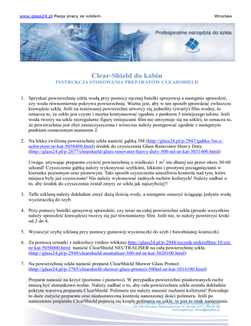 www.glass24.pl Pasja pracy ze szkłem. Wrocław Clear-Shield do kabin INSTRUKCJA STOSOWANIA PREPARATÓW CLEARSHIELD 1. Spryskać powierzchnię szkła wodą przy pomocy ręcznej butelki sprayowej a następnie sprawdzić, czy woda równomiernie pokrywa powierzchnię. Ważne jest, aby w ten sposób sprawdzać zwłaszcza krawędzie szkła. Jeśli na testowanej powierzchni utworzy się jednolity (zwarty) film wodny, to oznacza to, że szkło jest czyste i można kontynuować zgodnie z punktem 5 niniejszego tekstu. Jeśli woda tworzy na szkle nieregularne figury (miejscami film nie utrzymuje się na szkle), to oznacza to, że powierzchnia jest zbyt zanieczyszczona i wówczas należy postępować zgodnie z następnym punktem oznaczonym numerem 2. 2. Na lekko zwilżoną powierzchnię szkła nanieść gąbką 3M (http://glass24.pl/p-2947/gabka-3m-zuchwytem-nr-kat-5058400.html) środek do czyszczenia Glass Renovator Heavy Duty. (http://glass24.pl/p-2677/clearshield-glass-renovator-heavy-duty-500-ml-nr-kat-3031400.html) Uwaga: używając preparatu czyścić powierzchnię o wielkości 1 m2 nie dłużej niż przez okres 30-60 sekund! Czyszczenie gąbką należy wykonywać szybkimi, lekkimi i prostymi pociągnięciami w kierunku poziomym oraz pionowym. Taki sposób czyszczenia umożliwia kontrolę nad tym, które miejsca były już czyszczone! Nie należy wykonywać żadnych ruchów kolistych! Należy zadbać o to, aby środek do czyszczenia został zmyty ze szkła jak najszybciej!! 3. Tafle szklaną należy dokładnie zmyć dużą ilością wody, a następnie osuszyć ściągając jedynie wodę wycieraczką do szyb. 4. Przy pomocy butelki sprayowej sprawdzić, czy teraz na całej powierzchni szkła (przede wszystkim należy sprawdzić krawędzie) tworzy się już równomierny film. Jeśli nie, to należy powtórzyć kroki od 2 do 4. 5. Wysuszyć szybę szklaną przy pomocy gumowej wycieraczki do szyb i bawełnianej ściereczki. 6. Za pomocą szmatki z mikrofazy (mikro włókna) http://glass24.pl/p-2948/recznik-mikrofibra-10-sztnr-kat-5056000.html nanieść ClearShield NEUTRALISER na całą powierzchnię szkła. (http://glass24.pl/p-2949/clearshield-neutraliser-500-ml-nr-kat-3020100.html) 7. Na powierzchnię szkła nanieść preparat ClearShield Shower Glass Protect. (http://glass24.pl/p-2785/clearshield-shower-glass-prtotect-500ml-nr-kat-1014100.html) Preparat nanosić na krzyż (poziomo i pionowo). W przypadku powierzchni piaskowanych ruchy muszą być stosunkowo wolne. Należy zadbać o to, aby cała powierzchnia szkła została dokładnie pokryta warstwą preparatu ClearShield. Polimeru nie należy nanosić ruchami kolistymi! Powoduje to duże zużycie preparatu oraz niedostateczną kontrolę nanoszonej ilości polimeru. Jeśli po naniesieniu preparatu ClearShield pojawią się krople polimeru na szkle, to jest to znak naniesienia www.glass24.pl Pasja pracy ze szkłem. Wrocław zbyt dużej ilości preparatu. W takim przypadku należy nanosić polimer szybciej. Zalecane są dwa sposoby postępowania podczas nanoszenia preparatu ClearShield a) nanieść preparat ClearShield Shower Glass Protect (http://glass24.pl/p-2785/clearshield-showerglass-prtotect-500ml-nr-kat-1014100.html) najpierw w jednym kierunku, po czym pozostawić go do wyschnięcia przez okres od 5 do 10 minut, następnie nadmiar polimeru na powierzchni szkła zetrzeć bawełnianą szmatką wychodząc poza jego krawędzie, po czym nanieść na krzyż drugą warstwę. b) nanieść preparat ClearShield Shower Glass Protect (http://glass24.pl/p-2785/clearshield-showerglass-prtotect-500ml-nr-kat-1014100.html) najpierw w jednym kierunku na całą powierzchnię, a następnie nie robiąc przerwy, natychmiast, nanieść preparat również w drugim kierunku. Wydajność 1 litra = około 45 m2 przy nanoszeniu maszynowym 8. Naniesiony preparat pozostawić do wyschnięcia przez okres 20 minut (przy 18°C). Twardnienie preparatu jest uzależnione od temperatury oraz wilgotności powietrza. Im temperatura jest wyższa a wilgotność niższa, tym szybsze schnięcie. W celu przyśpieszenia schnięcia można wykorzystać suszarkę do włosów. Wówczas czas twardnienia ulegnie skróceniu do około 2 minut. 9. Przed ostatecznym zmyciem nadmiaru polimeru zaleca się wypróbowanie na jednym z dolnych rogów tafli szklanej, czy polimer stwardniał. Po spryskaniu testowanej powierzchni wodą muszą się tworzyć kuleczki wody! W przeciwnym przypadku, tzn. jeśli kuleczki nie tworzą się w ogóle, lub jeśli można zauważyć, że woda formuje się w kształt kropelek lub tworzy się jednolity film, to oznacza, że twardnienie nie jest zakończone i szkło nie może zostać jeszcze zmyte. W takim przypadku należy osuszyć testowaną powierzchnię, po czym ponownie nanieść na nią preparat ClearShield Shower Glass Protect (http://glass24.pl/p-2785/clearshield-shower-glass-prtotect500ml-nr-kat-1014100.html) 10. Usunąć nadmiar polimeru. Odmierzyć środek do czyszczenia ClearShield CLEAN ALL http://glass24.pl/p-2674/clearshield-clean-all-500-ml-nr-kat-4020500.html w ilości odpowiadającej jednej zakrętce, po czym rozmieszać go w 5 litrach ciepłej wody. Dokładnie zmyć nadmiar polimeru przy pomocy gąbki do mycia lub szmatki polarowej, następnie zetrzeć wycieraczką i wytrzeć bawełnianą szmatką lub ścierką z mikrofazy (mikrowłókna). 11. Spryskując wodą sprawdzić, czy tworzą się kuleczki wody na całej powierzchni szkła. Jeśli tak, to jest to dowód na to, że preparat Clear-Shield Shower Glass Protect został naniesiony równomiernie. Jeśli nie, to należy powtórzyć całe postępowanie opisane powyżej począwszy od punktu nr 2 aż do punktu nr 12. Jeśli na początku procesu nanoszenia, tafla szklana była czysta, to wystarczy powtórzyć postępowanie opisane w punktach od 5 do 12. www.glass24.pl Pasja pracy ze szkłem. Wrocław