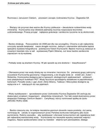 Królowa jest tylko jedna Rozmowa z Januszem Ciskiem, prezesem zarządu Uzdrowiska Krynica - Żegiestów SA - Bieżący rok przynosi dwa ważne dla Krynicy jubileusze – dwustulecie rozlewnictwa wody mineralnej Kryniczanka oraz dwieście piętnastą rocznicę rozpoczęcia lecznictwa uzdrowiskowego. Proszę przyjąć najlepsze gratulacje i serdeczne życzenia na tę okoliczność. - Bardzo dziękuję. Rzeczywiście rok 2008 jest dla nas szczególny. Chcemy w jak najbardziej uroczysty sposób świętować nasze okrągłe rocznice. Jednym z elementów obchodów będzie specjalna wystawa fotograficzna poświęcona historii Kryniczanki. Będzie można ją zobaczyć w czwartym kwartale roku w sali wystawowej Pijalni Głównej. Już teraz bardzo serdecznie zapraszam na tę wystawę. - Pokłady wody są skarbem Krynicy. W jaki sposób są one dzielone i klasyfikowane? - Oferowane przez nas wody dzielą się na mineralne i lecznicze. Do pierwszej grupy zaliczymy oczywiście Kryniczankę gazowaną i niegazowaną, a do drugiej wody ze źródeł Jan, Zuber i Słotwinka. Kryniczanka dostępna jest w typowych, ekologicznych opakowaniach szklanych oraz plastykowych butelkach PET. Wody lecznicze sprzedajemy dodatkowo w pięciolitrowych kartonach. Ponadto wody z ujęć Józef, Zdrój Główny, Tadeusz i Mieczysław dostępne są wyłącznie w 4 należących do nas pijalniach. - Wody wydobywane i sprzedawane przez Uzdrowisko Krynica-Żegiestów SA cechują się doskonałym smakiem i bogactwem składników mineralnych. Ten fakt został dostrzeżony przez ekspertów Polskiego Centrum Badań i Certyfikacji, którzy nominowali spółkę do tytułu JAKOŚĆ ROKU 2008. - Bardzo cieszymy się, że kolejne niezależne gremium doceniło nasze produkty. Już samą nominację do udziału w organizowanym przez Państwa konkursie traktujemy jako duże wyróżnienie. Robimy wszystko, aby wydobywać i oferować konsumentom jak największą ilość jak najbardziej wartościowej wody. Kryniczanka ma niezwykle wysoką zawartość wapnia i magnezu. Nasze społeczeństwo cierpi na niedobór właśnie tych pierwiastków, dlatego 1/3 Królowa jest tylko jedna powinno uzupełniać je w najprostszy i najbardziej naturalny sposób, poprzez picie wody. Jakość naszych wyrobów i stosowane metody pracy potwierdza wdrożony w spółce system HACCP. Nad jakością i właściwościami rozlewanych wód czuwa co dnia wewnątrzzakładowe laboratorium mikrobiologiczne oraz Uzdrowiskowy Zakład Górniczy. - Kryniczanka jest doskonale znana na terenie całego kraju. W jaki sposób jest dystrybuowana? - Nasz dział handlowy dba o jak największą dostępność Kryniczanki i wód leczniczych. Mamy podpisane umowy sprzedaży z sieciami hipermarketów: Tesco, Carrefour, Auchan czy Makro Cash & Carry oraz mniejszymi sieciami typu Eurocash, Kaufland, Selgros. Ponadto dystrybuujemy nasze produkty w oparciu o współpracę z prywatnymi hurtowniami. W promieniu 100 km od Krynicy prowadzimy również tzw. van-selling, dostarczając wodę bezpośrednio do detalicznych punktów sprzedaży. Dzięki tak szerokiej gamie stosowanych narzędzi sprzedażowych nasza woda jest dobrze znana zarówno w regionie, jak i w całym kraju. - Ale nie tylko, bo królowa polskich wód zawitała także poza jego granice. - Zgadza się. Regularnie dostarczamy Kryniczankę na kontynent amerykański do Stanów Zjednoczonych i Kanady. Zdarzają się również wysyłki do Australii i Irlandii. Nasza woda zaznaczyła swoją obecność także na Ukrainie i w Kuwejcie. - Jakie plany ma przed sobą Kryniczanka zamykająca dwustuletni etap dotychczasowego działania? - Przede wszystkim będziemy dbać o utrzymanie stałego wysokiego woluminu sprzedaży. W roku jubileuszowym rozlejemy 16,1 mln litrów wód, w tym 13 mln litrów Kryniczanki. Wkładamy maksimum zaangażowania w promocję naszej marki, aby tak wielka ilość produktów znalazła nabywców. Ponadto myślimy o inwestycjach w infrastrukturę zakładu. Aby odciążyć centrum Krynicy-Zdrój, w którym znajdują się linie rozlewnicze, planujemy przenieść je na obrzeża miasta. Docelowo zamierzamy również rozbudować zakład produkcyjny, a tym samym zwiększyć moce produkcyjne. 2/3 Królowa jest tylko jedna Dziękuję za rozmowę. 3/3