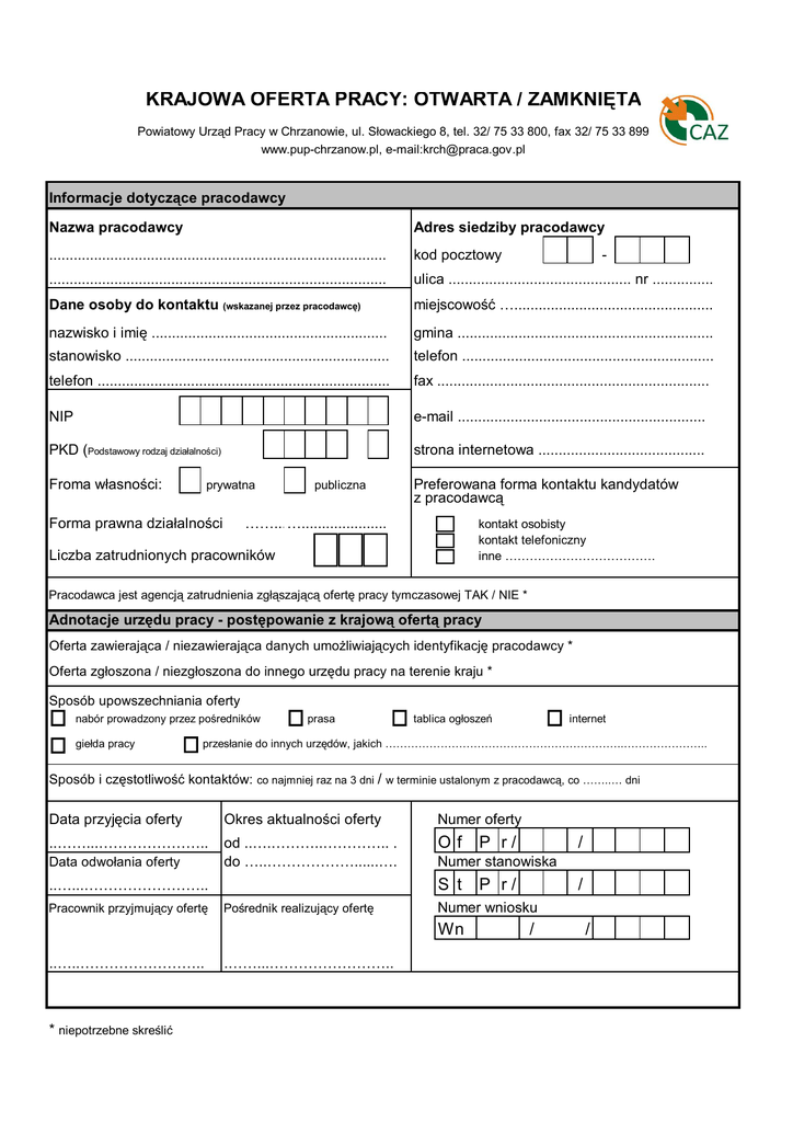 KRAJOWA OFERTA PRACY: OTWARTA / ZAMKNIĘTA Powiatowy Urząd Pracy w Chrzanowie, ul. Słowackiego 8, tel. 32/ 75 33 800, fax 32/ 75 33 899 www.pup-chrzanow.pl, e-mail:[email protected] Informacje dotyczące pracodawcy Nazwa pracodawcy Adres siedziby pracodawcy ................................................................................... kod pocztowy ................................................................................... ulica ............................................. nr ............... Dane osoby do kontaktu (wskazanej przez pracodawcę) miejscowość …................................................. nazwisko i imię .......................................................... gmina ............................................................... stanowisko ................................................................. telefon .............................................................. telefon ........................................................................ fax ................................................................... NIP e-mail ............................................................. PKD (Podstawowy rodzaj działalności) strona internetowa ......................................... Froma własności: prywatna Forma prawna działalności publiczna - Preferowana forma kontaktu kandydatów z pracodawcą ……..................................... …..................... kontakt osobisty kontakt telefoniczny inne ………………………………. Liczba zatrudnionych pracowników Pracodawca jest agencją zatrudnienia zgłąszającą ofertę pracy tymczasowej TAK / NIE * Adnotacje urzędu pracy - postępowanie z krajową ofertą pracy Oferta zawierająca / niezawierająca danych umożliwiających identyfikację pracodawcy * Oferta zgłoszona / niezgłoszona do innego urzędu pracy na terenie kraju * Sposób upowszechniania oferty nabór prowadzony przez pośredników giełda pracy prasa tablica ogłoszeń internet przesłanie do innych urzędów, jakich ………………………………………………………..………………….. Sposób i częstotliwość kontaktów: co najmniej raz na 3 dni / w terminie ustalonym z pracodawcą, co ……..… dni Data przyjęcia oferty Okres aktualności oferty Numer oferty ..……...………………….. od ..….………..………….. . do …..………………......…. Numer stanowiska Data odwołania oferty S t ..…...…………………….. Pracownik przyjmujący ofertę Of Pośrednik realizujący ofertę * niepotrzebne skreślić .……...…………………….. / P r/ / Numer wniosku Wn ..…..…………………….. P r/ / / Informacje dotyczące krajowej oferty pracy Nazwa stanowiska Nazwa zawodu ............................................. ............................................. w tym dla osób niepełnosprawnych ............................................. ............................................. Kod zawodu Adres miejsca Liczba wolnych miejsc pracy Wnioskowana liczba kandydatów Wymiar czasu pracy …...………………………. ............................................. Zmianowość ................................... wykonywania pracy (praca w godzinach) ............................................. jednozmianowa trzy zmiany dwie zmiany ruch ciągły inne (jakie?) ............................................ Rodzaj umowy na czas nieokreślony umowa zlecenie na czas określony umowa o dzieło Wysokość wynagrodzenia .............................. na okres próbny umowa agencyjna System wynagrodzenia na zastępstwo akordowy (kwota brutto) prowizyjny czasowy umowa o pracę tymczasową (agencja zatrudnienia) Data rozpoczęcia zatrudnienia ......................... inne .............................................. Okres zatrudnienia ........................................... (w przypadku umowy o pracę) Wymagania - oczekiwania pracodawcy wobec kandydatów poziom wykształcenia …............................................. znajomość języków obcych …............................................. język ............................ w stopniu …............................. …............................................. język ............................ w stopniu …...…....................... kierunek/specjalność doświadczenie zawodowe uprawnienia / umiejętności ...................................... Ogólny zakres obowiązków .................................................................................... ............................................................................... …................................................................................ ............................................................................... …................................................................................ ............................................................................... Proponowany zasięg upowszechnienia Krajowej Oferty Pracy: Polska państwa UE/EOG Wymagania uzupełniające dla obywateli UE/EOG poziom znajomości języka polskiego …………………………...………………………………………………...……………………. rodzaj dokumentów wymaganych przez pracodawcę ……………………...………………………………………………….………. język, w jakim należy składać dokumenty ……………...………………………………………..…………………………………….. pracodawca zapewnia zakwaterowanie TAK / NIE * na koszt pracownika/pracodawcy * pracodawca zapewnia wyżywienie TAK / NIE * na koszt pracownika/pracodawcy * pracodawca sfinansuje lub dofinansuje koszty podróży lub przeprowadzki TAK / NIE *, warunki ….…...………………....…… ...….……………………………………………………………………………………………………………….. przyczyny wykonywania pracy