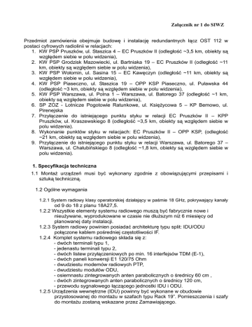Załącznik nr 1 do SIWZ Przedmiot zamówienia obejmuje budowę i instalację redundantnych łącz OST 112 w postaci cyfrowych radiolinii w relacjach: 1. KW PSP Pruszków, ul. Staszica 4 – EC Pruszków II (odległość ~3,5 km, obiekty są względem siebie w polu widzenia), 2. KW PSP Grodzisk Mazowiecki, ul. Bartniaka 19 – EC Pruszków II (odległość ~11 km, obiekty są względem siebie w polu widzenia), 3. KW PSP Wołomin, ul. Sasina 15 – EC Kawęczyn (odległość ~11 km, obiekty są względem siebie w polu widzenia), 4. KW PSP Piaseczno, ul. Staszica 19 – OPP KSP Piaseczno, ul. Puławska 44 (odległość ~3 km, obiekty są względem siebie w polu widzenia), 5. KW PSP Warszawa, ul. Polna 1 – Warszawa, ul. Batorego 37 (odległość ~1 km, obiekty są względem siebie w polu widzenia), 6. SP ZOZ - Lotnicze Pogotowie Ratunkowe, ul. KsięŜycowa 5 – KP Bemowo, ul. Pirenejska 7. Przyłączenie do istniejącego punktu styku w relacji EC Pruszków II – KPP Pruszków, ul. Kraszewskiego 8 (odległość ~3,5 km, obiekty są względem siebie w polu widzenia). 8. Wykonanie punktów styku w relacjach: EC Pruszków II – OPP KSP, (odległość ~21 km, obiekty są względem siebie w polu widzenia), 9. Przyłączenie do istniejącego punktu styku w relacji Warszawa, ul. Batorego 37 – Warszawa, ul. Chałubińskiego 8 (odległość ~1,8 km, obiekty są względem siebie w polu widzenia). 1. Specyfikacja techniczna 1.1 MontaŜ urządzeń musi być wykonany zgodnie z obowiązującymi przepisami i sztuką techniczną. 1.2 Ogólne wymagania 1.2.1 System radiowy klasy operatorskiej działający w paśmie 18 GHz, pokrywający kanały od 9 do 18 z planu 18A27,5. 1.2.2 Wszystkie elementy systemu radiowego muszą być fabrycznie nowe i nieuŜywane, wyprodukowane w czasie nie dłuŜszym niŜ 6 miesięcy od planowanej daty instalacji. 1.2.3 System radiowy powinien posiadać architekturę typu split: IDU/ODU połączone kablem pośredniej częstotliwości IF. 1.2.4 Komplet systemu radiowego składa się z: - dwóch terminali typu 1, - jedenastu terminali typu 2, - dwóch listew przyłączeniowych po min. 16 interfejsów TDM (E-1), - dwóch paneli konwersji E1 120/75 Ohm - dwudziestu modemów radiowych PTP, - dwudziestu modułów ODU, - osiemnastu zintegrowanych anten parabolicznych o średnicy 60 cm , - dwóch zintegrowanych anten parabolicznych o średnicy 120 cm, - przewodu sygnałowego łączącego jednostki IDU i ODU. 1.2.5 Urządzenia wewnętrzne (IDU) powinny być wykonane w obudowie przystosowanej do montaŜu w szafach typu Rack 19”. Pomieszczenia i szafy do montaŜu zostaną wskazane przez Zamawiającego. 1.2.6 Zewnętrzna szafa dystrybucyjna o wysokości 42U do zainstalowania urządzeń zostanie dostarczona i zainstalowana przez Wykonawcę na obiekcie EC Kawęczyn, EC Pruszków II. 1.2.7 Szafa dystrybucyjna- jednokomorowa, powinna posiadać system grzewczochłodzący pozwalający na pracę zainstalowanych w niej urządzeń zgodnie z nominalnymi ich temperaturami pracy, oświetlenie LED uruchamiane włącznikiem i/lub otwarciem drzwi komory montaŜowej, listwę zasilającą z filtrem przeciwprzepięciowym i przeciwzakłóceniowym z bolcem uziemiającym na min. 12 urządzeń, listwa uziemiającą przyłączoną do instalacji uziemiającej obiektu, zestaw bezpieczników B16A z zabezpieczeniem róŜnicowo- prądowym oraz styczniki z wyprowadzonymi przewodami do powiadamiania otwarcia drzwi poprzez system radiowy. 1.2.8 Odległość między IDU i ODU nie przekracza 50 m, ułoŜenie kabla istniejącą drogą kablową. 1.2.9 Wykonawca wykona dokumentację wykonawczą instalacji i w imieniu Zamawiającego przeprowadzi ustalenia instalacyjno- technologiczne z Administracją obiektów EC Kawęczyn, EC Pruszków II oraz pozostałych obiektów w razie potrzeb. 1.3 Wymagane parametry systemu radiowego. 1.3.1 Moduły ODU, anteny oraz kabel muszą być przystosowane do pracy na zewnątrz budynków. 1.3.2 Terminale radiowe muszą mieć budowę modułową. 1.3.3. Linia radiowa musi wspierać wszystkie szerokości kanału zgodnie ze standardami ETSI (7-56 MHz). 1.3.4 System radiowy musi wspierać modulacje z zakresu 4-2048 QAM. 1.3.5 Zmiana modulacji nie moŜe wiązać się ze zmianą hardware. 1.3.6 W celach optymalizacji pasma, system radiowy musi wspierać Multipleksacje Statyczną (Statical Multiplexing). 1.3.7 System musi przesyłać ruch Ethernet w sposób natywny. 1.3.8 Terminal musi być wyposaŜony w min. 6 portów GE w tym min. 2 port SFP. 1.3.9 Terminal musi być wyposaŜony w min 1 dedykowany port do zarządzania. 1.3.10 Terminal musi być wyposaŜony w kartę kontrolera. 1.3.11 Terminal musi być wyposaŜony w redundantne zasilanie. 1.3.12 Terminal typ1 musi posiadać moŜliwość wyposaŜenia go w min. 8 modemów PTP (kart radiowych). 1.3.13 Terminal typ 2 musi posiadać moŜliwość wyposaŜenia go w min. 4 modemy PTP (karty radiowe). 1.3.14 System musi wspierać optymalizacje ruchu Ethernet :IFG suppression oraz Ethernet Header compression. 1.3.15 System musi wspierać bezstratny ACM lub równowaŜne (adaptacyjne schematy kodowania i modulacji) w zakresie 4-2048 QAM. 1.3.16 System radiowy musi zapewniać moŜliwość ustawienia na stałe modulacji (fixed modulation). 1.3.17 System musi wspierać ATPC (Automatic Transmit Power Control). 1.3.18 System musi zapewniać równoległą pracę ATPC oraz ACM lub równowaŜne w pełnym zakresie. 1.3.19 Wymagana jest moŜliwość konfiguracji polityki jakości ruchu (QoS), obsługa klasyfikacji pakietów zgodnie z 802.1p, VLAN-ID, IPv4/DSCP, IPv6/TOS, System musi posiadać 8 fizycznych kolejek QoS. 1.3.20 Zaproponowany system radiowy powinien posiadać certyfikację MEF (minimum MEF9, MEF14). 1.3.21 System Terminala Typ1 musi mieć moŜliwość konfiguracji 1+0 do 8+0. 1.3.22 System Terminala Typ2 musi mieć moŜliwość konfiguracji 1+0 do 4+0. 1.3.23 System Terminala Typ1 musi mieć moŜliwość konfiguracji protekcji 1+1 do 4+4 (4 x 1+1). 1.3.24 