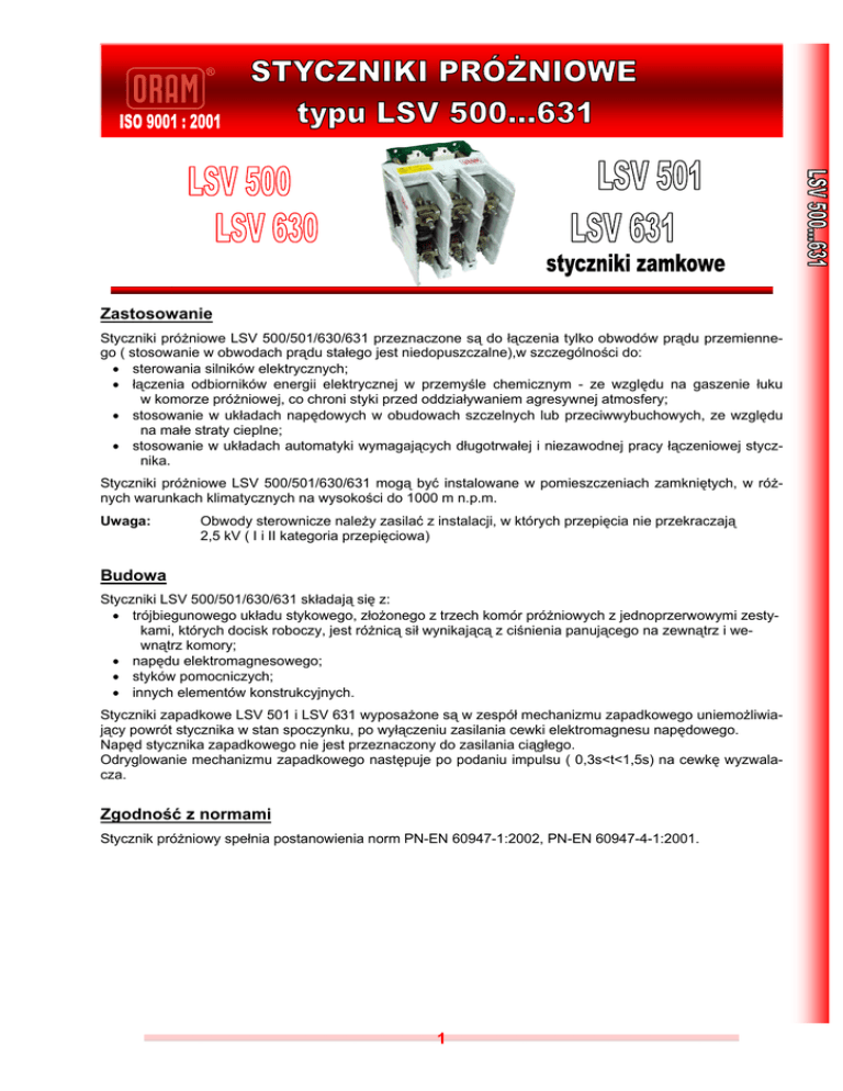 Zastosowanie Styczniki próżniowe LSV 500/501/630/631 przeznaczone są do łączenia tylko obwodów prądu przemiennego ( stosowanie w obwodach prądu stałego jest niedopuszczalne),w szczególności do: • sterowania silników elektrycznych; • łączenia odbiorników energii elektrycznej w przemyśle chemicznym - ze względu na gaszenie łuku w komorze próżniowej, co chroni styki przed oddziaływaniem agresywnej atmosfery; • stosowanie w układach napędowych w obudowach szczelnych lub przeciwwybuchowych, ze względu na małe straty cieplne; • stosowanie w układach automatyki wymagających długotrwałej i niezawodnej pracy łączeniowej stycznika. Styczniki próżniowe LSV 500/501/630/631 mogą być instalowane w pomieszczeniach zamkniętych, w różnych warunkach klimatycznych na wysokości do 1000 m n.p.m. Uwaga: Obwody sterownicze należy zasilać z instalacji, w których przepięcia nie przekraczają 2,5 kV ( I i II kategoria przepięciowa) Budowa Styczniki LSV 500/501/630/631 składają się z: • trójbiegunowego układu stykowego, złożonego z trzech komór próżniowych z jednoprzerwowymi zestykami, których docisk roboczy, jest różnicą sił wynikającą z ciśnienia panującego na zewnątrz i wewnątrz komory; • napędu elektromagnesowego; • styków pomocniczych; • innych elementów konstrukcyjnych. Styczniki zapadkowe LSV 501 i LSV 631 wyposażone są w zespół mechanizmu zapadkowego uniemożliwiający powrót stycznika w stan spoczynku, po wyłączeniu zasilania cewki elektromagnesu napędowego. Napęd stycznika zapadkowego nie jest przeznaczony do zasilania ciągłego. Odryglowanie mechanizmu zapadkowego następuje po podaniu impulsu ( 0,3s<t<1,5s) na cewkę wyzwalacza. Zgodność z normami Stycznik próżniowy spełnia postanowienia norm PN-EN 60947-1:2002, PN-EN 60947-4-1:2001. 1 Dane techniczne LSV 500 LSV 501 LSV 630 LSV 631 Znamionowe napięcie izolacji Ui V 1500 Max. znamionowe napięcie łączeniowe Ue V 1000 Częstotliwość Hz 50 - 60 A 550 630 +55 C A 500 550 400V kW 250/132 335/150 500V kW 315/175 400/210 690V kW 400/220 500/280 1000V kW 550/250 600/300 Znamionowy prąd ciągły Iu i łączeniowy Ie w kat. AC1 +40°C o Dopuszczalna moc silnika w kat. AC3/AC4 Częstość łączeń w kat. AC1 - AC3/AC4 Trwałość łączeniowa 1/h 300/120 cykli wg charakterystyki str.7 Łączenie baterii kondensatorów (do 400 V) - kompensacja indywidualna (bateria jednoczłonowa) kompensacja centralna (bateria dzielona) Prąd n-sekundowy 2) 1) 10 s Trwałość mechaniczna KVAr 250 300 kVAr 220 260 kA 4,8 cykli 4,8 1 x 10 6 Wkładka bezpiecznikowa zabezpieczająca stycznik ( gG ) A 630 630 przy spodziewanym prądzie kA 18 18 przewodów przyłączowych z końcówką kablową mm2 95 ... 2x150 95 ... 2x185 przewodów szynowych mm Przewody przyłączowe Przekroje Śruby zaciskowe max. 2x(30x5) M 10 Napęd elektromagnesowy stycznika Znamionowe napięcie sterownicze Pobór mocy: V 230, (110) a.c. rozruch trzymanie VA VA 2000 8 d.c. rozruch trzymanie VA VA 2000 15, (7) V 230 VA VA 1200 400 1/h 120 Napęd elektromagnesowy stycznika zapadkowego Znamionowe napięcie sterownicze Pobór mocy: przy zamykaniu przy wyzwalaniu Częstość łączeń Tory pomocnicze 4z+2r; 3z+2r 3) Liczba torów pomocniczych Napięcie znamionowe izolacji Ui V 690 Znamionowy prąd ciągły Iu A 10 Znamionowe prądy łączeń. Ie kat.AC15 230;400;500 V DC13 48;110;220 V Zacisk uziomowy Masa stycznika A A 6; 4; 2 6; 1,5; 0,5 M12 13,5 1) minimalna indukcyjność pomiędzy równolegle połączonymi członami 6 µH charakterystyka str. 7. 3) dotyczy styczników zamkowych LSV 501 i LSV 631 2) 2 kg Charakterystyki Dopuszczalne prądy krótkotrwałe n-sekundowe (graniczna wartość cieplna) n 10 6 4 7 2 10 6 4 6 liczba łączeń 2 10 6 4 5 2 10 6 4 4 2 10 3 A 10 2 2 4 6 8 10 prąd wyłączeniowy 3 2 4 6 8 10 4 Ia Trwałość łączeniowa (n) w funkcji prądu wyłączeniowego (Ia) 3 Wymiary obrysowe styczników A – min. odstęp izolacyjny 20 mm Schematy elektryczne styczników a) napęd a.c. b) napęd d.c. * występuje dla 220V d.c. Schemat elektryczny i sterowanie stycznikami zapadkowymi 4