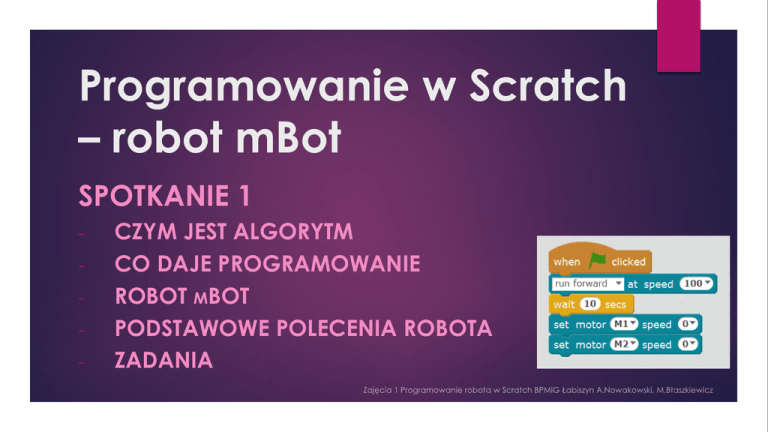 Programowanie w Scratch – robot mBot SPOTKANIE 1 - CZYM JEST ALGORYTM CO DAJE PROGRAMOWANIE ROBOT MBOT PODSTAWOWE POLECENIA ROBOTA ZADANIA Czym jest algorytm Zajęcia 1 Programowanie robota w Scratch BPMiG Łabiszyn ś.Nowakowski, M.Błaszkiewicz Co daje programowanie PROGRAMOWANIE UCZY LOGICZNEGO MY LENIś !!! Zajęcia 1 Programowanie robota w Scratch BPMiG Łabiszyn ś.Nowakowski, M.Błaszkiewicz Tworzenie programów komputerowych Zajęcia 1 Programowanie robota w Scratch BPMiG Łabiszyn ś.Nowakowski, M.Błaszkiewicz Tworzenie gier komputerowych Zajęcia 1 Programowanie robota w Scratch BPMiG Łabiszyn ś.Nowakowski, M.Błaszkiewicz Tworzenie gier i aplikacji na smartfona Zajęcia 1 Programowanie robota w Scratch BPMiG Łabiszyn ś.Nowakowski, M.Błaszkiewicz Wysłanie rakiety w kosmos Zajęcia 1 Programowanie robota w Scratch BPMiG Łabiszyn ś.Nowakowski, M.Błaszkiewicz Praca robotów małych i większych Zajęcia 1 Programowanie robota w Scratch BPMiG Łabiszyn ś.Nowakowski, M.Błaszkiewicz Robot mBot Zajęcia 1 Programowanie robota w Scratch BPMiG Łabiszyn ś.Nowakowski, M.Błaszkiewicz Robot mBot – budowa Zajęcia 1 Programowanie robota w Scratch BPMiG Łabiszyn ś.Nowakowski, M.Błaszkiewicz Możliwości robota Zajęcia 1 Programowanie robota w Scratch BPMiG Łabiszyn ś.Nowakowski, M.Błaszkiewicz Możliwości robota Miernik odległości Wykrywanie czarnej linii Zajęcia 1 Programowanie robota w Scratch BPMiG Łabiszyn ś.Nowakowski, M.Błaszkiewicz Możliwości robota 2 źródła światła LED z możliwością ustawienia przeróżnych kolorów Wydawanie dźwięków w różnych tonach Możliwość programowania pilota i przycisku na robocie Miernik poziomu natężenia światła Zajęcia 1 Programowanie robota w Scratch BPMiG Łabiszyn ś.Nowakowski, M.Błaszkiewicz Jak połączyć się z robotem Podłącz do USB urządzenie umożliwiające bezprzewodowe połączenie robota Postępuj według kolejnego slajdu Zajęcia 1 Programowanie robota w Scratch BPMiG Łabiszyn ś.Nowakowski, M.Błaszkiewicz Jak połączyć się z robotem Zajęcia 1 Programowanie robota w Scratch BPMiG Łabiszyn ś.Nowakowski, M.Błaszkiewicz Pierwsze polecenia – start robota Kiedy wciśnięto zieloną flagę Kiedy wciśnięto klawisz spacja Kiedy puszczono strzałka do góry Zajęcia 1 Programowanie robota w Scratch BPMiG Łabiszyn ś.Nowakowski, M.Błaszkiewicz Zajęcia 1 Programowanie robota w Scratch BPMiG Łabiszyn ś.Nowakowski, M.Błaszkiewicz Pierwsze polecenia – start robota Możemy wybrać dowolny klawisz - Up arrow – Strzałka do góry Ĺ - Down arrow – Strzałka w dół Ļ - Right arrow – Strzałka w prawo ĺ - Left arrow – Strzałka w lewo ĸ - I wiele innych Zajęcia 1 Programowanie robota w Scratch BPMiG Łabiszyn ś.Nowakowski, M.Błaszkiewicz Pierwsze polecenia – pętle Program odczeka podaną liczbę sekund zanim zacznie wykonywać kolejne Pętla, która powtarza umieszczone wewnątrz instrukcje podaną liczbę razy Niekończąca się pętla. Powtarza umieszczony wewnątrz program, aż do wyłączenia robota. Zatrzymanie. Tą instrukcją można na przykład zatrzymać pętlę lub cały program. Zajęcia 1 Programowanie robota w Scratch BPMiG Łabiszyn ś.Nowakowski, M.Błaszkiewicz Pierwsze polecenia – pętle Zajęcia 1 Programowanie robota w Scratch BPMiG Łabiszyn ś.Nowakowski, M.Błaszkiewicz Pierwsze polecenia – kontrolowanie robota Pozwala wybrać czy robot ma jechać do przodu, do tyłu lub skręcić w prawo albo w lewo. Można również podać prędkość z jaką ma to zrobić (warto ci 0 – 255) Pozwala ustawić prędkość obrotu wybranego koła. Przyjmuje wartości od -255 do 255. Wartości ujemne powodują obrót w drugą stronę. Wartość 0 zatrzymuje silnik Zajęcia 1 Programowanie robota w Scratch BPMiG Łabiszyn ś.Nowakowski, M.Błaszkiewicz Pierwsze polecenia – kontrolowanie robota Zajęcia 1 Programowanie robota w Scratch BPMiG Łabiszyn ś.Nowakowski, M.Błaszkiewicz Zadanie 1 Zaprogramuj robota tak aby: Po wciśnięciu Zielonej Flagi poruszał się do przodu przez 10 sekund z prędko cią 100 a następnie zatrzymał się Zajęcia 1 Programowanie robota w Scratch BPMiG Łabiszyn ś.Nowakowski, M.Błaszkiewicz Zadanie 1 - Rozwiązanie Zaprogramuj robota tak aby: Po wciśnięciu Zielonej Flagi poruszał się do przodu przez 10 sekund z prędko cią 100 a następnie zatrzymał się Zajęcia 1 Programowanie robota w Scratch BPMiG Łabiszyn ś.Nowakowski, M.Błaszkiewicz Zadanie 2 Przerób poprzedni program tak aby robot zaczynał poruszanie do przodu z prędko cią 100 i co sekundę jechał szybciej o 20 aż do prędko ci 200 którą jadąc sekundę zatrzyma się. Zajęcia 1 Programowanie robota w Scratch BPMiG Łabiszyn ś.Nowakowski, M.Błaszkiewicz Zadanie 2 Przerób poprzedni program tak aby robot zaczynał poruszanie do przodu z prędko cią 100 i co sekundę jechał szybciej o 20 aż do prędko ci 200 którą jadąc sekundę zatrzyma się. Zajęcia 1 Programowanie robota w Scratch BPMiG Łabiszyn ś.Nowakowski, M.Błaszkiewicz Tworzenie nowego programu bez utraty poprzedniego Zajęcia 1 Programowanie robota w Scratch BPMiG Łabiszyn ś.Nowakowski, M.Błaszkiewicz Tworzenie nowego programu bez utraty poprzedniego Zajęcia 1 Programowanie robota w Scratch BPMiG Łabiszyn ś.Nowakowski, M.Błaszkiewicz Tworzenie nowego programu bez utraty poprzedniego Zajęcia 1 Programowanie robota w Scratch BPMiG Łabiszyn ś.Nowakowski, M.Błaszkiewicz Zadanie 3 Zaprogramuj robota tak aby wciskając na klawiaturze: -strzałkę w górę poruszał się do przodu -strzałkę w dół poruszał się do tyłu -strzałkę w lewo skręcał w lewo -strzałkę w prawo skręcał w prawo -spację zatrzymywał się Zajęcia 1 Programowanie robota w Scratch BPMiG Łabiszyn ś.Nowakowski, M.Błaszkiewicz Zadanie 3 - Rozwiązanie Zaprogramuj robota tak aby wciskając na klawiaturze: -strzałkę w górę poruszał się do przodu -strzałkę w dół poruszał się do tyłu -