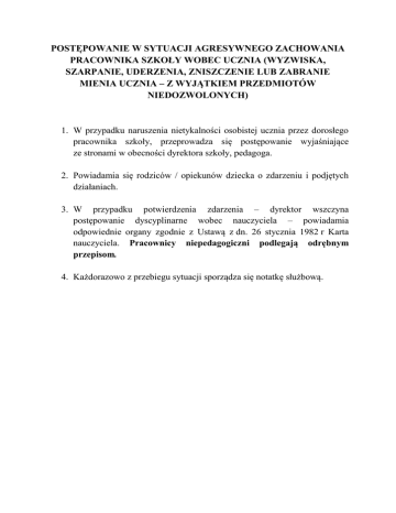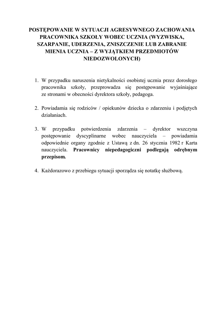 POSTĘPOWANIE W SYTUACJI AGRESYWNEGO ZACHOWANIA PRACOWNIKA SZKOŁY WOBEC UCZNIA (WYZWISKA, SZARPANIE, UDERZENIA, ZNISZCZENIE LUB ZABRANIE MIENIA UCZNIA – Z WYJĄTKIEM PRZEDMIOTÓW NIEDOZWOLONYCH) 1. W przypadku naruszenia nietykalności osobistej ucznia przez dorosłego pracownika szkoły, przeprowadza się postępowanie wyjaśniające ze stronami w obecności dyrektora szkoły, pedagoga. 2. Powiadamia się rodziców / opiekunów dziecka o zdarzeniu i podjętych działaniach. 3. W przypadku potwierdzenia zdarzenia – dyrektor wszczyna postępowanie dyscyplinarne wobec nauczyciela – powiadamia odpowiednie organy zgodnie z Ustawą z dn. 26 stycznia 1982 r Karta nauczyciela. Pracownicy niepedagogiczni podlegają odrębnym przepisom. 4. Każdorazowo z przebiegu sytuacji sporządza się notatkę służbową.