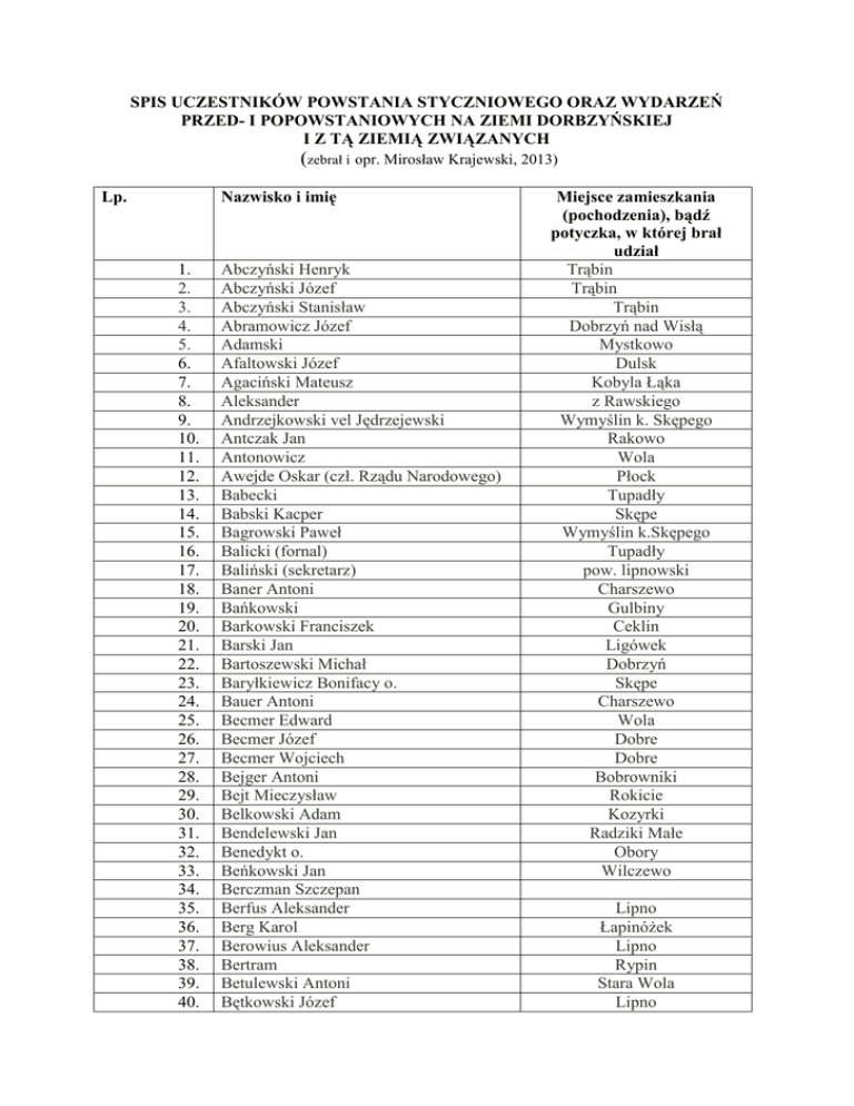 SPIS UCZESTNIKÓW POWSTANIA STYCZNIOWEGO ORAZ WYDARZEŃ PRZED- I POPOWSTANIOWYCH NA ZIEMI DORBZYŃSKIEJ I Z TĄ ZIEMIĄ ZWIĄZANYCH (zebrał i opr. Mirosław Krajewski, 2013) Nazwisko i imię Lp. 1. 2. 3. 4. 5. 6. 7. 8. 9. 10. 11. 12. 13. 14. 15. 16. 17. 18. 19. 20. 21. 22. 23. 24. 25. 26. 27. 28. 29. 30. 31. 32. 33. 34. 35. 36. 37. 38. 39. 40. Abczyński Henryk Abczyński Józef Abczyński Stanisław Abramowicz Józef Adamski Afaltowski Józef Agaciński Mateusz Aleksander Andrzejkowski vel Jędrzejewski Antczak Jan Antonowicz Awejde Oskar (czł. Rządu Narodowego) Babecki Babski Kacper Bagrowski Paweł Balicki (fornal) Baliński (sekretarz) Baner Antoni Bańkowski Barkowski Franciszek Barski Jan Bartoszewski Michał Baryłkiewicz Bonifacy o. Bauer Antoni Becmer Edward Becmer Józef Becmer Wojciech Bejger Antoni Bejt Mieczysław Belkowski Adam Bendelewski Jan Benedykt o. Beńkowski Jan Berczman Szczepan Berfus Aleksander Berg Karol Berowius Aleksander Bertram Betulewski Antoni Bętkowski Józef Miejsce zamieszkania (pochodzenia), bądź potyczka, w której brał udział Trąbin Trąbin Trąbin Dobrzyń nad Wisłą Mystkowo Dulsk Kobyla Łąka z Rawskiego Wymyślin k. Skępego Rakowo Wola Płock Tupadły Skępe Wymyślin k.Skępego Tupadły pow. lipnowski Charszewo Gulbiny Ceklin Ligówek Dobrzyń Skępe Charszewo Wola Dobre Dobre Bobrowniki Rokicie Kozyrki Radziki Małe Obory Wilczewo Lipno Łapinóżek Lipno Rypin Stara Wola Lipno 41. 42. 43. 44. 45. 46. 47. 48. 49. 50. 51. 52. 53. 54. 55. 56. 57. 58. 59. 60. 61. 62. 63. 64. 65. 66. 67. 68. 69. 70. 71. 72. 73. 74. 75. 76. 77. 78. 79. 80. 81. 82. 83. 84. 85. 86. 87. Bętlejewski Józef Białobłocki Kazimierz Biedrzycki Ludwik Bielakowski Bartłomiej Bielichowicz Jan Bielicki Adolf Bieńkowski Feliks Bieńkowski Leon Bieńkowski Jan Bieńkowski Mikołaj Biernacki Cyriak ks. zakonny Biesiekierski Julian Lambert Bieżuński Józef Blank Karol Bloch Modest ks. zakonny Blomberg Franciszek Błożek Jacenty Bobrowicz Józef Bobrski Witalis o. Bodziczyn Mikołaj Bogucki Stefan Bojanowski Franciszek ks. Bojanowski Ignacy Bojańczyk Mikołaj Bajarski Jan Bokarzyński Józef Błaszczyński Kazimierz Konrad, ps. Bończa (naczelnik) Bombleski Stefan Borkowski Jan Borkowski Jan Borkowski Jan Borkowski Nepomucen Borkowski Wojciech Borowiński Borowski Antoni Borowski Konstanty Borowski Wojciech Borzewski Artur Branberger v Bramberger (piekarz) Branberg (mieszczanin) Braunowie (bracia) Broczewski Adam Brodecki Antoni Brodowski Franciszek Brodziński Jan Bronikowski Alfons Bronisz Stanisław Feliks Lipno Piórkowo Tupadły Wilczewo Rypin Dobrzyń n. Wisłą Skępe Wilczewo Płonko Trutowo/Obory Skórzno Dobrzyń n. Wisłą Skępe Szpetal Dobrzyń n. Wisłą Skępe Skępe Pręczki Koziołek Bobowo Koziołek Pręczki Ligówek woj. płockie Ligówek Lipno Lisewo Rypin ziemia chełmińska Wymyślin k. Skępego Orszymowo Tupadły Ugoszcz zabór pruski Lipno Lipno Skępe Skępe Dobrzyń n. Wisłą Dobrzyń n. Drwęcą Trzebiełucha 88. 89. 90. 91. 92. 93. 94. 95. 96. 97. 98. 99. 100. 101. 102. 103. 104. 105. 106. 107. 108. 109. 110. 111. 112. 113. 114. 115. 116. 117. 118. 119. Bronkowski Tomasz ks. Brożchowski Teodor Brózdewicz Mateusz Brózdowicz Maksymilian Brudziński Józef Brudziński Mateusz Bryliński Wincenty Brzejtowicz Mateusz Brzeziński Jan Brzozowski Bartłomiej Brzytwiński Moszek Buczkowski Józef Buczyński Karol Budny Franciszek Bugaj Adam Bukowski Józef Bukowski Marian Bukowski Marian Buksakowski Leopold Szymon o. Butler Marian Buse Edward Callier Edmund Cegielski Józef Cegliński Józef Celmer Franciszek Celszer Franciszek Centkowski Leon Centkowski Ignacy Chanowski Michał Charkowski Dionizy Chatkowski Julian Chądzyński Zbigniew Chełmicki Antoni Chełmicki Ignacy Chełmicki Ignacy Chełmicki Józef Antoni Chełmicki Julian Chełmicki Wacław Chęcki Józef Chlebowski Józef Chlebowski Konstanty Chludziński Antoni Chmielewski (organista) Chmielewski vel Chmielnicki (mieszczanin) 132. Chodecki Aleksander 133. Chodubski Józef 134. Chojnicki Michał 120. 121. 122. 123. 124. 125. 126. 127. 128. 129. 130. 131. Osiek Wielki powiat mławski okolice Rypina vel Rypin Rusinowo Dobrzyń n. Wisłą Lipno Skępe Skępe Dobrzyń n. Wisłą Tłuchowo Rypin Rakowo Ruszkowo Duszoty Michałki Skępe Urszulewo Skępe Obory Dulsk Sierpc Poznań Kikół Ruszkowo Janowo k. Lipna Julianowo k. Ugoszcza Rypin Rudzelewo Źródła Źródła Jastrzębie Warszawa, Piotrków Tryb., Mysłakówko Stalmierz Tupadły/ Białowieżyn Balin, Rojki Białowieżyn Kosemin Kowalki Dobrzyń n. Wisłą Borki Borki powiat koźmiński Lipno Golub Płock Bałdowo Grodzeń 135. 136. 137. 138. 139. 140. 141. 142. 143. 144. 145. 146. 147. 148. Chrapkiewicz Franciszek ks. Chrapkiewicz Teofil Chubicka (córka sędziego) Cichocki Ignacy Cichoń Michał o. Cichorski Władysław ps. Zameczek Ciechanowicz Hipolit Ciesielski (mieszczanin) Ciesielski Józef Cieślikowski (szewc) Ciółkowski Teofil Cyler Wojciech Cyrankowski Andrzej Cyrklaff 149. 150. 151. 152. 153. 154. 155. 156. 157. 158. 159. 160. 161. 162. 163. 164. 165. 166. 167. 168. 169. 170. 171. 172. 173. 174. 175. 176. 177. 178. 179. 180. 181. Cyroch (rzeźnik) Czachowski Czachy Ferdynand Czajkowski Baltazar Czajkowski Stanisław Czaki Ferdynand Czaplewski Józef Czapliński Tomasz Czapski Józef Czapski Napoleon Czarliński Leon Czarliński Piotr Czarliński Stanisław Czrnecki Franciszek Czarnomski Roman Czechowicz Franciszek Czeczelski Adam Czerny Częstochowski Józef Człapski (rymarz) Czyżniewski Józef Dalberg Leon Dale August Damke August Dawidowicz Michał Dąbrowski Henryk Dąbrowski Henryk Dechman Michał Dembiński Henryk Dębkowski Stanisław Dębowski Marian Dmowski Władysław Dobraniecki Teodor Sumin Golub Płock Dobrzyń n. Wisłą Skępe Skępe Koziołek Dobrzyń n. Wisłą Bądkowo Jeziorne Jastrzębie Myśliwiec k. Jastrzębia/Bolesławice Chełmno Borzymin Czumsk Nadróż Kobrzyniec Dobrzyń n. Wisłą Ro