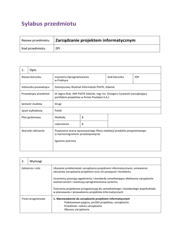 Sylabus przedmiotu Nazwa przedmiotu Zarządzanie projektem informatycznym Kod przedmiotu ZPI 1. Opis Nazwa kierunku Inżynieria Oprogramowania w Praktyce Jednostka prowadząca Zamiejscowy Wydział Informatyki PJATK, Gdańsk Prowadzący przedmiot dr Jagna Kluk, ZWI PJATK Gdańsk, mgr inż. Grzegorz Cysewski (zarządzający portfelem projektów w firmie Postdata S.A.) Semestr studiów Drugi Język wykładowy Polski Plan godzinowy Wykłady 8 Laboratoria 8 Warunki zaliczenia Kod kierunku IOP Pozytywna ocena opracowanego Planu realizacji produktu programowego (z harmonogramem przedsięwzięcia) Egzamin pisemny 2. Wymogi Założenia i cele Ukazanie problematyki zarządzania projektami informatycznymi, omówienie obszarów zarządzania projektem oraz ich powiązań i kontekstu. Uczestnicy poznają zagadnienia i standardy umożliwiające efektywne zarządzanie wytwarzaniem i ewolucją oprogramowania systemu. Ćwiczenia projektowe przygotowują do samodzielnego i świadomego współudziału w planowaniu i prowadzeniu projektów informatycznych Treści programowe 1. Wprowadzenie do zarządzanie projektem informatycznym · Podstawowe pojęcia, portfel projektów, zarządzanie. · Przedmiot i zakres zarządzania · Obszary zarządzania · Standardy i zalecenia 2. Planowanie projektu informatycznego · Zakres i przedmiot planowania projektu; poziomy planowania · Wstępny plan projektu · Harmonogramowanie 3. Wybrane aspekty zarządzania projektami informatycznymi · zarządzanie ewolucją oprogramowania · zarządzanie konfiguracją i zmianą · zarządzanie ryzykiem · zarządzanie zasobami i komunikacja w projekcie 4. Standardy i metodyki zarządzania · Dobre praktyki zarządzania · Zarządzanie usługami IT – biblioteka ITIL · Metodyka PRINCE2 · Zwinne zarządzanie projektami · Wykaz literatury Literatura podstawowa: 1. Caddle J., Yeates D.: Zarządzanie procesem tworzenia systemów informacyjnych. WNT, 2001. 2. Górski J. (red.) Inżynieria oprogramowania w projekcie informatycznym, MIKOM, 2000, 3. Szejko S.: Planowanie projektu informatycznego. Wykłady zaproszone Konferencji. Systemów Czasu Rzeczywistego 2000, wyd. Katedry Automatyki AGH, Kraków 2001 Literatura uzupełniająca 1. Foundations of IT Service Management Based on ITIL® V3 (English version).ITSM Library 2. Marciniak J.J. and Reifer D.J.: Software Acquisition Management. J. Wiley & Sons, 1990 3. A Guide to the Project Management Body of Knowledge (PMBoK), Project Management Institute, 2004 (wyd. polskie „Kompendium wiedzy o zarządzaniu projektami”, MT&DC). IEEE Std. 1490-1988 Kontakt do prowadzącego przedmiot [email protected], [email protected] Kontakt do Koordynatora merytorycznego kierunku dr inż. Stanisław Szejko, [email protected]