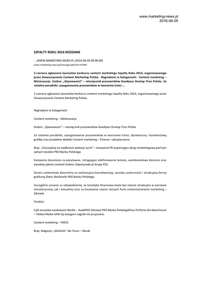 www.marketing-news.pl 2016-06-05 SZPALTY ROKU 2016 ROZDANE . .,WWW.MARKETING-NEWS.PL (2016-06-05 00:00:00) www.marketing-news.pl/message.php?art=47444 3 czerwca ogłoszono laureatów konkursu content marketingu Szpalty Roku 2014, organizowanego przez Stowarzyszenie Content Marketing Polska. Nagrodzeni w kategoriach: Content marketing – Motoryzacja Srebro: „Oponowości” – miesięcznik pracowników Goodyear Dunlop Tires Polska Za rzetelne poradniki, zaangażowanie pracowników w tworzenie treści ... 3 czerwca ogłoszono laureatów konkursu content marketingu Szpalty Roku 2014, organizowanego przez Stowarzyszenie Content Marketing Polska. Nagrodzeni w kategoriach: Content marketing – Motoryzacja Srebro: „Oponowości” – miesięcznik pracowników Goodyear Dunlop Tires Polska Za rzetelne poradniki, zaangażowanie pracowników w tworzenie treści, dynamiczną i kontekstową grafikę oraz przydatne dodatki Content marketing – Finanse i ubezpieczenia Brąz: „Oszczędzaj na najdłuższe wakacje życia” – kampania PR wspierająca akcję marketingową pod tym samym tytułem PKO Banku Polskiego Kampania doceniona za pozytywne, intrygujące zdefiniowanie tematu, wielokanałowe dotarcie oraz wysokiej jakości content Srebro: Dajemyrade.pl Grupy PZU Serwis contentowy doceniony za realizacyjną konsekwencję, wysoką użyteczność i atrakcyjną formę graficzną Złoto: Bankowiki PKO Banku Polskiego Szczególne uznanie za udowodnienie, że tematyka finansowa może być równie atrakcyjna w warstwie merytorycznej, jak i wizualnej oraz za kreatywne użycie różnych form contentuContent marketing – Zdrowie Finaliści: Cykl zeszytów naukowych Nestle – AudePKO Zdrowie PKO Banku PolskiegoPeso Perfecto dla Naturhouse – Valkea Media SAW tej kategorii nagród nie przyznano. Content marketing – FMCG Brąz: Magazyn „Alkohole” dla Tesco – Skivak www.marketing-news.pl 2016-06-05 Za wysoki poziom fotoedytorski oraz ambitne treści edukacyjne i poradnikowe Srebro: Przepis na dobre życie dla sieci Piotr i Paweł – Skivak Za wyjątkową oprawę graficzną oraz koncepcję lifestyle’owego cookbooka, dzięki którym content kulinarny nabrał nowego wymiaruContent marketing – Moda Złoto: Magazyn „Patrz pod Nogi” dla Nike - Valkea Media SA Za profesjonalizm i serce w poprowadzeniu narracji oraz nieszablonową oprawę graficznąContent marketing – Home&Garden Wyróżnienie: Dekoratorium dla FFiL Śnieżka – Skivak Za wysoką jakość wydania oraz umiejętne łączenie treści sprzedażowych z contentem inspiracyjnymZłoto: Castorama – katalog inspiracyjny Ogrody, tarasy, balkony 2016 - Pentagon Media/ZPR Media SA Za rozwój jakościowy, szczerość przekazu, efektowną realizację katalogu oraz nietuzinkowe połączenie treści sprzedażowych z inspiracjami i edukacją Content marketing – Rolnictwo i pokrewne Finaliści: Nowoczesne i odpowiedzialne rolnictwo - Mediaplanet Publishing HouseW tej kategorii nagród nie przyznano. Content marketing – Turystyka Brąz: HiFly dla Portów Lotniczych Wrocław – Skivak Za znakomitą warstwę graficzną oraz edytorską różnorodność, skutecznie realizującą strategięZłoto: Magalogi Grecos dla Grecos Holiday - Agora Custom Publishing Za trafność realizacji wobec grupy docelowej, niebanalne formy edytorskie oraz wysoką użyteczność contentu w kontekście zdefiniowanych celówContent marketing – Handel Brąz: Stokrotka dla Stokrotka Sp. z o.o. – Skivak Za apetyczne rozwiązania w sekcji kulinarnej, warte dla czytelnika dużo więcej niż przepisSrebro: Tesco magazyn dla Tesco – Skivak Za wysoki poziom realizacji wpływający pozytywnie na wizerunek marki i świadomość zakupową klientówZłoto: Piwniczka Smaków dla Piotr i Paweł – Agora Custom Publishing www.marketing-news.pl 2016-06-05 Za realizację bardzo dobrze trafiająca w grupę docelową, ubraną w atrakcyjną szatę graficzną, pozwalającą realizować edukacyjne cele marki Content marketing – Kultura i Nauka Złoto: Historia z bliska dla Narodowego Instytutu Muzealnictwa i Ochrony Zbiorów – Agora Custom Publishing Za 100% realizację celów, doskonałe zrównoważenie ilości i jakości wiedzy, wskazujące na głębokie zrozumienie grupy docelowejContent marketing – Łączność Złoto: Expert Play dla firmy P4 - Valkea Media SA Za przemyślany i świetnie złożony magazyn, wysokiej jakości content oraz dyskretne i kontekstowe posługiwanie się treściami prosprzedażowymiPublikacja jednorazowa Wyróżnienie: Raport CSR ING Banku Śląskiego – Aude Za atrakcyjne i pomysłowe połączenie nowoczesnej technologii z formami graficznymi przygotowanymi przez pracowników bankuWyróżnienie: Valkea – publikacja o firmie przygotowana przez Valkea Za nieszablonową i niezwykle staranną edytorsko prezentację firmyZłoto: Spełnione Marzenia Fundacji Edukacyjna Przedsiębiorczość – Epigrafika Za wyjątkowe i pełne szacunku przedstawienie prawdziwie ludzkich historii oraz ich bohaterów, dla których przyznane stypendia były krokiem milowym w życiu Strategia content marketing dla klientów Wyróżnienie: Farmacja Praktyczna dla Zakładów Farmaceutycznych Polpharma – Valkea Media SA Za konsekwentne i synchroniczne (offline i online) realizowanie strategii wzrostu rozpoznawalności marki Srebro: Custom publishing dla Grupy PZU – Work Room Za spójność koncepcji w kontekście efektów oraz nieszablonową tonację komunikacjiSrebro: Lider Animator – Obudź Swoje Ciało – Agencja marketingowa Qantum Za spójną, wielokanałową i efektywną realizację strategii, opartą na angażujących treściachZłoto: Raport CSR ING Banku Śląskiego – Aude Za nieszablonowe podejście angażujące w realizację pracowników oraz nowoczesną formę i unikalną oprawę graficzną Strategia content marketing dla pracowników Wyróżnienie: Merck – kampania dla pracowników Merck – Aude Za oryginalne połączenie akcji offline i online