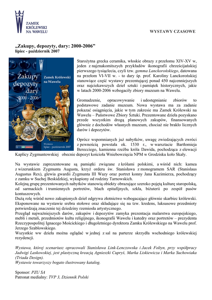 WYSTAWY CZASOWE „Zakupy, depozyty, dary: 2000-2006” lipiec - październik 2007 Starożytna grecka ceramika, włoskie obrazy z przełomu XIV-XV w, jeden z najznakomitszych przykładów ikonografii chrześcijańskiej pierwszego tysiąclecia, czyli tzw. gemma Lanckorońskiego, datowana na przełom VI-VII w. - to dary śp. prof. Karoliny Lanckorońskiej stanowiące część wystawy prezentującej ponad 450 najcenniejszych oraz najciekawszych dzieł sztuki i pamiątek historycznych, jakie w latach 2000-2006 wzbogaciły zbiory muzeum na Wawelu. Gromadzenie, opracowywanie i udostępnianie zbiorów to podstawowe zadanie muzeum. Nowa wystawa ma za zadanie pokazać osiągnięcia, jakie w tym zakresie ma Zamek Królewski na Wawelu – Państwowe Zbiory Sztuki. Prezentowane dzieła pozyskano przede wszystkim drogą planowych zakupów, finansowanych głównie z dochodów własnych muzeum, chociaż nie brakło licznych darów i depozytów. Oprócz wspomnianych już nabytków, uwagę zwiedzających zwróci z pewnością powstała ok. 1530 r., w warsztacie Bartłomieja Berecciego, kamienna rzeźba króla Dawida, pochodząca z elewacji Kaplicy Zygmuntowskiej obecnie depozyt kościoła Wniebowzięcia NPM w Grodzisku koło Skały. Na wystawie zaprezentowane są pamiątki związane z królami polskimi, a wśród nich: kamea z wizerunkiem Zygmunta Augusta, krzyż orderu św. Stanisława z monogramem SAR (Stanislaus Augustus Rex), glewia gwardii Zygmunta III Wazy oraz portret konny Jana Kazimierza, pochodzący z zamku w Suchej Beskidzkiej, wykupiony od rodziny Tarnowskich. Kolejną grupę prezentowanych nabytków stanowią obiekty obrazujące szeroko pojętą kulturę staropolską, od sarmackich i trumiennych portretów, blach epitafijnych, szkła, biżuterii po zespół pasów kontuszowych. Dużą rolę wśród nowo zakupionych dzieł odgrywa złotnictwo wzbogacające głównie skarbiec królewski. Eksponowane na wystawie srebra stołowe oraz składające się na tzw. kredens, luksusowe przedmioty potwierdzają znaczenie tej dziedziny rzemiosła artystycznego. Przegląd najważniejszych darów, zakupów i depozytów zamyka prezentacja malarstwa europejskiego, mebli i metali, przedmiotów kultu religijnego, ikonografii Wawelu i katedry oraz portretów – prezydenta Rzeczypospolitej Ignacego Mościckiego i długoletniego dyrektora Zamku Królewskiego na Wawelu prof. Jerzego Szablowskiego. Wszystkie ww dzieła można oglądać w jednej z sal na parterze skrzydła wschodniego królewskiej rezydencji. Wystawa, której scenariusz opracowali Stanisława Link-Lenczowska i Jacek Foltyn, przy współpracy Jadwigi Laskowskiej, jest plastyczną kreacją Agnieszki Cupryś, Marka Liskiewicza i Marka Suchowiaka (Triada Design). Wystawie towarzyszy bogato ilustrowany katalog. Sponsor: PZU SA Patronat medialny: TVP 3, Dziennik Polski WYSTAWY CZASOWE "Pokłon Trzech Króli" Włochy, szkoła florencka; XIV/XV , dar Karoliny Lanckorońskiej z roku 2000; fot. Stanisław Michta WYSTAWY CZASOWE Krzyż orderu Św. Stanisława (awers), zakup ze środków Banku BPH S.A z roku 2006; fot. Stanisław Michta Zegar stołowy, Augsburg, David Fronmiller, w.XVI/XVII, zakupiony w Warszawie (2003); fot. Adam Wierzba