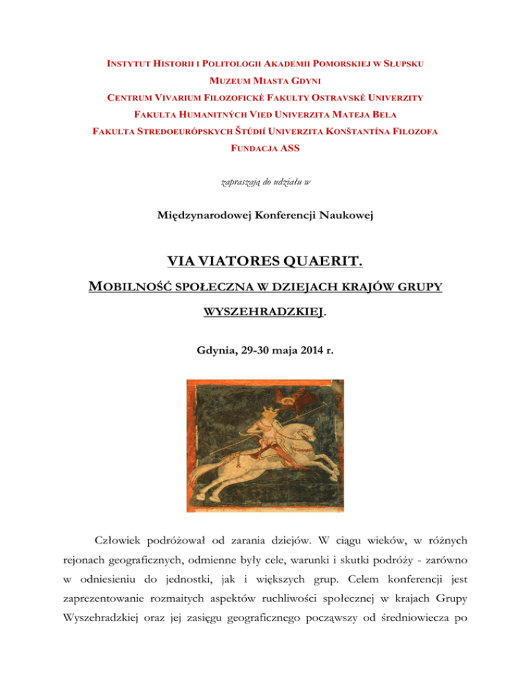 INSTYTUT HISTORII I POLITOLOGII AKADEMII POMORSKIEJ W SŁUPSKU MUZEUM MIASTA GDYNI CENTRUM VIVARIUM FILOZOFICKÉ FAKULTY OSTRAVSKÉ UNIVERZITY FAKULTA HUMANITNÝCH VIED UNIVERZITA MATEJA BELA FAKULTA STREDOEURÓPSKYCH ŠTÚDIÍ UNIVERZITA KONŠTANTÍNA FILOZOFA FUNDACJA ASS zapraszają do udziału w Międzynarodowej Konferencji Naukowej VIA VIATORES QUAERIT. MOBILNOŚĆ SPOŁECZNA W DZIEJACH KRAJÓW GRUPY WYSZEHRADZKIEJ. Gdynia, 29-30 maja 2014 r. Człowiek podróżował od zarania dziejów. W ciągu wieków, w różnych rejonach geograficznych, odmienne były cele, warunki i skutki podróży - zarówno w odniesieniu do jednostki, jak i większych grup. Celem konferencji jest zaprezentowanie rozmaitych aspektów ruchliwości społecznej w krajach Grupy Wyszehradzkiej oraz jej zasięgu geograficznego począwszy od średniowiecza po czasy najnowsze. Szczególnie interesujące, zdaniem organizatorów, są zagadnienia dotyczące wzajemnych kontaktów oraz wymiany idei, ludzi, towarów i usług w czasie i przestrzeni. Należy również zadać pytania dotyczące negatywnych skutków migracji, np. ich wpływu na poziom, tempo rozwoju poszczególnych krajów. W zamyśle organizatorów konferencja tworzyłaby płaszczyznę wymiany poglądów na poszczególne zagadnienia znajdujące się w kręgu zainteresowań uczestników obrad. Konferencja ma charakter interdyscyplinarny, a organizatorzy pragną zwrócić uwagę na następujące kwestie: Migracje ludzi w czasie i przestrzeni. Władca, szlachcic, mieszczanin i obywatel w podróży. Wojny i dyplomacja. Wyprawy dalekie i bliskie. Handel a rozwój szlaków. Podróż edukacyjna i podróż po odpoczynek. Dawne i współczesne migracje zarobkowe. Odległość i przestrzeń - dawniej i dziś. Świat jako „globalna wioska”. Kulturowe tradycje, wzorce, normy dotyczące ruchliwości społecznej . Konferencja odbędzie się w dniach 29-30 maja 2014 r. w siedzibie Muzeum Miasta Gdyni (ul. Zawiszy Czarnego 1, obok Bulwaru Nadmorskiego) Opłatę konferencyjną w wysokości 380 złotych należy wpłacać na konto: 62 1240 3770 1111 0000 4068 0604 -Akademia Pomorska ul. Arciszewskiego 22a, 76-200 Słupsk z dopiskiem w treści wpłaty: wpłata subkonto 249-535 (Instytut Historii - konferencja "Mobilność społeczna w dziejach krajów Grupy Wyszehradzkiej”) W przypadku rezygnacji z noclegu opłata konferencyjna wynosi 260 zł. Organizatorzy zapewniają uczestnikom konferencji nocleg z 29/30 maja, uroczystą kolację 29 maja, obiady 29 i 30 maja, przerwy kawowe, materiały konferencyjne oraz publikację pozytywnie zrecenzowanych artykułów w odrębnym, angielskojęzycznym wydawnictwie. Za dodatkową opłatą dla osób chętnych możliwy jest nocleg z 28/29 maja lub 30/31 maja. Uprzejmie zapraszamy do udziału w konferencji Harmonogram zgłaszania tematów wystąpień wraz z kilkunastowierszowym abstraktem: Do 8 marca 2014 r. - przesłanie zgłoszenia na adres e-mailowy: [email protected] Do 18 marca 2014 r. - informacje o zakwalifikowaniu wystąpienia Do 8 kwietnia 2014 r. - wniesienie opłaty konferencyjnej Do 8 maja 2014 r. - przesłanie ostatecznego planu konferencji. Organizatorzy zastrzegają sobie prawo wyboru referatów. Szczegółowe informacje przekażemy w komunikacie konferencyjnym po zamknięciu listy zgłoszeń. Komitet Organizacyjny: dr hab. Agnieszka Teterycz-Puzio, prof. AP dr Lech Kościelak dr Martina Kubealaková dr Ewa Łączyńska dr Zuzana Palenčiková dr Daniela Rywiková KARTA ZGŁOSZENIA uczestnictwa w międzynarodowej konferencji VIA VIATORES QUAERIT. MOBILNOŚĆ SPOŁECZNA W DZIEJACH KRAJÓW GRUPY WYSZEHRADZKIEJ. Gdynia 29-30 maja 2014 r. 1. Imię i Nazwisko: 2. Tytuł/ stopień naukowy:. 3. Uczelnia, Instytucja: 4. Tytuł referatu/wystąpienia: 5. Abstrakt (max 800 znaków): 6. Formy kontaktu: a) adres do korespondencji: b) e-mail: c) telefon: 7. Proszę o wystawienie faktury Nazwa instytucji: Adres: NIP: