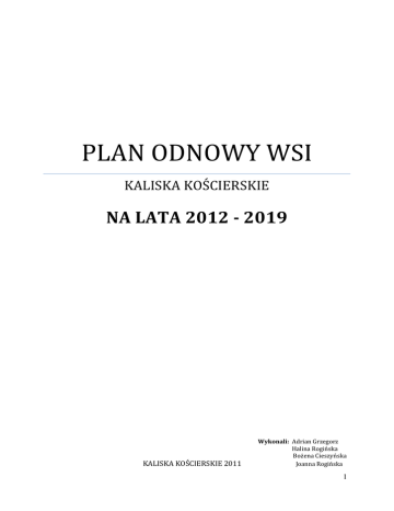PLAN ODNOWY WSI KALISKA KOŚCIERSKIE NA LATA 2012 - 2019 KALISKA KOŚCIERSKIE 2011 Wykonali: Adrian Grzegorz Halina Rogińska Bożena Cieszyńska Joanna Rogińska 1 PLAN ODNOWY WSI KALISKA KOŚCIERSKIE SPIS TREŚCI Wstęp ......................................................................................................................................................................................3 1. Charakterystyka miejscowości................................................................................................................................5 1.1 Historia miejscowości..........................................................................................................................................5 1.2 Struktura miejscowości......................................................................................................................................7 2. Inwentaryzacja zasobów............................................................................................................................................8 2.1 Inwentaryzacja przyrodnicza ...........................................................................................................................8 2.1. Dziedzictwo kulturowe ................................................................................................................................8 2.1.1 Sport i rekreacja……………………………….………………..…………………………………………….……...10 2.2 Infrastruktura techniczna...........................................................................................................................10 2.2.1. Wodociągi..............................................................................................................................................10 2.2.2 Kanalizacja ............................................................................................................................................10 2.2.3 Gospodarka odpadami .....................................................................................................................10 2.2.4 Sieć komunikacyjna...........................................................................................................................10 2.2.5 Elektroenergetyka .............................................................................................................................10 2.2.6 Zaopatrzenie w gaz............................................................................................................................10 2.2.7 Ciepłownictwo.....................................................................................................................................10 2.2.8 Środowisko ...........................................................................................................................................11 2.3 Gospodarka i rolnictwo.............................................................................................................................12 2.3.1. Przedsiębiorczość ..............................................................................................................................12 2.3.2. Rolnictwo...............................................................................................................................................12 2.2.3. Kapitał społeczny...............................................................................................................................14 3. Ocena słabych i mocnych stron ...........................................................................................................................14 4. Wykaz planowanych inwestycji i przedsięwzięćna lata 2012-2019………………………...…………..17 5. Szczegółowy opis działań .......................................................................................................................................19 6. Nasza wizja....................................................................................................................................................................30 2 KSZTAŁTOWANIE WSI Z TRADYCJAMI PLAN ODNOWY WSI KALISKA KOŚCIERSKIE WSTĘP Sołectwo Kaliska Kościerskie to jedno z mniejszych sołectw gminy Kościerzyna, liczące 419 mieszkańców. Położone jest przy drodze krajowej nr 20 i oddalone 7km od miasta Kościerzyna. Położenie wsi w atrakcyjnej, malowniczej okolicy, wśród lasów a jednocześnie stosunkowo blisko od centrum miasta Kościerzyna, daje szansę na rozwój mieszkalnictwa w przyjaznej, spokojnej okolicy, stanowiąc jednocześnie miejsce turystyczno - rekreacyjne. Mieszkańcy sołectwa są dumni ze swojej miejscowości. Chcą żyć w atrakcyjnej, ładnej i przyjaznej wsi. Poprawiając warunki swojego zamieszkania i rozwijając swoją wieś, nie chcą stracić nic z jej kameralności i uroku, a przy okazji zintegrować się - wspólnie działając. Kaliska Kościerskie to niewielka, spokojna, lecz niezbyt bogata miejscowość, położona w pewnej odległości od głównych tras i pasm urbanizacyjnych. Trudno jest sfinansować wszystkie potrzebne mieszkańcom przedsięwzięcia, zatem jedną z dróg do poprawy jakości ich życia oraz tworzenia nowych źródeł utrzymania może być pozyskiwanie funduszy zewnętrznych, w tym z Unii Europejskiej. W związku z czym mieszkańcy opracowali plan odnowy sołectwa. Plan odnowy sołectwa ma też pobudzić mieszkańców do wspólnego działania na rzecz Kalisk Kościerskich. Plan jest dokumentem strategicznym, stworzonym przy znacznym udziale mieszkańców. Określa najważniejsze działania, które sami zainteresowani uznali za istotne dla swojej miejscowości. Działania, które pomogą im rozwiązać problemy, pokonać bariery i osiągnąć stawiane sobie przez nich cele. Proponowane przedsięwzięcia mieszkańcy uznali za realne, możliwe do zrealizowania, przy założeniu także ich własne