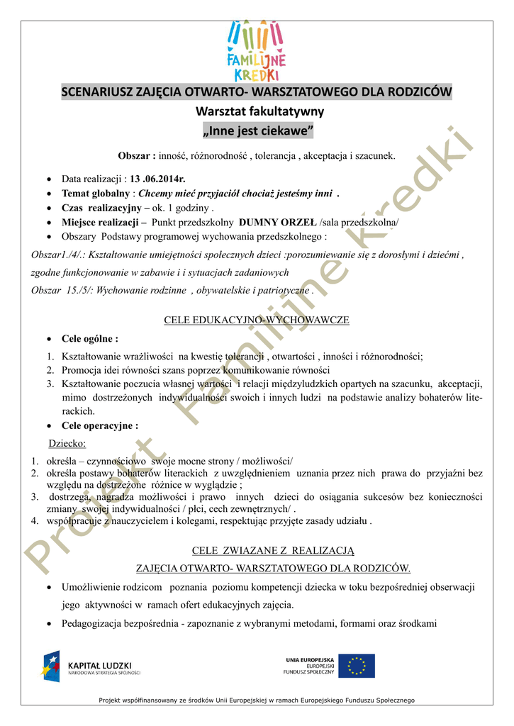 SCENARIUSZ ZAJĘCIA OTWARTO- WARSZTATOWEGO DLA RODZICÓW Warsztat fakultatywny „Inne jest ciekawe” Obszar : inność, różnorodność , tolerancja , akceptacja i szacunek. Data realizacji : 13 .06.2014r. Temat globalny : Chcemy mieć przyjaciół chociaż jesteśmy inni . Czas realizacyjny – ok. 1 godziny . Miejsce realizacji – Punkt przedszkolny DUMNY ORZEŁ /sala przedszkolna/ Obszary Podstawy programowej wychowania przedszkolnego : Obszar1./4/.: Kształtowanie umiejętności społecznych dzieci :porozumiewanie się z dorosłymi i dziećmi , zgodne funkcjonowanie w zabawie i i sytuacjach zadaniowych Obszar 15./5/: Wychowanie rodzinne , obywatelskie i patriotyczne . CELE EDUKACYJNO-WYCHOWAWCZE Cele ogólne : 1. Kształtowanie wrażliwości na kwestię tolerancji , otwartości , inności i różnorodności; 2. Promocja idei równości szans poprzez komunikowanie równości 3. Kształtowanie poczucia własnej wartości i relacji międzyludzkich opartych na szacunku, akceptacji, mimo dostrzeżonych indywidualności swoich i innych ludzi na podstawie analizy bohaterów literackich. Cele operacyjne : Dziecko: 1. określa – czynnościowo swoje mocne strony / możliwości/ 2. określa postawy bohaterów literackich z uwzględnieniem uznania przez nich prawa do przyjaźni bez względu na dostrzeżone różnice w wyglądzie ; 3. dostrzega, nagradza możliwości i prawo innych dzieci do osiągania sukcesów bez konieczności zmiany swojej indywidualności / płci, cech zewnętrznych/ . 4. współpracuje z nauczycielem i kolegami, respektując przyjęte zasady udziału . CELE ZWIAZANE Z REALIZACJĄ ZAJĘCIA OTWARTO- WARSZTATOWEGO DLA RODZICÓW. Umożliwienie rodzicom poznania poziomu kompetencji dziecka w toku bezpośredniej obserwacji jego aktywności w ramach ofert edukacyjnych zajęcia. Pedagogizacja bezpośrednia - zapoznanie z wybranymi metodami, formami oraz środkami Projekt współfinansowany ze środków Unii Europejskiej w ramach Europejskiego Funduszu Społecznego dydaktycznymi, stosowanymi przez nauczyciela w pracy z wychowanka mina rzecz realizacji postulatów wychowawczych i idei równości, tolerancji. Integracja , oparta na zabawie 1. Formy pracy: - zbiorowa (jednorodna) - zespołowa, - indywidualna 2. Środki dydaktyczne: Tekst opow. H.Bechlerowej pt. „O kotku, który szukał czarnego mleka” Prezentacja multimedialna nagrania ( płyta CD), magnetofon, karty pracy „Kocie portrety” dla każdego dziecka , kredki, P r z e b i e g z a j ę c i a: 1. „Iskierka przyjaźni”- rozpoczęcie zajęcia zabawą integrującą (dzieci w kole i zwrócone twarzami do środka koła) .Przy muzyce przekazują sobie „iskierkę przyjaźni” Forma rundki - zabawę rozpoczyna i kończy nauczyciel Iskierkę przyjaźni puszczam w krąg, niech wróci ona do moich rąk. Wyjaśnienie: Teraz ścisnę rękę …., aby przesłać mu iskierkę przyjaźni. ….zrobi to samo. Każdy kto otrzyma uścisk dłoni przekaże go następnej osobie, tak aby ta iskierka wróciła do mnie. Zaczynamy…. 2. O przyjaźni. Słuchanie i oglądanie prezentacji multimedialnej w oparciu o wykorzystanie opowiada. H.Bechlerowej pt. „O kotku , kory szukał czarnego mleka”. Analiza postaw bohaterów , ukierunkowana pytaniami nauczyciela: Czy dwa kotki były takie same? Jakie kolory sierści miały kotki? Czy kotek biały chciał się zmienić? Jaki chciał być ? ( taki sam jak przyjaciel – czarny kotek) Czy kotkowi czarnemu przeszkadzało, że jego przyjaciel jest inny, niż on – że ma białe futerko? Projekt współfinansowany ze środków Unii Europejskiej w ramach Europejskiego Funduszu Społecznego Co powiedział kotek czarny przyjacielowi, gdy dowiedział się ,iż jego przyjaciel chce się zmienić? Czy kotkowi białemu udało się zmienić w kotka czarnego? Jak zakończyła się przygoda białego kotka? Czy kotki łączyła przyjaźń? Czy nadal byli przyjaciółmi? Czy przyjaciele muszą być tacy sami? Czy chcielibyście, aby wszyscy ludzie wyglądali tak samo? 3. „Co potrafią kotki , co potrafią koty” – autoprezentacja ruchowa, werbalna 3.1. Najpierw nauczycielka, potem każde dziecko przedstawia się : „Jestem kotką …. / imię/ Potrafię…. „Jestem kotkiem…./ imię/ Potrafię …” Np. wysoko podskakiwać chodzić jak kotek na czworaka, zamiauczeć ładnie jak kotka / kotek/; ładnie zaśpiewać ; szybko zdjąć i założyć pantofelki ……. W sytuacji braku inwencji własnej dziecka nauczyciel podpowiada propozycje autoprezentacji mocnych stron, pytając : „czy potrafisz ładnie, wysoko …?” Po każdej autoprezentacji grupa bije dziecku brawo. 3.2. „Wszystkie koty potrafią” – zabawa ruchowa z elementami zadaniowości . Nauczycielka prosi, aby : wszystkie kotki i koty zamiauczały głośno, cicho ; wszystkie koty podskoczyły wysoko; wszystkie koty zrobiły ładnie „koci grzbiet”; wszystkie koty zwinęły się w kłębuszek. Po realizacji każdego zadania ruchowego nauczycielka pochwala wszystkie dzieci. Projekt współfinansowany ze środków Unii Europejskiej w ramach Europejskiego Funduszu Społecznego 3.3. Na zakończenie dzieci odpowiadają na pytanie: Czy tylko chłopcy potrafiły podskakiwać? Czy tylko dziewczynki potrafiły ładnie miauczeć jak koty ? Czy wszystkie dzieci potrafią zwinąć się w kłębuszek? Czy dziewczynki i chłopcy potrafią zrobić „koci grzbiet?” 4. „Kocie portrety ”- aktywność plastyczna Zadaniem dzieci jest pokolorowanie „kociego portretu” 5. „Galeria portretów” Aranżacja „galerii” na dywanie – uliczek portretowych. Oglądanie prac. Po wykonaniu zadania nauczyciel pyta : „komu podoba się jego kotek?”; „czy wasze koty są takie same? Czy można poznać, czy portret wykonała dziewczynka lub chłopiec? Wnioski : Nie można odróżnić, kto wykonał „koci portret” – chłopec, czy dziewczynka Każde dziecko potrafiło jak najładniej wykonać „koci portret” . Nie ma znaczenia , czy 