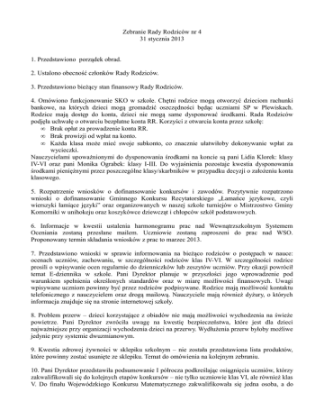 Zebranie Rady Rodziców nr 4 31 stycznia 2013 1. Przedstawiono porządek obrad. 2. Ustalono obecność członków Rady Rodziców. 3. Przedstawiono bieżący stan finansowy Rady Rodziców. 4. Omówiono funkcjonowanie SKO w szkole. Chętni rodzice mogą otworzyć dzieciom rachunki bankowe, na których dzieci mogą gromadzić oszczędności będąc uczniami SP w Plewiskach. Rodzice mają dostęp do konta, dzieci nie mogą same dysponować środkami. Rada Rodziców podjęła uchwałę o otwarciu bezpłatne konta RR. Korzyści z otwarcia konta przez szkołę: • Brak opłat za prowadzenie konta RR. • Brak prowizji od wpłat na konto. • Każda klasa może mieć swoje subkonto, co znacznie ułatwiłoby dokonywanie wpłat za wycieczki. Nauczycielami upoważnionymi do dysponowania środkami na koncie są pani Lidia Klorek: klasy IV-VI oraz pani Monika Ograbek: klasy I-III. Do wyjaśnienia pozostaje kwestia dysponowania środkami pieniężnymi przez poszczególne klasy/skarbników w przypadku decyzji o założeniu konta klasowego. 5. Rozpatrzenie wniosków o dofinansowanie konkursów i zawodów. Pozytywnie rozpatrzono wnioski o dofinansowanie Gminnego Konkursu Recytatorskiego „Łamańce językowe, czyli wierszyki łamiące języki” oraz organizowanych w naszej szkole turniejów o Mistrzostwo Gminy Komorniki w unihokeju oraz koszykówce dziewcząt i chłopców szkół podstawowych. 6. Informacje w kwestii ustalenia harmonogramu prac nad Wewnątrzszkolnym Systemem Oceniania zostaną przesłane mailem. Uczniowie zostaną zaproszeni do prac nad WSO. Proponowany termin składania wniosków z prac to marzec 2013. 7. Przedstawiono wnioski w sprawie informowania na bieżąco rodziców o postępach w nauce: ocenach uczniów, zachowaniu, w szczególności rodziców klas IV-VI. W szczególności rodzice prosili o wpisywanie ocen regularnie do dzienniczków lub zeszytów uczniów. Przy okazji powrócił temat E-dziennika w szkole. Pani Dyrektor planuje w przyszłości jego wprowadzenie pod warunkiem spełnienia określonych standardów oraz w miarę możliwości finansowych. Uwagi wpisywane uczniom powinny być przez rodziców podpisywane. Rodzice mają możliwość kontaktu telefonicznego z nauczycielem oraz drogą mailową. Nauczyciele mają również dyżury, o których informacja znajduje się na stronie internetowej szkoły. 8. Problem przerw – dzieci korzystające z obiadów nie mają możliwości wychodzenia na świeże powietrze. Pani Dyrektor zwróciła uwagę na kwestię bezpieczeństwa, które jest dla dzieci najważniejsze przy organizacji wychodzenia dzieci na przerwy. Wydłużenia przerw byłoby możliwe jedynie przy systemie dwuzmianowym. 9. Kwestia zdrowej żywności w sklepiku szkolnym – nie została przedstawiona lista produktów, które powinny zostać usunięte ze sklepiku. Temat do omówienia na kolejnym zebraniu. 10. Pani Dyrektor przedstawiła podsumowanie I półrocza podkreślając osiągnięcia uczniów, którzy zakwalifikowali się do kolejnych etapów konkursów – nie tylko uczniowie klas VI, ale również klas V. Do finału Wojewódzkiego Konkursu Matematycznego zakwalifikowała się jedna osoba, a do finału Wojewódzkiego Konkursu Przyrodniczego zakwalifikowały się dwie osoby. We wrześniu został odebrany i udostępniony parking dla samochodów, a w listopadzie 2012 został otwarty parking rowerowy na 60 miejsc postojowych. 11. Wolne głosy i wnioski – poruszono sprawę ilości komputerów dla dzieci najmłodszych. W grudniu 2012 zostało zakupionych 5 nowych komputerów, a do grudnia 2013 do każdego ucznia będzie przypisany jeden komputer. Nie ma takich możliwości w klasach I-III.