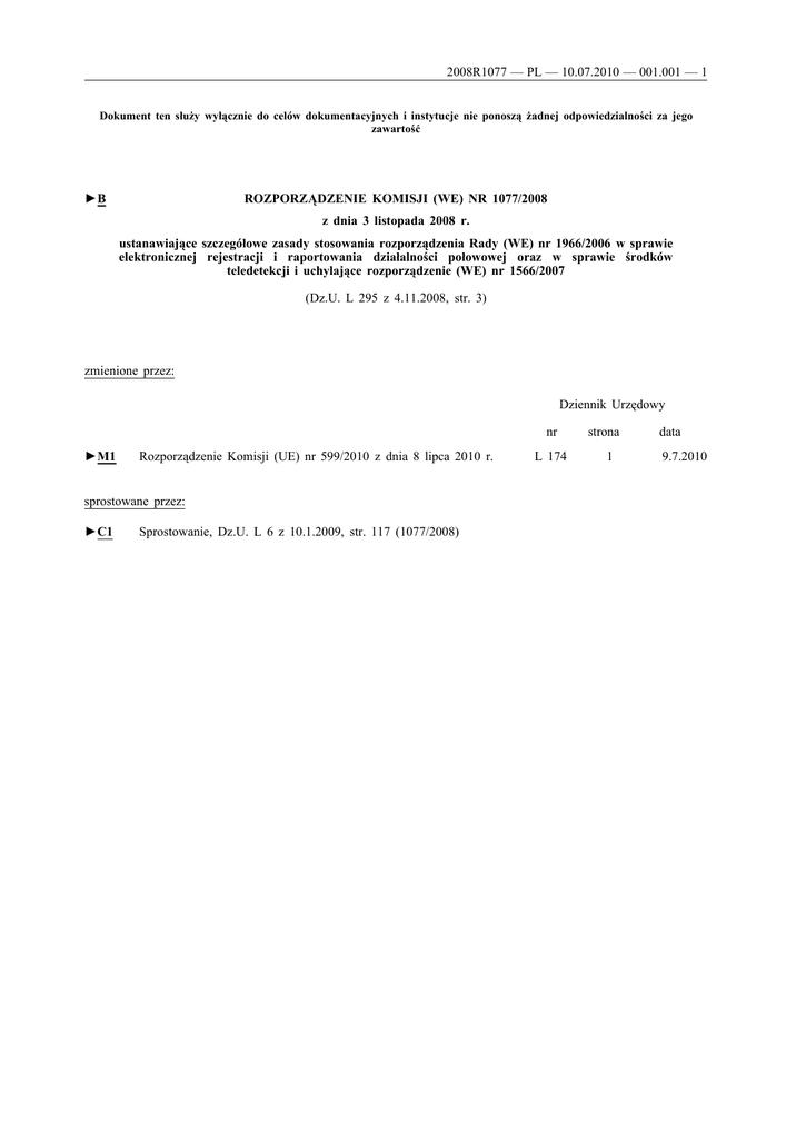 2008R1077 — PL — 10.07.2010 — 001.001 — 1 Dokument ten służy wyłącznie do celów dokumentacyjnych i instytucje nie ponoszą żadnej odpowiedzialności za jego zawartość ROZPORZĄDZENIE KOMISJI (WE) NR 1077/2008 ►B z dnia 3 listopada 2008 r. ustanawiające szczegółowe zasady stosowania rozporządzenia Rady (WE) nr 1966/2006 w sprawie elektronicznej rejestracji i raportowania działalności połowowej oraz w sprawie środków teledetekcji i uchylające rozporządzenie (WE) nr 1566/2007 (Dz.U. L 295 z 4.11.2008, str. 3) zmienione przez: Dziennik Urzędowy nr ►M1 Rozporządzenie Komisji (UE) nr 599/2010 z dnia 8 lipca 2010 r. sprostowane przez: ►C1 Sprostowanie, Dz.U. L 6 z 10.1.2009, str. 117 (1077/2008) L 174 strona 1 data 9.7.2010 2008R1077 — PL — 10.07.2010 — 001.001 — 2 ▼B ROZPORZĄDZENIE KOMISJI (WE) NR 1077/2008 z dnia 3 listopada 2008 r. ustanawiające szczegółowe zasady stosowania rozporządzenia Rady (WE) nr 1966/2006 w sprawie elektronicznej rejestracji i raportowania działalności połowowej oraz w sprawie środków teledetekcji i uchylające rozporządzenie (WE) nr 1566/2007 KOMISJA WSPÓLNOT EUROPEJSKICH, uwzględniając Traktat ustanawiający Wspólnotę Europejską, uwzględniając rozporządzenie Rady (WE) nr 1966/2006 z dnia 21 grudnia 2006 r. w sprawie elektronicznej rejestracji i raportowania działalności połowowej oraz w sprawie środków teledetekcji (1), w szczególności jego art. 5, a także mając na uwadze, co następuje: (1) Artykuł 22 ust. 1 lit. c) rozporządzenia Rady (WE) nr 2371/2002 (2) stanowi, że działalność w ramach wspólnej polityki rybackiej jest zabroniona, gdy kapitan nie rejestruje i nie przekazuje bez zbędnej zwłoki informacji dotyczących działalności połowowej, w tym wyładunków i przeładunków, i gdy kopie rejestru nie są udostępniane władzom. (2) Zgodnie z rozporządzeniem Rady (WE) nr 1966/2006 obowiązek elektronicznej rejestracji i przekazywania danych z dziennika połowowego, deklaracji wyładunkowej i deklaracji przeładun kowej dotyczy kapitanów statków rybackich Wspólnoty o długości całkowitej przekraczającej 24 metry w terminie 24 miesięcy od wejścia w życie przepisów wykonawczych oraz kapi tanów statków rybackich Wspólnoty o długości całkowitej prze kraczającej 15 metrów w terminie 42 miesięcy od wejścia w życie przepisów wykonawczych. (3) Codzienne raportowanie działalności połowowej stwarza poten cjał dla znaczącego zwiększenia skuteczności i efektywności monitorowania, kontroli i nadzoru na morzu i na lądzie. (4) Artykuł 6 rozporządzenia Rady (EWG) nr 2847/93 z dnia 12 października 1993 r. ustanawiającego system kontroli mający zastosowanie do wspólnej polityki rybołówstwa (3) stanowi, że kapitanowie statków rybackich Wspólnoty obowiązani są prowa dzić dziennik połowowy rejestrujący ich działania. (5) Artykuł 8 rozporządzenia Rady (EWG) nr 2847/93 stanowi, że kapitan każdego ze statków rybackich Wspólnoty o całkowitej długości równej lub przekraczającej 10 metrów, bądź jego przed stawiciel, po każdym rejsie w ciągu 48 godzin od wyładunku przedkłada deklarację właściwym organom państwa członkow skiego, w którym ma miejsce wyładunek. (1) Dz.U. L 409 z 30.12.2006, s. 1. Sprostowanie w Dz.U. L 36 z 8.2.2007, s. 3. (2) Dz.U. L 358 z 31.12.2002, s. 59. (3) Dz.U. L 261 z 20.10.1993, s. 1. 2008R1077 — PL — 10.07.2010 — 001.001 — 3 ▼B (6) Artykuł 9 rozporządzenia Rady (EWG) nr 2847/93 stanowi, że przy pierwszej sprzedaży ośrodki aukcyjne lub inne instytucje bądź osoby upoważnione przez państwa członkowskie, które są odpowiedzialne za pierwsze wprowadzenie do obrotu produktów rybołówstwa, przedkładają kartę sprzedaży właściwym organom państwa członkowskiego, na którego terytorium następuje pierwsze wprowadzenie do obrotu. (7) Artykuł 9 rozporządzenia Rady (EWG) nr 2847/93 stanowi również, że w przypadku gdy pierwsze wprowadzenie do obrotu produktów rybołówstwa nie ma miejsca w państwie członkow skim, w którym produkty zostały wyładowane, państwo człon kowskie odpowiedzialne za monitorowanie pierwszego wprowa dzenia do obrotu zapewnia przedłożenie kopii karty sprzedaży możliwie jak najszybciej organom odpowiedzialnym za monito rowanie wyładunku danych produktów. (8) Artykuł 19 rozporządzenia Rady (EWG) nr 2847/93 nakłada na państwa członkowskie obowiązek opracowania komputerowych baz danych i systemu zatwierdzania opartego w szczególności na badaniach potwierdzających oraz weryfikacji danych wynika jących z tych zobowiązań. (9) Artykuły 19b i 19e rozporządzenia Rady (EWG) nr 2847/93 nakładają na kapitanów statków rybackich Wspólnoty obowiązek sporządzania raportów dotyczących nakładu połowowego i odnotowywania ich w swoim dzienniku połowowym. (10) Artykuł 5 rozporządzenia Rady (WE) nr 2347/2002 (1) nakłada na kapitana statku rybackiego Wspólnoty posiadającego pozwolenie na połowy dalekomorskie obowiązek zapisywania, w dzienniku połowowym lub na formularzu dostarczonym przez państwo członkowskie bandery, informacji dotyczących parametrów narzędzi połowowych oraz operacji połowowych. (11) Rozporządzenie Rady (WE) nr 768/2005 (2) ustanawiające Wspólnotową Agencję Kontroli Rybołówstwa oraz zmieniające rozporządzenie (EWG) nr 2847/93 ustanawiające system kontroli mający zastosowanie do wspólnej polityki rybołówstwa przewi duje realizację wspólnych planów rozmieszczenia. (12) Rozporządzenie Rady (WE) nr 1566/2007 (3) ustanowiło szcze gółowe zasady stosowania rozporządzenia Rady (WE) nr 1966/2006 w sprawie elektronicznej rejestracji i raportowania działalności połowowej. (13) W chwili obecnej konieczne jest dodatkowe uszczegółowienie i wyjaśnienie niektórych przepisów rozporządzenia (WE) nr 1566/2007. W tym celu należy uchylić rozporządzenie (WE) nr 1566/2007 i zastąpić je niniejszym nowym rozpo