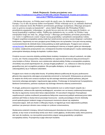 Jakub Majmurek: Zanim przyjmiemy euro http://wiadomosci.wp.pl/kat,141202,title,Jakub-Majmurek-Zanim-przyjmiemyeuro,wid,17786926,wiadomosc.html - Od dawna słyszymy, że Polska musi wejść do strefy euro, by dokończyć integrację z Europą. Czy to aby na pewno dobre rozwiązanie? Wiele wskazuje na to, że zamiana złotówek na euro oznaczać może dla Polaków powtórzenie greckiego scenariusza. Dlaczego przyjęcie euro to gotowa recepta na katastrofę? – pisze Jakub Majmurek dla Wirtualnej Polski i przedstawia argumenty wskazujące, że grecki kryzys jest nie tyle winą samych Greków, co raczej konstrukcji wspólnej waluty. Publicysta zastanawia się, co zrobić, by Polska i inne europejskie kraje nie stały się „drugą Grecją” i dlaczego powinniśmy poważnie przemyśleć, czy warto w najbliższym czasie wiązać naszą gospodarkę z projektem europejskiej waluty. Przyjęcie wspólnej europejskiej waluty miało być zwieńczeniem procesu naszej integracji z zachodem kontynentu. Argumenty na rzecz przyjęcia przez Polskę euro nie są banalne. Euro jest mocną walutą, w przeciwieństwie do złotówki dużo mniej podatną na ataki spekulacyjne. Przyjęcie euro oznacza szereg korzyści dla polskich przedsiębiorstw prowadzących interesy w krajach, gdzie już obowiązuje ta waluta: zwiększenie przejrzystości cen, zmniejszenie kosztów transakcyjnych i ryzyka walutowego, potencjalnie łatwiejszy dostęp do kapitału i rynków zbytu. Przejście na euro znacznie ulżyłoby polskiej klasie średniej z kredytami w obcych walutach, nie tylko w euro, ale i franku szwajcarskim, doprowadziłoby też zapewne do obniżenia stóp procentowych i ceny kredytu w Polsce. Wreszcie, euro ostatecznie zakotwiczałoby Polskę w europejskim projekcie, chroniłoby nas przed zepchnięciem do „Europy drugiej prędkości”, co, zwłaszcza w obecnej sytuacji geopolitycznej, jest szczególnie pożądane. Dla porządku dodajmy, że do przyjęcia euro zobowiązaliśmy się w Traktacie Lizbońskim. Przyjęcie euro niesie ze sobą także koszty. W polskiej debacie publicznej do tej pory podnoszono głównie dwa argumenty zalecające przynajmniej ostrożność w tej kwestii. Wskazywano po pierwsze, że wejście do strefy euro oznacza wyzbycie się tak ważnego elementu polityki państwa, jaką jest tworzenie własnego pieniądza i regulowanie jego podaży. Przekazując te kompetencje Europejskiemu Bankowi Centralnemu, państwo wyzbywa się istotnego elementu własnej suwerenności. Po drugie, podnoszono argument z inflacji. Wprowadzenie euro w wielu krajach wiązało się z zauważalnym, zwłaszcza dla najmniej zarabiających, wzrostem cen na towary codziennej konsumpcji. Na oba te argumenty można dość łatwo odpowiedzieć. W warunkach integracji i finansjalizacji współczesnych rynków możliwość prowadzenia faktycznie suwerennej polityki walutowej przez takie państwo jak Polska w dużej mierze pozostaje iluzoryczna - zasoby pozwalające chronić złotówkę przed spekulacyjnymi atakami mogą w kryzysowym momencie okazać się radykalnie niewystarczające. Jeśli zaś chodzi o inflacyjny impuls, to łagodzić go może odpowiednia polityka państwa i po pewnym okresie czasu zostaje on rynkowo zrównoważony. Wydarzenia ostatnich miesięcy, których kulminacją jest dramatyczny kryzys w Grecji, pokazują jednak, że być może w konstrukcji strefy euro tkwi o wiele głębsza, strukturalna wada, która powinna dać nam do myślenia, czy rzeczywiście powinniśmy wiązać naszą gospodarkę z projektem europejskiej waluty. Przynajmniej w jego obecnym kształcie. Europejska nierównowaga Kryzys strefy euro jest przede wszystkim przedstawiany jako kryzys długu. Długu krajów południa Europy, zarówno zaciągniętego przez ich rządy, jak i podmioty prywatne. To prawda. Niemniej, dług jest symptomem innego, o wiele poważniejszego problemu dręczącego strefę euro, wynikającego z założeń przyjętych przy konstrukcji wspólnej waluty. Tym problemem jest nierównowaga wewnątrz strefy euro między nastawionymi na eksport, gromadzącymi coraz większe nadwyżki, krajami Europy Północno-Zachodniej, a importującymi na swój rynek ich produkty, zadłużającymi się, by je kupić, krajami południa, wpadającymi w coraz większy deficyt obrotów bieżących i dług (zarówno rządowy, jak i sektora prywatnego). Co ma to wspólnego z konstrukcją strefy euro? Strefa ta zestawiała ze sobą radykalnie różniące się od siebie gospodarki. Wystarczy przyjrzeć się mapce przedstawiającej ostatnie dane Eurostatu, przedstawiającej produktywności poszczególnych krajów europejskich, wedle wskaźnika euro na godzinę. Oznacza on wartość wyliczoną w euro, jaką przeciętny pracownik w danej gospodarce wypracowuje w ciągu godziny swojej pracy. Od razu rzuca się w oczy kontrast między południem a północnym zachodem kontynentu – między Francją, Niemcami i krajami Beneluksu z jednej, a Włochami, Grecją, czy Hiszpanią z drugiej. W tej pierwszej grupie produktywność przekracza 40 euro na godzinę, w Belgii osiąga prawie 46 euro. W krajach południa nigdzie nie sięga ona 35 euro, w Grecji wynosi trochę ponad 20, w Portugalii nieco ponad 17. Co dzieje się, gdy w ramach jednej waluty zestawiamy ze sobą tak odmienne gospodarczo obszary? Kraje o mniejszej produktywności odnotowywać będą coraz większy deficyt obrotów bieżących w handlu z obszarami bardziej produktywnymi. W „normalnych” warunkach broniłyby się one przed nim przez takie narzędzia jak cła. W ostatecznym wypadku pozostałoby im obniżenie wartości ich narodowych walut – co zwiększa konkurencyjność ich eksportu i obniża zyski eksporterów z krajów o bardziej produktywnej gospodarce. Strefa euro zabezpieczyła takie kraje jak Niemcy czy Holandia przed taką ewentualnością. Stworzyła olbrzymi, pozbawiony celnych i pozacelnych barier rynek zbytu, gdzie zyskom eksporterów nie zagraża możliwość utraty