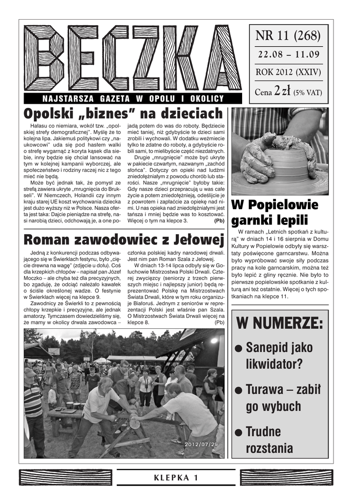 NR 11 (268) 22.08 – 11.09 ROK 2012 (XXIV) Cena N A J S TA R S Z A G A Z E TA W O P O L U I O K O L I C Y 2z∏ (5% VAT) Opolski „biznes” na dzieciach Ha∏asu co niemiara, wokó∏ tzw. „opolskiej strefy demograficznej”. MyÊl´ ˝e to kolejna lipa. JakiemuÊ politykowi czy „naukowcowi” uda si´ pod has∏em walki o stref´ wygarnàç z koryta kàsek dla siebie, inny b´dzie si´ chcia∏ lansowaç na tym w kolejnej kampanii wyborczej, ale spo∏eczeƒstwo i rodziny raczej nic z tego mieç nie b´dà. Mo˝e byç jednak tak, ˝e pomys∏ ze strefà zawiera ukryte „mrugni´cia do Brukseli”. W Niemczech, Holandii czy innym kraju starej UE koszt wychowania dziecka jest du˝o wy˝szy ni˝ w Polsce. Nasza oferta jest taka: Dajcie pieniàdze na stref´, nasi narobià dzieci, odchowajà je, a one po- jadà potem do was do roboty. B´dziecie mieç taniej, ni˝ gdybyÊcie te dzieci sami zrobili i wychowali. W dodatku weêmiecie tylko te zdatne do roboty, a gdybyÊcie robili sami, to mielibyÊcie cz´Êç niezdatnych. Drugie „mrugni´cie” mo˝e byç ukryte w pakiecie czwartym, nazwanym „zachód s∏oƒca”. Dotyczy on opieki nad ludêmi zniedo∏´˝nia∏ym z powodu chorób lub staroÊci. Nasze „mrugni´cie” by∏oby takie: Gdy nasze dzieci przepracujà u was ca∏e ˝ycie a potem zniedo∏´˝niejà, odeÊlijcie je z powrotem i zap∏açcie za opiek´ nad nimi. U nas opieka nad zniedo∏´˝nia∏ymi jest taƒsza i mniej b´dzie was to kosztowaç. Wi´cej o tym na klepce 3. (Pb) Roman zawodowiec z Je∏owej Jednà z konkurencji podczas odbywajàcego si´ w Âwierklach festynu, by∏o „ci´cie drewna na wag´” (zdj´cie u do∏u). CoÊ dla krzepkich ch∏opów – napisa∏ pan Józef Moczko – ale chyba te˝ dla precyzyjnych, bo zgaduj´, ˝e odciàç nale˝a∏o kawa∏ek o ÊciÊle okreÊlonej wadze. O festynie w Âwierklach wi´cej na klepce 9. Zawodnicy ze Âwierkli to z pewnoÊcià ch∏opy krzepkie i precyzyjne, ale jednak amatorzy. Tymczasem dowiedzieliÊmy si´, ˝e mamy w okolicy drwala zawodowca – cz∏onka polskiej kadry narodowej drwali. Jest nim pan Roman Szala z Je∏owej. W dniach 13-14 lipca odby∏y si´ w Go∏uchowie Mistrzostwa Polski Drwali. Czterej zwyci´zcy (seniorzy z trzech pierwszych miejsc i najlepszy junior) b´dà reprezentowaç Polsk´ na Mistrzostwach Âwiata Drwali, które w tym roku organizuje Bia∏oruÊ. Jednym z seniorów w reprezentacji Polski jest w∏aÊnie pan Szala. O Mistrzostwach Âwiata Drwali wi´cej na klepce 8. (Pb) KLEPKA 1 W Popielowie garnki lepili W ramach „Letnich spotkaƒ z kulturà” w dniach 14 i 16 sierpnia w Domu Kultury w Popielowie odby∏y si´ warsztaty poÊwi´cone garncarstwu. Mo˝na by∏o wypróbowaç swoje si∏y podczas pracy na kole garncarskim, mo˝na te˝ by∏o lepiç z gliny r´cznie. Nie by∏o to pierwsze popielowskie spotkanie z kulturà ani te˝ ostatnie. Wi´cej o tych spotkaniach na klepce 11. W NUMERZE: ● Sanepid jako likwidator? ● Turawa – zabi∏ go wybuch ● Trudne rozstania F A K T Y * Brakuje ju˝ tym na górze ● Podczas zakoƒczonej w∏aÊnie olimpiady w Londynie o pierwsze miejsce w klasyfikacji medalowej walczy∏y USA i Chiny. Wi´cej medali zdobyli zawodnicy z USA – 46 z∏otych a 104 wszystkich. Chiƒskim zawodnikom przypad∏o tylko 38 z∏otych, a wszystkich razem 87. Polska zdoby∏a 2 z∏ote medale a 10 wszystkich. Wyprzedzili nas nawet cztery razy mniejsi sàsiedzi, tacy jak Czechy (4 z∏ote, 10 wszystkich) i Bia∏oruÊ (2 z∏ote, 12 wszystkich). ● W dawnych czasach walka o pierwsze miejsce w olimpijskiej klasyfikacji medalowej toczy∏a si´ mi´dzy USA i ZSRR. DziÊ ZSRR nie istnieje, ale jest 15 paƒstw, na które si´ rozpad∏. Te 15 paƒstw zdoby∏o razem 47 z∏otych i 161 wszystkich medali. W klasyfikacji medalowej londyƒskiej olimpiady nieistniejàcy ZSRR mia∏by zatem pierwsze miejsce. ● GUS opublikowa∏ dane o lipcowym zatrudnieniu i wynagrodzeniach w sektorze przedsi´biorstw (obejmuje on oko∏o 40 proc. zatrudnionych). W okresie styczeƒlipiec uby∏o 22 tys. zatrudnionych (w analogicznym okresie 2011 przyby∏o 27 tys.). Przeci´tne wynagrodzenie nominalne ogó∏em by∏o w lipcu 2012 wy˝sze o 2,4 proc. ni˝ w lipcu 2011. Przy inflacji 4,0 proc. oznacza to, ˝e realnie wynagrodzenia zmala∏y o 1,5 proc. ● Tegoroczne zbiory rzepaku nie przekroczà 1,6 mln ton i b´dà ni˝sze o oko∏o 15 proc. ni˝ rok temu, gdy rzepaku by∏o i tak za ma∏o jak na potrzeby polskich zak∏adów t∏uszczowych. Ich przedstawiciele zapowiadajà, ˝e b´dà musieli w tym roku dokupiç za granicà nawet 400 tys. ton surowca. ● PKB w drugim kwartale 2012 by∏ w UE27 ni˝szy o 0,3 proc. ni˝ w pierwszym kwartale 2012, poinformowa∏ Eurostat. Nie ma zatem formalnej recesji (dwa kolejne kwarta∏y spadku PKB), gdy˝ w pierwszym kwartale 2012 PKB by∏ taki sam jak w IV kwartale 2011. Poniewa˝ jednak w IV kwartale 2011 by∏ spadek o 0,3 proc. wzgl´dem trzeciego kwarta∏u 2011, to faktycznie UE-27 jest dziÊ w recesji ju˝ od blisko roku. * Wersja faktów obowiàzujàca w dniu zamkni´cia tego wydania „Beczki”. Âwiat rwie do przodu, gospodarki kwitnà, a˝ mi∏o patrzeç. Nie chodzi mi tylko o nieustanny, imponujàcy wzrost Chin, ale tak˝e o inne paƒstwa Azji, Afryki i Ameryki ¸aciƒskiej. Wed∏ug CIA Polska w 2011 nie mia∏a rewelacyjnego wzrostu gospodarczego, ale by∏o ca∏kiem przyzwoite 4,4 proc. Wystarczy∏o to jednak na zaledwie 85 miejsce wÊród 216 sklasyfikowanych paƒstw. Gdyby liczyç po liczbie ludnoÊci, to w 2011 wi´kszoÊç Êwiata rozwija∏a si´ szybciej ni˝ Polska. W 2012, a tym bardziej w 2013, na uk∏adanej przez CIA liÊcie rankingowej paƒstw wed∏ug wzrostu PKB pójdziemy prawdopodobnie mocno w dó∏ i ju˝ nie wi´kszoÊç, ale przyt∏aczajàca wi´kszoÊç Êwiata b´dzie si´ rozwijaç szybciej ni˝ my. Minister finansów „optymistycznie” deklaruje jednak, ˝e w 2013 polska gospodarka n