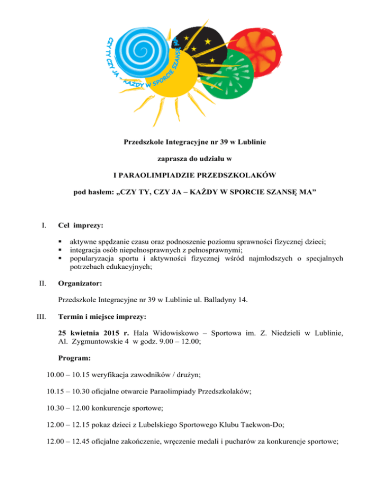 Przedszkole Integracyjne nr 39 w Lublinie zaprasza do udziału w I PARAOLIMPIADZIE PRZEDSZKOLAKÓW pod hasłem: „CZY TY, CZY JA – KAŻDY W SPORCIE SZANSĘ MA” I. Cel imprezy: II. aktywne spędzanie czasu oraz podnoszenie poziomu sprawności fizycznej dzieci; integracja osób niepełnosprawnych z pełnosprawnymi; popularyzacja sportu i aktywności fizycznej wśród najmłodszych o specjalnych potrzebach edukacyjnych; Organizator: Przedszkole Integracyjne nr 39 w Lublinie ul. Balladyny 14. III. Termin i miejsce imprezy: 25 kwietnia 2015 r. Hala Widowiskowo – Sportowa im. Z. Niedzieli w Lublinie, Al. Zygmuntowskie 4 w godz. 9.00 – 12.00; Program: 10.00 – 10.15 weryfikacja zawodników / drużyn; 10.15 – 10.30 oficjalne otwarcie Paraolimpiady Przedszkolaków; 10.30 – 12.00 konkurencje sportowe; 12.00 – 12.15 pokaz dzieci z Lubelskiego Sportowego Klubu Taekwon-Do; 12.00 – 12.45 oficjalne zakończenie, wręczenie medali i pucharów za konkurencje sportowe; IV. Regulamin I Paraolimpiady Przedszkolaków: 1. Paraolimpiada Przedszkolaków adresowana jest do dzieci uczęszczających do przedszkoli integracyjnych, przedszkoli z oddziałami integracyjnymi oraz przedszkoli specjalnych, na terenie miasta Lublin. 2. Zainteresowane przedszkola wypełniają kartę zgłoszenia podając w niej 8 – osobowe zespoły dzieci o specjalnych potrzebach edukacyjnych – drużynę sportową /załącznik nr 1 do regulaminu/. 3. Kartę zgłoszenia należy dostarczyć do 04 kwietnia 2016 r. do przedszkola osobiście lub drogą e-mail: ul. Balladyny 14 Lublin lub [email protected] 4. Udział w imprezie jest bezpłatny. 5. W Paraolimpiadzie mogą uczestniczyć dzieci w wieku przedszkolnym, z każdym rodzajem niepełnosprawności. 6. Rodzice dzieci niepełnosprawnych, biorących udział w I Paraolimpiadzie Przedszkolaków zobowiązani są wyrazić zgodę na uczestnictwo swojego dziecka w olimpiadzie /załącznik nr 2 do regulaminu/. 7. Każdy uczestnik / drużyna jest zobowiązana do przybycia na Paraolimpiadę z opiekunami. 8. Każdy uczestnik Paraolimpiady uczestniczy w zmaganiach sportowych pod bezpośrednią opieką swojego opiekuna, który ponosi za niego pełną odpowiedzialność. 9. Organizator nie przyjmuje na siebie żadnej odpowiedzialności za problemy wynikłe ze złego stanu zdrowia uczestników. 10. Każda drużyna sportowa wybiera spośród swoich członków kapitana. Kapitan stoi na czele drużyny i zawsze zaczyna daną konkurencję. 11. Udział w Paraolimpiadzie jest jednocześnie zgodą na przetwarzanie danych osobowych uczestników i ich opiekunów zgodnie z Ustawą o Ochronie Danych Osobowych. 12. Uczestnicy imprezy są zobowiązani do stosowania się do poleceń porządkowych wydawanych przez służby porządkowe organizatora, służby informacyjne, przedstawicieli organizatora, a w przypadku interwencji funkcjonariuszy Policji, Straży Pożarnej lub pracowników innych uprawnionych służb i organów do wykonywania ich poleceń. 13. Wejście na teren obiektu w okresie trwania imprezy stanowi jednocześnie zgodę uczestnika imprezy ich opiekunów, na nieodpłatne utrwalanie i nieodpłatne wykorzystanie swojego wizerunku w związku z produkcją, prezentowaniem, reklamowaniem lub używaniem filmu, zapisu wideo i audio z imprezy w przekazach medialnych, na Facebook /załącznik nr 3 do regulaminu/. 14. Impreza jest bezpłatna i dostępna dla każdej osoby fizycznej zainteresowanej wydarzeniem pod warunkiem zaakceptowania zasad niniejszego regulaminu oraz przestrzegania zasad bezpieczeństwa i porządku na terenie obiektu. 15. Organizator zapewnia uczestnikom pakiety startowe oraz nagrody – upominki, za których sprawność nie przyjmuje odpowiedzialności. 16. Organizator zastrzega sobie prawo interpretacji niniejszego regulaminu i jest jedyną władzą upoważnioną do rozpatrywania i rozstrzygania wszelkich rozbieżności i wątpliwości, które mogą powstać przy stosowaniu i interpretacji niniejszego regulaminu i innych przepisów. 17. Organizator nie bierze na siebie odpowiedzialności i nie może być pociągnięty do odpowiedzialności za szkody osobowe, rzeczowe, straty i zniszczenia spowodowane przez uczestnika we własnych dobrach czy wobec innych uczestników czy osoby trzeciej. 18. Prowadzenie akcji reklamowych i promocyjnych w czasie trwania imprezy wymaga zgody organizatora i musi być ściśle z nim ustalone. 19. Wszystkie uwagi i wątpliwości rozstrzyga organizator imprezy. 20. Organizator nie ponosi odpowiedzialności za rzeczy Uczestników zagubione podczas udziału w imprezie. 21. Każda drużyna, reprezentująca swoją placówkę wraz z opiekunami, zobowiązana jest do przygotowania i wystąpienia w jednolitych strojach sportowych (koszulki, spodenki, skarpetki). 22. W konkurencjach sportowych paraolimpiady uczestnikowi może udzielać pomocy w wykonaniu danego zadania opiekun. 23. Rozgrywki Paraolimpiady Przedszkolaków obejmują 10 konkurencji sportowych /załącznik nr 4 do regulaminu/: „Rzut do kosza”; „Turlanie piłki w rzędach”; „Hula – hop górą”; „Bieg sztafetowy „Mini hokej”; „Bieg z rakietką’; „Wyścig na kocykach”; „Kręgle” „Przejście przez tunel”; „Mini mecz Bocci”. 24. Organizator zastrzega sobie możliwość zmiany regulaminu. SERDECZNIE ZAPRASZAMY