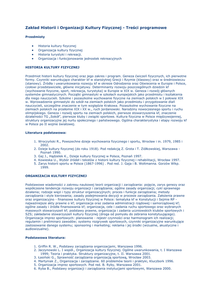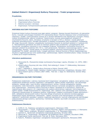 Zakład Historii i Organizacji Kultury Fizycznej - Treści programowe Przedmioty • • • • Historia kultury fizycznej Organizacja kultury fizycznej Historia turystyki i rekreacji. Organizacja i funkcjonowanie jednostek rekreacyjnych HISTORIA KULTURY FIZYCZNEJ Przedmiot historii kultury fizycznej oraz jego zakres i program. Geneza ćwiczeń fizycznych, ich pierwotne formy. Czynniki warunkujące charakter kf w starożytnej Grecji i Rzymie (klasowy) oraz w średniowieczu (stanowy). Źródła i uwarunkowania rozwoju kf w okresie Odrodzenia oraz Oświecenia w Europie i Polsce, czołowi przedstawiciele, główne inicjatywy. Determinanty rozwoju poszczególnych dziedzin kf (wychowanie fizyczne, sport, rekreacja, turystyka) w Europie w XIX w. Geneza i rozwój głównych systemów gimnastycznych. Początki gimnastyki w szkołach europejskich jako przedmiotu i kształcenia dla niego nauczycieli. Szkolne i pozaszkolne wychowanie fizyczne na ziemiach polskich w I połowie XIX w. Wprowadzenie gimnastyki do szkół na ziemiach polskich jako przedmiotu i przygotowanie dlań nauczycieli, szczególne znaczenie w tym względzie Krakowa. Pozaszkolne wychowanie fizyczne na ziemiach polskich na przełomie XIX i XX w., ruch jordanowski. Narodziny nowoczesnego sportu i ruchu olimpijskiego. Geneza i rozwój sportu na ziemiach polskich, pierwsze stowarzyszenia kf, znaczenie działalności TG „Sokół”, pierwsze kluby i związki sportowe. Kultura fizyczna w Polsce międzywojennej, struktury organizacyjne jej nurtu społecznego i państwowego. Ogólna charakterystyka i etapy rozwoju kf w Polsce po II wojnie światowej. Literatura podstawowa: 1. Wroczyński R., Powszechne dzieje wychowania fizycznego i sportu, Wrocław i in. 1979, 1985 i 2002. 2. Dzieje kultury fizycznej (do roku 1918). Pod redakcją Z. Grota i T. Ziółkowskiej, Warszawa Poznań 1990. 3. Gaj J., Hądzelek K., Dzieje kultury fizycznej w Polsce, Poznań 1997. 4. Kowieska U., Wybór źródeł i tekstów z historii kultury fizycznej i rehabilitacji, Wrocław 1997. 5. Zarys historii sportu w Polsce (1867-1996) . Pod red. J. Gaja i B. Woltmanna. Gorzów Wlkp. 1999. ORGANIZACJA KULTURY FIZYCZNEJ Podstawowe wiadomości z zakresu naukowej teorii organizacji i zarządzania: pojęcie, zarys genezy oraz współczesne tendencje rozwoju organizacji i zarządzania; ogólne zasady organizacji; cykl sprawnego działania; rodzaje więzi i typy struktur organizacyjnych; proces i funkcje zarządzania; metody zarządzania i style kierowania; zasady podejmowania decyzji w procesie zarządzania. Założenia prawne oraz organizacyjno - finansowe kultury fizycznej w Polsce: tematyka kf w Konstytucji i Sejmie RP najważniejsze akty prawne o kf; organizacja oraz zadania administracji rządowej i samorządowej kf; ogólne zasady i źródła finansowania kf; organizacja, cele i zadania ruchu sportowego oraz wybranych masowych stowarzyszeń kf; podstawy prawne, organizacja i zadania uczniowskich klubów sportowych i SZS; zakładanie stowarzyszeń kultury fizycznej (droga od pomysłu do zebrania konstytuującego). Organizacja imprez sportowych: planowanie - rejestr czynności oraz harmonogram ich realizacji; regulamin i preliminarz zawodów; systemy rozgrywek sportowych, czynniki organizacyjne warunkujące zastosowanie danego systemu; sponsoring i marketing; reklama i jej środki (wizualne, akustyczne i audiowizualne). Podstawowa literatura: 1. Griffin R. W., Podstawy zarządzania organizacjami, Warszawa 1996. 2. Jaczynowski L. I współ., Organizacja kultury fizycznej. Ogólne uwarunkowania, t. I Warszawa 1999; Teoria i praktyka. Struktury organizacyjne, t. II. Warszawa 2001. 3. Łasiński G., Sprawność zarządzania organizacją sportową, Wrocław 2003. 4. Martyniak Z., Organizacja i zarządzanie. 60 problemów teorii i praktyki, Kluczbork 1996. 5. Organizacja imprez sportowych. Pod red. B. Ryby, Warszawa 2001. 6. Ryba B., Podstawy organizacji i zarządzania instytucjami sportowymi, Warszawa 2000. 7. Sawicki W., Podstawy organizacyjno – prawne i finansowe stowarzyszeń kultury fizycznej w Polsce, Warszawa 1997. 8. Sawicki W., Szkolne stowarzyszenia kultury fizycznej, Warszawa 1997. 9. Stoner J. A. F., Wankler C., Kierowanie, Warszawa 1997. 10. Wyżnikiewicz – Kopp Z., Boruszczak M., Marciszewska B., Wybrane zagadnienia menedżmentu sportowego, Gdańsk 1996. 11. Zarządzanie. Pod redakcją A. K. Koźmińskiego, Warszawa 1997. HISTORIA TURYSTYKI I REKREACJI Przedmiot historii turystyki i rekreacji oraz jego zakres i program. Dzieje podróżowania w starożytnej Grecji i Rzymie. Ruch pielgrzymkowy w średniowieczu. Źródła i uwarunkowania peregrynacji i rekreacji w okresie Odrodzenia i Oświecenia w Europie i Polsce; odkrywcy i najważniejsze wyprawy. Czynniki rozwoju turystyki i rekreacji w XIX w. Geneza nowożytnej turystyki. Powstanie ratownictwa i przewodnictwa górskiego. Ewolucja turystyki uzdrowiskowej i sportowej. Organizacje turystyczno - krajoznawcze na ziemiach polskich. Przewodniki i czasopiśmiennictwo podróżniczo-turystyczne. Polskie obyczaje i zwyczaje rekreacyjne w okresie zaborów. Ruch rekreacyjny na ziemiach polskich pod zaborami. Kultura czasu wolnego. Etyczne podstawy gier rekreacyjnych i turystyki. Turystyka i rekreacja w Drugiej Rzeczypospolitej. Wybrane uwarunkowania rozwoju turystyki i rekreacji w Polsce po II wojnie światowej. Podstawowa literatura: • • • • • • • Dudek D., Materiały pomocnicze do ćwiczeń z historii rekreacji ruchowej, Kraków 2005. Gaj J., Zarys historii turystyki w Polsce, Warszawa 2003. Kulczycki Z., Historia turystyki, Warszawa 1982. Kulczycki Z., Zarys historii turystyki w Polsce, Warszawa 1977. Lewan M., Zarys dziejów turystyki w Polsce, Kraków 2004. Stecka Z., Historia przewodnictwa tatrzańskiego, Kraków 1995. Wroczyński R., Powszechne dzieje wychowania fizycznego i sportu, Wrocław 1985. Organizacja i funkcjonowanie jednostek rekreacyjnych Podstawy prawne zawodu „magister turystyki i r