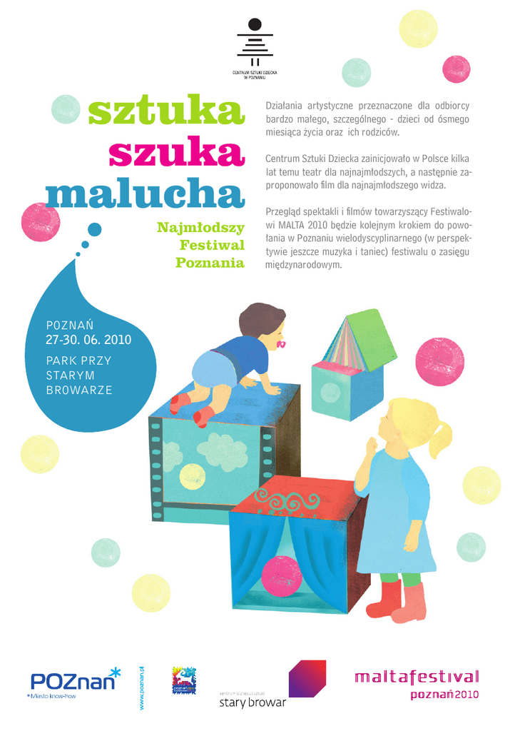 sztuka szuka malucha Najmłodszy Festiwal Poznania POZNAŃ 27-30. 06. 2010 PARK PRZY STARYM BROWARZE Działania artystyczne przeznaczone dla odbiorcy bardzo małego, szczególnego - dzieci od ósmego miesiąca życia oraz ich rodziców. Centrum Sztuki Dziecka zainicjowało w Polsce kilka lat temu teatr dla najnajmłodszych, a następnie zaproponowało film dla najnajmłodszego widza. Przegląd spektakli i filmów towarzyszący Festiwalowi MALTA 2010 będzie kolejnym krokiem do powołania w Poznaniu wielodyscyplinarnego (w perspektywie jeszcze muzyka i taniec) festiwalu o zasięgu międzynarodowym. sztuka szuka malucha Najmłodszy Festiwal Poznania 27 czerwca 2010 godz. 10.00 / 11.30 / 15.00 Błękitne niebo (O Himmel blau) - teatr Dźwięk, linia, koło, nuta, słowo. Ciąg nieustających odkryć: małe i duże, mężczyzna i kobieta, ty i ja, linia i koło. I jeszcze człowiek tęskniący za bratnią duszą. Spektakl powstał w kooperacji Teatru Helios w Hamm i aktorki Ani Michaelis z Berlina / Reżyseria: Barbara Kölling / Występuje: Ania Michaelis / Dla dzieci od 2 lat Kino Najnajmłodszego Widza Kino najnajmłodszego widza to wyjątkowe seanse, przygotowane specjalnie z myślą o bardzo małych dzieciach i ich rodzicach. Starannie dobrane filmy maluchy oglądają w przyjaznych warunkach: siedząc na poduchach, blisko rodziców, w zaledwie przyciemnionym pomieszczeniu, z pluszakami lub zabawkami. W świat kina wprowadza je aktor lub aktorka, wcielający się w rolę alekinowych cioci i wujka. Każdy seans trwa do 40 minut. Beztroski (Les SanSoucis) - film Każdego dnia Beztroski zwalczają swoje małe zmartwienia za pomocą dobrego humoru i drobnych uszczypliwości. Zwierzątka w kolejnych epizodach muszą poradzić sobie z sytuacjami z codziennego życia. Ponadczasowe, zabawne, kolorowe i poetyckie bajki uczące dzieci przebywania w grupie, odkrywania świata natury, wrażliwości i kreatywności. Catherine Le Guen, Caroline Desnoettes, Jean Philippe Grédigui Francja 2008 / Dla dzieci do 4 lat godz. 16.30 Beztroski 1 (Les SanSoucis): Felicjan bada mleko, Horacy jest głodny, Petronela ma kłopoty z pamięcią, Sowa jest fajowa. godz. 17.30 Beztroski 2 (Les SanSoucis): Hilary jest smutny, Malwina szuka zielonej trawki, Horacy i biedronka, Barnaba ma ładny szaliczek. 28 czerwca 2010 godz. 15.00 / 16.30 / 17.30 Ty i ja - teatr godz. 10.00 Punktem wyjścia jest podkreślenie znaczenia własnego JA w postrzeganiu świata, a zarazem ukazanie zależności pomiędzy moim JA i JA innych. Przedstawienie oparte na prostych zabawach wynikających z przeciwieństw: zakryte – odkryte; jasne – ciemne; głośne – ciche; śmieszne – smutne... Studio Teatralne Blum / Scenariusz, reżyseria, oprawa plastyczna, dźwiękowa oraz wykonanie: Katarzyna Pawłowska i Lucyna Winkel / Muzyk: Robert Rekiel / Pedagog teatralny: Zofia Michalik Dla dzieci do 3 lat Beztroski 1 (Les SanSoucis) godz 11.30 Beztroski 2 (Les SanSoucis) 29 czerwca 2010 godz. 15.00 / 16.30 / 17.30 godz. 10.00 Jabłonka - teatr Prosta opowieść o jabłonce, na której zakwita czerwono-zielone jabłko. Pieje kogut, zawiał wiatr - kto zerwie jabłko z jabłonki? Spektakl wypełniony śpiewem, tańcem i ludowymi zabawami. Teatr ATOFRI / Scenariusz: Beata Bąblińska, Grażyna Grobelna, Monika Kabacińska / Reżyseria i wykonanie: Beata Bąblińska, Monika Kabacińska / Scenografia i kostiumy: Izabella Rybacka / Muzyka: Maciej Rychły / Struny preparowane: Marta Pietra Dla dzieci od 1 do 5 lat Beztroski 2 (Les SanSoucis) godz 11.30 Beztroski 1 (Les SanSoucis) 30 czerwca 2010 godz. 10.00, 11.30, 15.00 W szufladzie - teatr Magiczna linii oddzielająca Tu i Tam, świat realny od świata teatru. Tajemnicze komódki i szuflady, a w każdej z nich mieszka jeden z żywiołów. Teatr Poddańczy / reżyseria: Honorata Mierzejewska-Mikosza / muzyka: Iga Mierzejewska / występują: Ewa Mrówczyńska i Agata Butwiłowska / Dla dzieci od 1 do 3 lat Przedsprzedaż i sprzedaż biletów przed pawilonem (park przy Starym Browarze) od 27. 06 od godz. 9.00. Cena biletu 5 zł.