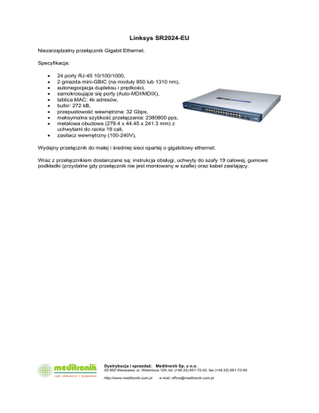 Linksys SR2024-EU Niezarządzalny przełącznik Gigabit Ethernet. Specyfikacja: • • • • • • • • • • 24 porty RJ-45 10/100/1000, 2 gniazda mini-GBIC (na moduły 850 lub 1310 nm), autonegocjacja dupleksu i prędkości, samokrosujące się porty (Auto-MDI/MDIX), tablica MAC: 4k adresów, bufor: 272 kB, przepustowość wewnętrzna: 32 Gbps, maksymalna szybkość przełączania: 2380800 pps, metalowa obudowa (279.4 x 44.45 x 241.3 mm) z uchwytami do racka 19 cali, zasilacz wewnętrzny (100-240V), Wydajny przełącznik do małej i średniej sieci opartej o gigabitowy ethernet. Wraz z przełącznikiem dostarczane są: instrukcja obsługi, uchwyty do szafy 19 calowej, gumowe podkładki (przydatne gdy przełącznik nie jest montowany w szafie) oraz kabel zasilający. Dystrybucja i sprzedaż: Meditronik Sp. z o.o. 02-952 Warszawa, ul. Wiertnicza 129, tel. (+48 22) 651-72-42, fax (+48 22) 651-72-46 http://www.meditronik.com.pl e-mail: [email protected]