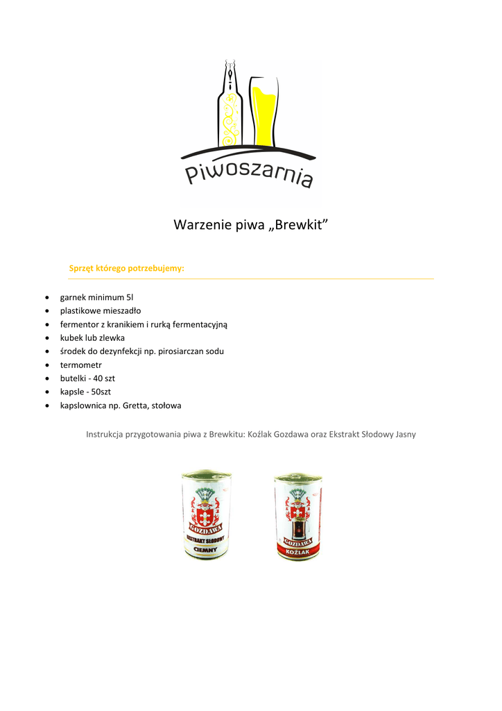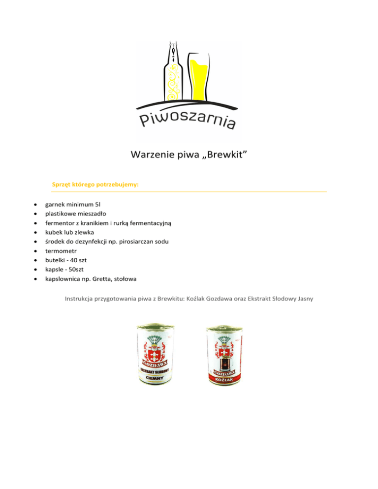Warzenie piwa „Brewkit” Sprzęt którego potrzebujemy: • • • • • • • • • garnek minimum 5l plastikowe mieszadło fermentor z kranikiem i rurką fermentacyjną kubek lub zlewka środek do dezynfekcji np. pirosiarczan sodu termometr butelki - 40 szt kapsle - 50szt kapslownica np. Gretta, stołowa Instrukcja przygotowania piwa z Brewkitu: Koźlak Gozdawa oraz Ekstrakt Słodowy Jasny Przygotowanie brzeczki do fermentacji 1. Fermentor umyj i zdezynfekuj. Zrób to zgodnie z instrukcją na opakowaniu środka do dezynfekcji. 2. Z puszki zdejmij wieko i wyjmij drożdże. Zedrzyj papierową obwolutę. 3. Zamkniętą puszkę z ekstraktem włóż na 10 minut do naczynia (zlewu) z gorącą wodą (ma to na celu upłynnienie zawartości, co ułatwi nam jej wydobycie) 4. Do wyparzonego kubka wlej około 100ml przegotowanej, wystudzonej wody (poniżej 30 0C) wody, wsyp drożdże, nie mieszaj, przykryj kubek folią aluminiową. 5. Do garnka nalej 2,5-3l ciepłej wody dodaj ekstrakt niechmielony. Pamiętaj aby ciągle mieszać! (zamiast ekstraktu słodowego można użyć glukozę która złagodzi smak piwa bardzo łatwo się rozpuszcza i jest całkowicie fermentowalna, lub ekstrakt słodowy w proszku dzięki któremu uzyskasz prawdziwie pełne piwo o 100% naturalny charakterze). Kiedy ekstrakt niechmielony rozpuści się w wodzie wlej do garnka zawartość puszki, gotuj całość 10-15 minut mieszając tak aby nie przypalić brzeczki (gotowanie brzeczki nie jest konieczne gdyż koncentrat jest gotowany przed puszkowaniem jednak zagotowanie roztworu zmniejszy szanse zakażenia brzeczki, a w żaden sposób nie wpłynie negatywnie na późniejszą jakość piwa). 6. Przelej zawartość garnka do zdezynfekowanego fermentora i uzupełnij zimną wodą do 21l. Wystarczy zwykła kranówka. Jeśli obawiasz się o jakość mikrobiologiczną swojej wody, to możesz ją przegotować i wystudzić. Możesz też użyć wody mineralnej z marketu. Brzeczkę trzeba napowietrzyć, więc dobrze jest całość intensywnie mieszać. II. Fermentacja brzeczki. (czas trwania od 5-7dni) 1. Zamieszaj drożdże w kubku, zamierzając nim lekko. Sprawdź temperaturę przygotowanej brzeczki. W zależności od Brewkitu producent zaleca temperaturę zadawania drożdży. Jeśli temperatura brzeczki jest wyższa niż zalecana wówczas brzeczkę trzeba schłodzić np.wystawiając fermentor do chłodnego pomieszczenia lub zimą na zewnątrz. Do pomiaru temperatury (oczywiście wcześniej zdezynfekowanego) można użyć termometru szpilkowego. (PAMIĘTAJ drożdże żyją tylko w określonej temperaturze temp. powyżej 28°C może je zabić a wtedy niestety fermentacja się nie odbędzie). Zanim dodasz drożdże sprawdź cukromierzem zawartość cukru w piwie. Wartość zanotuj. 2. Zamknij fermentor pokrywką z rurką fermentacyjną. Do rurki nalej wody. 3. Fermentor ustaw w miejscu o temperaturze pokojowej od czasu do czasu sprawdź czy fermentacja przebiega prawidłowo. Etapy fermentacji: nie rozpoczęta rozpoczęta zakończona III. Rozlew młodego piwa i refermentacja (czas trwania 14 i więcej dni) 1. Zanim rozlejesz piwo do butelek pobierz próbkę piwa do menzurki pomiarowej i zmierz ponownie zawartość cukru za pomocą cukromierza. Wartość zanotuj. Otrzymane w ten sposób dwóch wartości można wyliczyć w przybliżeniu jaką wartość alkoholu ma nasze piwo. ść ą % 2 1. Przygotuj około 40 czystych szklanych butelek o pojemności 0,5l (butelki mogą być również plastikowe PET, jednak piwo w butelkach PET można przechowywać nie dłużej niż 6 miesiące podczas gdy rozlane do butelek szklanych może być w nich przechowywane nawet 18 miesięcy!!!). 2. Przygotuj około 40 czystych szklanych butelek o pojemności 0,5l (butelki mogą być również plastikowe PET, jednak piwo w butelkach PET można przechowywać nie dłużej niż 6 miesiące podczas gdy rozlane do butelek szklanych może być w nich przechowywane nawet 18 miesięcy!!!). 3. Refermentacja - termin używany w piwowarstwie, oznaczający wtórną fermentację w butelkach. Refermentacja wpływa na zwiększenie stężenia ekstraktu piwa, zwiększenie zawartości dwutlenku węgla i osadów drożdżowych, zmienia również wartość pH piwa. Aby otrzymac refermentację w butelkach, należy dodać do każdej butelki po pół łyżeczki cukru, glukozy lub suchego ekstraktu słodowego (ogólna dawka cukru lub glukozy dodawana do 23l piwa nie powinna być większa niż 200g, zalecam 100g). Najwygodniejsza w użyciu jest specjalna miarka do cukru, PAMIĘTAJ, że zbyt duża dawka cukru może spowodować eksplozje butelki!!!. 4. Zamknij szczelnie butelki nowymi metalowymi kapslami za pomoca kaslownicy stołowej lub ręcznej i wstrząśnij w celu rozpuszczenia cukru (przed kapslowaniem warto sparzyć kapsle gorącą wodą w celu dezynfekcji) 5. Butelki z piwem pozostaw na około tydzień w temperaturze pokojowej, aby piwo się nagazowało, po tym czasie jeśli masz taką możliwość przenieś piwo do chłodniejszego pomieszczenia (młode piwo dzięki cukrowi który dodałeś do każdej butelki naturalnie się nagazuje dwutlenkiem węgla (CO2), przy okazji również stanie się minimalnie mocniejsze (o jakieś 0,3%). IV. Degustacja 1. Czas oczekiwania na spożycie piwa po refermentacji w butelkach zależy głownie od warunków gdzie było leżakowane piwo. Przyjmuje się że piwo po 14 dniach od butelkowania jest już nagazowane. Jeśli nagazowanie jest zbyt małe oraz piana jest słaba piwo powinno dalej leżakować. Przyjmuje się, że; • piwa pszeniczne – leżakowanie powinno trwać 2 tyg. • piwa mocno chmielone: IPA, Black IPA, Single Hop - leżakowanie powinno trwać 1 miesiąc • piwa ciemne: Koźlak, Porter, Stout itp. - leżakowanie 2 miesiące • piwa o dużej zawartości alkoholu: Porter Bałtycki, English BarleWine, RIS – leżakowanie powinno trwać powyżej 6 miesięcy 2. Piwo w butelkach będzie klarowne, a na ich dnie będzie widoczn
