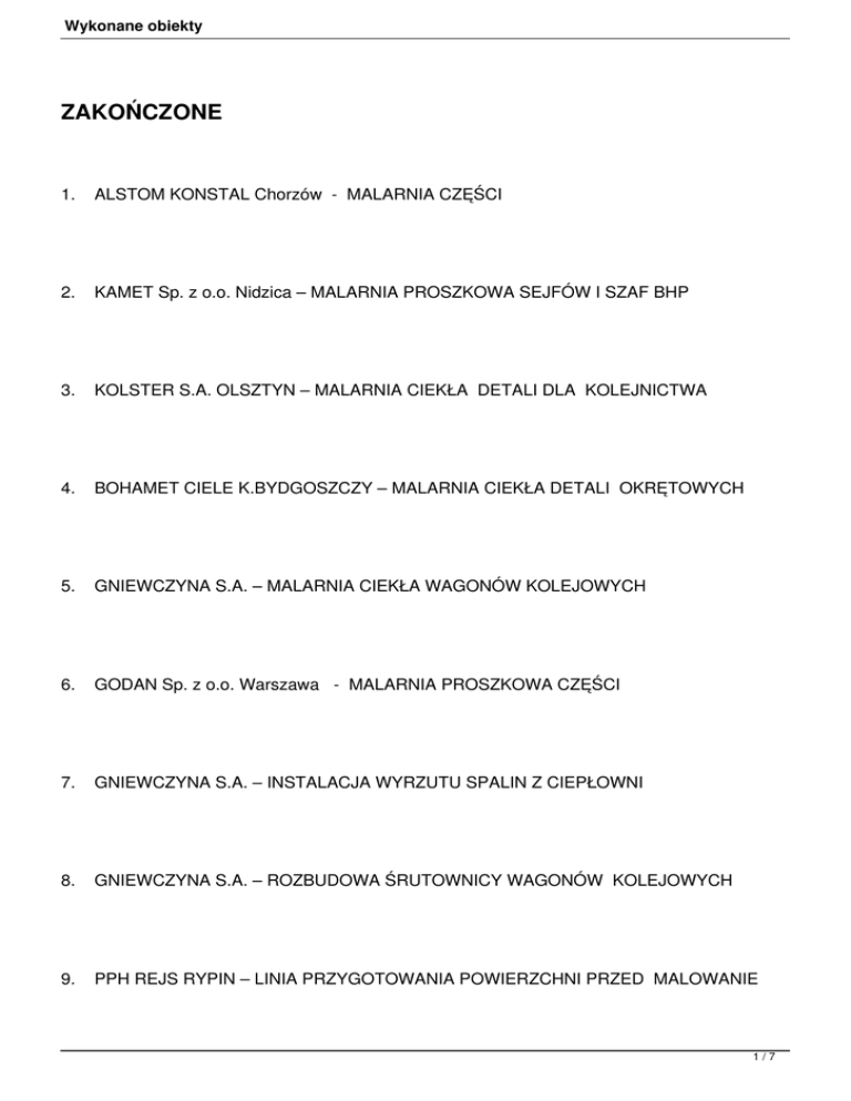 Wykonane obiekty ZAKOŃCZONE 1. ALSTOM KONSTAL Chorzów - MALARNIA CZĘŚCI 2. KAMET Sp. z o.o. Nidzica – MALARNIA PROSZKOWA SEJFÓW I SZAF BHP 3. KOLSTER S.A. OLSZTYN – MALARNIA CIEKŁA DETALI DLA KOLEJNICTWA 4. BOHAMET CIELE K.BYDGOSZCZY – MALARNIA CIEKŁA DETALI OKRĘTOWYCH 5. GNIEWCZYNA S.A. – MALARNIA CIEKŁA WAGONÓW KOLEJOWYCH 6. GODAN Sp. z o.o. Warszawa - MALARNIA PROSZKOWA CZĘŚCI 7. GNIEWCZYNA S.A. – INSTALACJA WYRZUTU SPALIN Z CIEPŁOWNI 8. GNIEWCZYNA S.A. – ROZBUDOWA ŚRUTOWNICY WAGONÓW KOLEJOWYCH 9. PPH REJS RYPIN – LINIA PRZYGOTOWANIA POWIERZCHNI PRZED MALOWANIE 1/7 Wykonane obiekty PROSZKOWYM 10. BOHAMET CIELE K.BYDGOSZCZY – MALARNIA PROSZKOWA 11. ENERGOREMONT S.J. CELULOZA ŚWIECIE – KABINO-SUSZARKA DO KONSTRUKCJI STALOWYCH 12. ONDULINE MIELEC – KABINA MALARSKA SPECJALNA 13. KGHM ZUW LUBIN - ŚRUTOWNICA KOMOROWA DO KONSTRUKCJI STALOWYCH 14. NOVAR TORUŃ – KOMPLETNA MALARNIA PROSZKOWA 15. PRONAR SP Z O.O. – AUTOMATYCZNA MALARNIA FELG 16. EUROBOX Sp. z o.o. ŚWIEBODZIN – LINIA PRZYGOTOWANIA POWIERZCHNI 17. TARET – MILANÓWEK - ZBIORNIKI DO TRAWIENIA 2/7 Wykonane obiekty 18. ALSTOM KONSTAL Chorzów - POMOSTY MALARSKIE DO MALARNI 19. KOLSTER S.A. OLSZTYN – WENTYLACJA OGÓLNA HAL PRODUKCYJNYCH 20. EMIZET Sp. z o.o. SZYDŁÓW – KOMPLETNA MALARNIA PROSZKOWA 21. EUROBOX Sp. z o.o. ŚWIEBODZIN – AUTOMATYCZNA LINIA MALARSKA PROSZKOWA 22. WIX - FILTRON GOSTYŃ – ZESPÓŁ PIECY DO POLIMERYZACJI KLEJÓW Z UKŁADEM AUTOMATYCZNEGO TRANSPORTU TAŚMOWEGO 23. ALSTOM KONSTAL Chorzów - POMOSTY MALARSKIE Z NAPĘDEM PNEUMATYCZNYM W KABINIE MALARSKIEJ 24. WIX - FILTRON GOSTYŃ – MODERNIZACJA MALARNI PROSZKOWEJ 25. WIX - FILTRON GOSTYŃ – PIEC DO WYPALANIA BIBUŁY FILTRACYJNEJ „350” Z UKŁADEMAUTOMATYCZNEGO TRANSPORTU TAŚMOWEGO 26. WIX - FILTRON GOSTYŃ – PIEC DO WYPALANIA BIBUŁY FILTRACYJNEJ „600” Z UKŁADEMAUTOMATYCZNEGO TRANSPORTU TAŚMOWEGO 3/7 Wykonane obiekty 27. WIX - FILTRON GOSTYŃ – PIEC DO POLIMERYZACJI KLEJÓW „1800” 28. GELG Sp. z o.o. WRONKI – AUTOMATYCZNA LINIA DO CHEMICZNEGO PRZYGOTOWANIA POWIERZCHNI 29. ALSTOM KONSTAL Chorzów - SYSTEM ARCHIWIZACJI, WIZUALIZACJI I NAWILŻANIA POWIETRZA W KABINIE MALARSKIEJ DO WAGONÓW 30. BOXMET Sp. z o.o. PIESZYCE – LINIA DO CHEMICZNEGO PRZYGOTOWANIA POWIERZCHNI 31. AMICA WRONKI - MODRNIZACJA SYSTEMU OGRZEWANIA SUSZARKI I PIECA DO POLIMERYZACJI FAB PROSZKOWYCH W LINII LODÓWEK 32. AMICA WRONKI - MODRNIZACJA SYSTEMU OGRZEWANIA SUSZARKI I PIECA DO POLIMERYZACJI FAB PROSZKOWYCH W LINII DETALI 33. PPH REJS RYPIN – LINIA DO MALOWANIA PROSZKOWEGO Z PRZYGOTOWANIEM CHEMICZNYM POWIERZCHNI 34. WASIAK GmbH & KG HANOWER – AUTOMATYCZNA LINIA DO MALOWANIA PROSZKOWEGO Z PRZYGOTOWANIEM CHEMICZNYM POWIERZCHNI 4/7 Wykonane obiekty 35. AMICA WRONKI - MODRNIZACJA SYSTEMU OGRZEWANIA SUSZARKI I PIECA DO POLIMERYZACJI FAB PROSZKOWYCH W LINII KUCHENEK 36. WIX - FILTRON GOSTYŃ – PIEC DO WYPALANIA BIBUŁY FILTRACYJNEJ „450” Z UKŁADEM AUTOMATYCZNEGO TRANSPORTU TAŚMOWEGO 37. WIX - FILTRON GOSTYŃ – PIEC DO POLIMERYZACJI KLEJÓW „1400” 38. KAMELMAG Sp. z o.o. WARSZAWA – LINIA DO CHEMICZNEGO PRZYGOTOWANIA POWIERZCHNI GAŚNIC SAMOCHODOWYCH 39. AKPIL PILZNO – AUTOMATYCZNA LINIA DO CHEMICZNEGO PRZYGOTOWANIA POWIERZCHNI 40. AKPIL PILZNO – KABINO-SUSZARKA 41. KTL-PL GORZKOWICE – AUTOMATYCZNA LINIA WANNOWA DO CHEMICZNEGO PRZYGOTOWANIA POWIERZCHNI I MALOWANIA KATAFORETYCZNEGO 42. DAWID Sp. z o.o. CZĘSTOCHOWA – MALARNIA PROSZKOWA Z CHEMICZNYM PRZYGOTOWANIEM POWIERZCHNI 43. BR-HOLLAND TUREK – KABINO-SUSZARKA 5/7 Wykonane obiekty 44. BOHAMET CIELE K.BYDGOSZCZY – KABINA MALRSKA CIEKŁA 45. GNIEWCZYNA S.A. – ROZBUDOWA KABINO-SUSZARKI DO WAGONÓW KOLEJOWYCH 46. KZWM OGNIOCHRON ANDRYCHÓW – LINIA DO CHEMICZNEGO PRZYGOTOWANIA POWIERZCHNI GAŚNIC SAMOCHODOWYCH - PRZENIESIENIE 47. KTL-PL GORZKOWICE – AUTOMATYCZNA LINIA DO CHEMICZNEGO PRZYGOTOWANIA POWIERZCHNI I MALOWANIA KATAFORETYCZNEGO – LINIA CIĄGŁA 48. P.P.U. ZAP –KOOPERACJA Sp. z o.o. OSTRÓW WIELKOPOLSKI – AUTOMATYCZNA LINIA TAKTOWO-NATRYSKOWA DO MYCIA 49. LINSTAL SP. Z O.O. JASIEŃ KABINO - SUSZARKA 50. WIX - FILTRON GOSTYŃ – PIEC DO WSTĘPNEGO PODGRZEWU „600” 51. WIX - FILTRON GOSTYŃ – PIEC DO WYPALANIA „600” 52. WIX - FILTRON GOSTYŃ – PIEC DO WYPALANIA „600” Z DOCISKIEM MECHANICZNYM 6/7 Wykonane obiekty 53. WIX - FILTRON GOSTYŃ – PIEC DO WYPALANIA „400” W TRAKCIE REALIZACJI 54. KABINOSUSZARKA TUGEB POLBUD 7/7