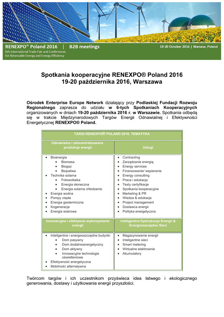 Spotkania kooperacyjne RENEXPO® Poland 2016 19-20 października 2016, Warszawa Ośrodek Enterprise Europe Network działający przy Podlaskiej Fundacji Rozwoju Regionalnego zaprasza do udziału w 6-tych Spotkaniach Kooperacyjnych organizowanych w dniach 19-20 października 2016 r. w Warszawie. Spotkania odbędą się w trakcie Międzynarodowych Targów Energii Odnawialnej i Efektywności Energetycznej RENEXPO® Poland. TARGI RENEXPO® POLAND 2016. TEMATYKA Odnawialna i zdecentralizowana produkcja energii Bioenergia Biomasa Biogaz Biopaliwa Technika solarna Fotowoltaika Energia słoneczna Energia solarna chłodzenie Energia wodna Pompy ciepła Energia geotermiczna Kogeneracja Energia wiatrowa Usługi Innowacyjne i efektywne wykorzystanie energii Inteligentne i energooszczędne budynki Dom pasywny Dom dodatnioenergetyczny Dom aktywny Innowacyjne technologie Contracting Zarządzanie energią Energy services Finansowanie/ wspieranie Energy consulting Praca i edukacja Testy certyfikacje Spotkania kooperacyjne Marketing & PR Wiedza & edukacja Project management Dostawca energii Polityka energetyczna Inteligentna Dystrybucja Energii & Energooszczędne Sieci Magazynowanie energii Inteligentne sieci Smart metering Wirtualne elektrownie Akumulatory oświetleniowe Efektywność energetyczna Mobilność alternatywna Twórcom targów i ich uczestnikom przyświeca idea łatwego i ekologicznego generowania, dostawy i użytkowania energii przyszłości. Spotkania Kooperacyjne RENEXPO 2016 przeznaczone są dla przedsiębiorców i instytucji chcących w łatwy i szybki sposób nawiązać współpracę z partnerami z szeroko rozumianej branży energetycznej, w szczególności związanej z energią odnawialną i energooszczędnym budownictwem. Pomimo że rozmowy są krótkie – trwają 30 minut – dają szansę na przedstawienie profilu działalności firmy oraz zapoznanie się z ofertą potencjalnego partnera. Co najważniejsze, możliwe jest wcześniejsze umówienie spotkań, a dzięki temu właściwe przygotowanie się do poszczególnych rozmów. Udział w spotkaniach kooperacyjnych – 4 kroki do sukcesu 1. Rejestracja profilu kooperacyjnego na stronie www.b2match.eu/renexpo-pl-2016 2. Wybór partnerów do spotkań biznesowych. 3. Akceptacja lub odrzucenie zaproszeń do spotkań. 4. Udział w giełdzie kooperacyjnej RENEXPO 2016. Korzyści z udziału w spotkaniach kooperacyjnych: • możliwość spotkania potencjalnych partnerów do współpracy, • zapoznanie się z nowymi trendami i technologiami w branży, • znalezienie nowych rozwiązań dla swoich pomysłów i projektów, • wymiana informacji na poziomie międzynarodowym, • znalezienie partnerów do wspólnych projektów. Rejestracja na spotkania odbywa www.b2match.eu/renexpo-pl-2016 Udział w wydarzeniu jest bezpłatny. Szczegółowych informacji udziela: Magdalena Borys Podlaska Fundacja Rozwoju Regionalnego 15-441 Białystok, ul. Spółdzielcza 8 Tel: +48 85 653 72 12 e-mail: [email protected] się za pośrednictwem strony internetowej