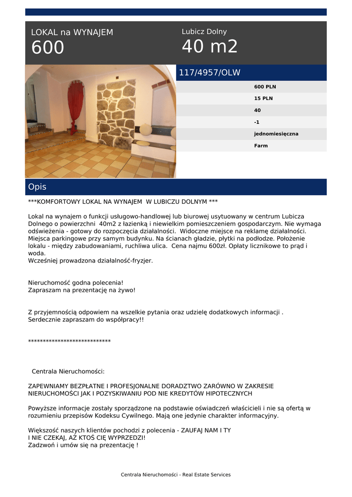 Lubicz Dolny LOKAL na WYNAJEM 40 m2 600 117/4957/OLW 600 PLN 15 PLN 40 -1 jednomiesięczna Farm Opis ***KOMFORTOWY LOKAL NA WYNAJEM W LUBICZU DOLNYM *** Lokal na wynajem o funkcji usługowo-handlowej lub biurowej usytuowany w centrum Lubicza Dolnego o powierzchni 40m2 z łazienką i niewielkim pomieszczeniem gospodarczym. Nie wymaga odświeżenia - gotowy do rozpoczęcia działalności. Widoczne miejsce na reklamę działalności. Miejsca parkingowe przy samym budynku. Na ścianach gładzie, płytki na podłodze. Położenie lokalu - między zabudowaniami, ruchliwa ulica. Cena najmu 600zł. Opłaty licznikowe to prąd i woda. Wcześniej prowadzona działalność-fryzjer. Nieruchomość godna polecenia! Zapraszam na prezentację na żywo! Z przyjemnością odpowiem na wszelkie pytania oraz udzielę dodatkowych informacji . Serdecznie zapraszam do współpracy!! **************************** Centrala Nieruchomości: ZAPEWNIAMY BEZPŁATNE I PROFESJONALNE DORADZTWO ZARÓWNO W ZAKRESIE NIERUCHOMOŚCI JAK I POZYSKIWANIU POD NIE KREDYTÓW HIPOTECZNYCH Powyższe informacje zostały sporządzone na podstawie oświadczeń właścicieli i nie są ofertą w rozumieniu przepisów Kodeksu Cywilnego. Mają one jedynie charakter informacyjny. Większość naszych klientów pochodzi z polecenia - ZAUFAJ NAM I TY I NIE CZEKAJ, AŻ KTOŚ CIĘ WYPRZEDZI! Zadzwoń i umów się na prezentację ! Centrala Nieruchomości - Real Estate Services Nr licencji pośrednika odpowiedzialnego za wykonanie umowy pośrednictwa 14260. zobacz inne nasze oferty na www.centralanieruchomosci.pl facebook.com/Centrala.N Karolina Rutkowska tel. (+48) 663 899 715 email: [email protected] Centrala Nieruchomości - Real Estate Services Powered by TCPDF (www.tcpdf.org)