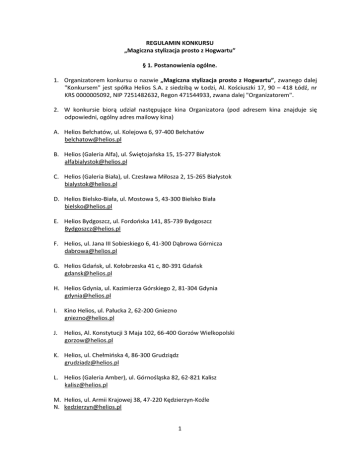 REGULAMIN KONKURSU „Magiczna stylizacja prosto z Hogwartu” § 1. Postanowienia ogólne. 1. Organizatorem konkursu o nazwie „Magiczna stylizacja prosto z Hogwartu”, zwanego dalej "Konkursem" jest spółka Helios S.A. z siedzibą w Łodzi, Al. Kościuszki 17, 90 – 418 Łódź, nr KRS 0000005092, NIP 7251482632, Regon 471544933, zwana dalej "Organizatorem". 2. W konkursie biorą udział następujące kina Organizatora (pod adresem kina znajduje się odpowiedni, ogólny adres mailowy kina) A. Helios Bełchatów, ul. Kolejowa 6, 97-400 Bełchatów [email protected] B. Helios (Galeria Alfa), ul. Świętojańska 15, 15-277 Białystok [email protected] C. Helios (Galeria Biała), ul. Czesława Miłosza 2, 15-265 Białystok [email protected] D. Helios Bielsko-Biała, ul. Mostowa 5, 43-300 Bielsko Biała [email protected] E. Helios Bydgoszcz, ul. Fordońska 141, 85-739 Bydgoszcz [email protected] F. Helios, ul. Jana III Sobieskiego 6, 41-300 Dąbrowa Górnicza [email protected] G. Helios Gdańsk, ul. Kołobrzeska 41 c, 80-391 Gdańsk [email protected] H. Helios Gdynia, ul. Kazimierza Górskiego 2, 81-304 Gdynia [email protected] I. Kino Helios, ul. Pałucka 2, 62-200 Gniezno [email protected] J. Helios, Al. Konstytucji 3 Maja 102, 66-400 Gorzów Wielkopolski [email protected] K. Helios, ul. Chełmińska 4, 86-300 Grudziądz [email protected] L. Helios (Galeria Amber), ul. Górnośląska 82, 62-821 Kalisz [email protected] M. Helios, ul. Armii Krajowej 38, 47-220 Kędzierzyn-Koźle N. [email protected] 1 O. Helios Kielce, Ul. Świętokrzyska 20, 25-329 Kielce [email protected] P. Kino Helios, ul. Paderewskiego 8, 62-510 Konin [email protected] Q. Kino Helios, ul. Najświętszej Marii Panny 9, 59-220 Legnica [email protected] R. Kino Helios, ul. Generała Władysława Sikorskiego 20, 59-300 Lubin [email protected] S. Kino Bałtyk, ul. Narutowicza 20, 90-135 Łódź [email protected] T. Helios, ul. Lwowska 80, 33-300 Nowy Sącz [email protected] U. Helios, al. Piłsudskiego 16, 10-576 Olsztyn [email protected] V. Helios, Plac Kopernika 17, 45-040 Opole [email protected] W. Helios, Al. Powstańców Wielkopolskich 99, 64-920 Piła [email protected] X. Kino Helios, ul. Słowackiego 123, 97-300 Piotrków Trybunalski [email protected] Y. Helios, ul. Wyszogrodzka 144, 09-410 Płock [email protected] Z. Helios, ul. Poniatowskiego 5, 26-600 Radom [email protected] AA. Helios, Al. Powstańców Warszawy 14, 35-329 Rzeszów [email protected] BB. Helios (Galeria Rzeszów), ul. Piłsudskiego 44, 35-001 Rzeszów [email protected] CC. Helios (Galeria Siedlce), ul. Piłsudskiego 74, 08-110 Siedlce [email protected] DD. Helios, ul. Modrzejowska 32b, 41-200 Sosnowiec [email protected] 2 EE. Helios, ul. Ks. Kardynała Stefana Wyszyńskiego 14, 27-200 Starachowice [email protected] FF. Helios, ul. Bolesława Krzywoustego 9-10, 70-250 Szczecin [email protected] GG. Helios (Outlet Park), Andrzeja Struga 42, 70-784 Szczecin [email protected] HH. Kino Helios, Pomorska 1, 83-110 Tczew [email protected] II. Helios Magnolia Park, ul. Legnicka 58, 54-204 Wrocław [email protected] 3. Nagrodą konkursową jest wycieczka dla dwóch osób do Warner Bros. Studio Tour London The Making of Harry Potter, do Londynu o wartości 8000zł .szczegółowo opisana w § 6 i 11 Regulaminu. 4. Fundatorem Nagród konkursowych w Konkursie jest HELIOS S.A. 5. Wycieczka odbędzie się w maju 2015 roku, termin zostanie ogłoszony do końca trwania głosowania. Szczegółowa oferta wycieczki znajduje się w regulaminie w § 6 i 11. 6. Konkurs zostanie przeprowadzony w aplikacji konkursowej, dostępnym pod adresem www.konkursy.helios.pl, dalej zwaną "Aplikacja", w okresie określonym w § 4 regulaminu na warunkach i zasadach określonych w niniejszym Regulaminie. 7. Regulamin stanowi podstawę organizacji Konkursu i określa prawa i obowiązki jego Uczestników. § 2. Uczestnictwo w Konkursie. 1. 2. 1) 2) Uczestnictwo w Konkursie jest nieodpłatne. Uczestnikami Konkursu mogą być: pełnoletnie osoby fizyczne, posiadające pełną zdolność do czynności prawnych, osoby niepełnoletnie, które ukończyły 15 rok życia, posiadające ograniczoną zdolność do czynności prawnych, które mogą brać udział w Konkursie tylko za pisemną zgodą swoich rodziców lub innych opiekunów prawnych, 2.1. Osoby wskazane w pkt 1 i 2 muszą posiadać miejsce zamieszkania na terytorium Rzeczypospolitej Polskiej i spełniać warunki określone w Regulaminie. 3. Uczestnikami Konkursu nie mogą być pracownicy Organizatora, jak również ich małżonkowie, dzieci, rodzice oraz rodzeństwo. 4. Uczestnikami Konkursu mogą być wyłącznie osoby, które odwiedzą Profil sieci kin Helios na serwisie społecznościowym Facebook. 5. Przystąpienie do Konkursu jest równoznaczne z akceptacją przez uczestnika Regulaminu. Uczestnik przystępując do konkursu zobowiązuje się do przestrzegania określonych w Regulaminie zasad, jak również potwierdza, iż spełnia wszystkie warunki, które uprawniają go do udziału w Konkursie. 3 6. Uczestnictwa w Konkursie, jak i praw i obowiązków z nimi związanych, w tym także prawa do żądania wydania nagrody, nie można przenosić na inne osoby. 7. Uczestnik Konkursu przyjmuje do wiadomości, że warunkiem koniecznym skorzystania z nagrody przez zwycięzcę konkursu może być posiadanie odpowiedniej i ważnej wizy. Warunek ten jest niezależny od Organizatora, i jego spełnienie leży wyłacznie po stronie uczestnika, oraz Organizator nie ponosi z tego tytułu odpowiedzialności, w szczególności za skutki nieuzyskania wymaganych przepisami prawa dokumentów. W szczególności ewentualne nieuzyskanie wizy nie stanowi podstawy do roszczeń wobec Organizatora. 8. Jeżeli laureatem konkursu jest osoba niepełnoletnia, warunkiem realizacji wycieczki jest uczestnictwo w wycieczce osoby pełnoletniej, w postaci opiekuna prawnego laureata lub osoby przez opiekunów wskazanej. § 3. Przebieg i warunki udziału w Konkursie. 1