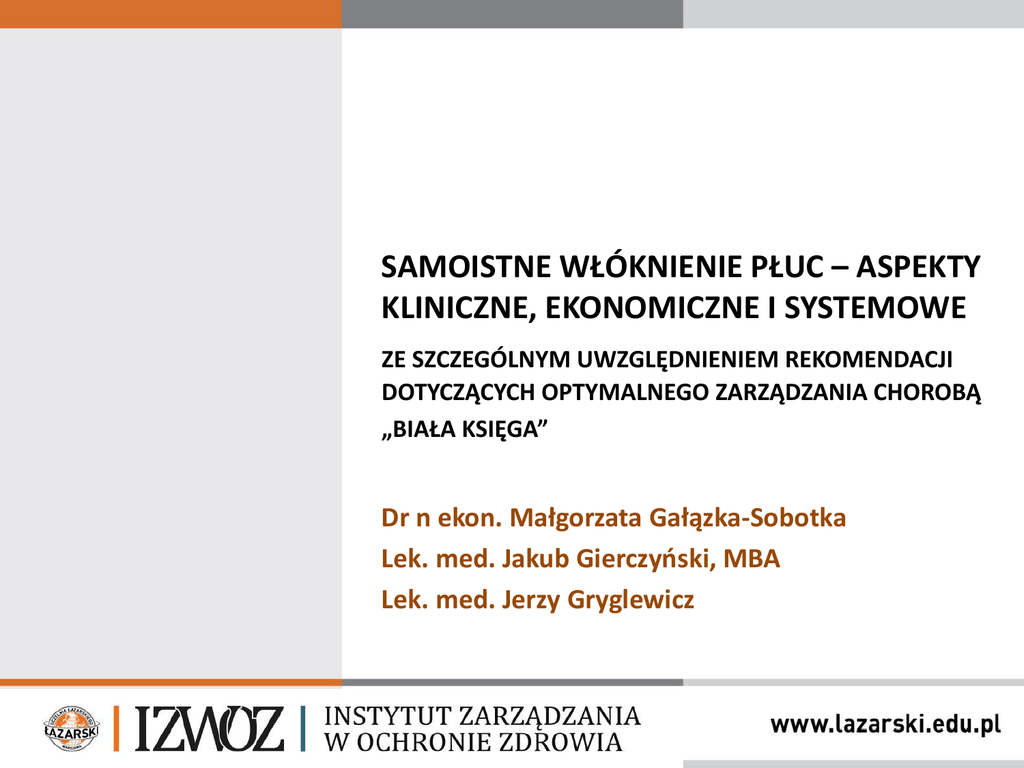 SAMOISTNE WŁÓKNIENIE PŁUC – ASPEKTY KLINICZNE, EKONOMICZNE I SYSTEMOWE ZE SZCZEGÓLNYM UWZGLĘDNIENIEM REKOMENDACJI DOTYCZĄCYCH OPTYMALNEGO ZARZĄDZANIA CHOROBĄ „BIAŁA KSIĘGA” Dr n ekon. Małgorzata Gałązka-Sobotka Lek. med. Jakub Gierczyński, MBA Lek. med. Jerzy Gryglewicz http://instytuty.lazarski.pl/izwoz/ Lek med. Jakub Gierczyński, MBA Instytut Zarządzania w Ochronie Zdrowia Kluczowe dane ekonomiczno-systemowe dotyczące samoistnego włóknienia płuc w Polsce Liczba leczonych chorych z SWP w latach 2013-2014 99 % DYNAMIKA ZMIAN 2013 DO 2014 – 106 % 101 % 113 % 132 % 136 % 138 % 158 % Liczba leczonych chorych z SWP w latach 2013-2014 Rok realizacji Liczba pacjentów Wartość zrealizowanych jednostek rozliczeniowych (zł) 2013 4039 15 616 395 2014 4296 16 585 615 Zmiana rok do roku 106 % 106 % Wartość zrealizowanych jednostek rozliczeniowych przez NFZ tytułem świadczeń zdrowotnych w zakresie SWP w latach 2013-2014 DYNAMIKA ZMIAN 2013 DO 2014 – 106 % 109 % 109 % 77 % 152 % 80 % 233 % Średnia wartość hospitalizacji w latach 2009-2014 w zakresie rozpoznania J84.1-Inne choroby tkanki śródmiąższowej płuc ze zwłóknieniem, w złotych -1% ŚREDNIA DLA LAT 2009-2014 ok. 4 500 zł Udział hospitalizacji i czas pobytu w zakresie samoistnego włóknienia płuc, w ramach grupy D50 - Zwłóknienie i pylica płuc, w 2014 roku Zakres świadczeń Udział (%) Mediana czasu pobytu (w dniach) Choroby płuc hospitalizacja 74,31 7 Choroby wewnętrzne hospitalizacja 20,17 7 Koszty pośrednie samoistnego włóknienia płuc (SWP) w Polsce Absencja chorobowa w 2014 r.: • łączna liczba dni absencji chorobowej – ok. 213 mln • choroby układu oddechowego (J00-J99) – 29 543,3 tys. dni Koszty pośrednie ponoszone przez ZUS w 2014 r. • inne choroby tkanki śródmiąższowej płuc (J84) – 97,4 tys. dni • mężczyźni – 58,7 tys. dni • kobiety – 38,6 tys. dni • łączna liczba zaświadczeń lekarskich o czasowej niezdolności do pracy (z powodu J84) – 7,1 tys. * dane dot. wyłącznie osób ubezpieczonych w ZUS Struktura według wieku osób ubezpieczonych w ZUS, którym w 2014 r. wydano przynajmniej jedno zaświadczenie lekarskie z tytułu niezdolności do pracy spowodowanej chorobą J84 Wydatki ogółem na świadczenia związane z niezdolnością do pracy poniesione w 2013 r. z powodu innej choroby tkanki śródmiąższowej płuc (J84): • łącznie – 18 176,3 tys. zł, w tym: Koszty pośrednie ponoszone przez ZUS w 2013 r. • renty z tytułu niezdolności do pracy – 10 114,8 tys. zł • absencja chorobowa – 6 290,1 tys. zł • świadczenia rehabilitacyjne – 1 426,8 tys. zł * dane dot. wyłącznie osób ubezpieczonych w ZUS Rekomendacje Rekomendacja nr 1. Samoistne włóknienie płuc (SWP) jako choroba sieroca oraz dotycząca osób starszych powinna być traktowana priorytetowo w systemie ochrony zdrowia w Polsce. Rekomendacja nr 2. W celu poprawy jakości diagnostyki, efektywności oraz kompleksowości leczenia pacjentów z rozpoznaniem samoistnego włóknienia płuc należy rozważyć utworzenie na bazie istniejących klinik chorób płuc centrów eksperckich rozpoznawania i leczenia SWP, które dzięki doświadczeniu zespołu i odpowiednio wyposażonej bazie diagnostycznej zapewnią wysoki poziom opieki nad chorymi z SWP. Rekomendacja nr 3. Stworzenie krajowego rejestru z samoistnym włóknieniem płuc (SWP). pacjentów Rekomendacja nr 4. W celu optymalnego leczenia farmakologicznego pacjentów z SWP w oparciu o nowe wytyczne kliniczne należy opracować aktualne schematy terapeutyczne, w tym projekty programów lekowych finansowanych przez NFZ. Rekomendacja nr 5. Zalecane jest opracowanie standardów opieki nad pacjentem z SWP oraz zapewnienie wyceny wszystkich procedur realizowanych w ramach standardów w oparciu o ich realne koszty.