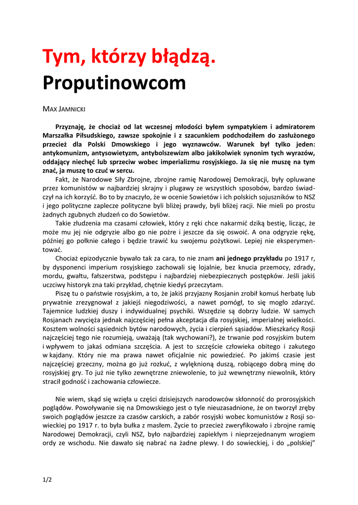 Tym, którzy błądzą. Proputinowcom MAX JAMNICKI Przyznaję, że chociaż od lat wczesnej młodości byłem sympatykiem i admiratorem Marszałka Piłsudskiego, zawsze spokojnie i z szacunkiem podchodziłem do zasłużonego przecież dla Polski Dmowskiego i jego wyznawców. Warunek był tylko jeden: antykomunizm, antysowietyzm, antybolszewizm albo jakikolwiek synonim tych wyrazów, oddający niechęć lub sprzeciw wobec imperializmu rosyjskiego. Ja się nie muszę na tym znać, ja muszę to czuć w sercu. Fakt, że Narodowe Siły Zbrojne, zbrojne ramię Narodowej Demokracji, były opluwane przez komunistów w najbardziej skrajny i plugawy ze wszystkich sposobów, bardzo świadczył na ich korzyść. Bo to by znaczyło, że w ocenie Sowietów i ich polskich sojuszników to NSZ i jego polityczne zaplecze polityczne byli bliżej prawdy, byli bliżej racji. Nie mieli po prostu żadnych zgubnych złudzeń co do Sowietów. Takie złudzenia ma czasami człowiek, który z ręki chce nakarmić dziką bestię, licząc, że może mu jej nie odgryzie albo go nie pożre i jeszcze da się oswoić. A ona odgryzie rękę, później go połknie całego i będzie trawić ku swojemu pożytkowi. Lepiej nie eksperymentować. Chociaż epizodycznie bywało tak za cara, to nie znam ani jednego przykładu po 1917 r, by dysponenci imperium rosyjskiego zachowali się lojalnie, bez knucia przemocy, zdrady, mordu, gwałtu, fałszerstwa, podstępu i najbardziej niebezpiecznych postępków. Jeśli jakiś uczciwy historyk zna taki przykład, chętnie kiedyś przeczytam. Piszę tu o państwie rosyjskim, a to, że jakiś przyjazny Rosjanin zrobił komuś herbatę lub prywatnie zrezygnował z jakiejś niegodziwości, a nawet pomógł, to się mogło zdarzyć. Tajemnice ludzkiej duszy i indywidualnej psychiki. Wszędzie są dobrzy ludzie. W samych Rosjanach zwycięża jednak najczęściej pełna akceptacja dla rosyjskiej, imperialnej wielkości. Kosztem wolności sąsiednich bytów narodowych, życia i cierpień sąsiadów. Mieszkańcy Rosji najczęściej tego nie rozumieją, uważają (tak wychowani?), że trwanie pod rosyjskim butem i wpływem to jakaś odmiana szczęścia. A jest to szczęście człowieka obitego i zakutego w kajdany. Który nie ma prawa nawet oficjalnie nic powiedzieć. Po jakimś czasie jest najczęściej grzeczny, można go już rozkuć, z wylęknioną duszą, robiącego dobrą minę do rosyjskiej gry. To już nie tylko zewnętrzne zniewolenie, to już wewnętrzny niewolnik, który stracił godność i zachowania człowiecze. Nie wiem, skąd się wzięła u części dzisiejszych narodowców skłonność do prorosyjskich poglądów. Powoływanie się na Dmowskiego jest o tyle nieuzasadnione, że on tworzył zręby swoich poglądów jeszcze za czasów carskich, a zabór rosyjski wobec komunistów z Rosji sowieckiej po 1917 r. to była bułka z masłem. Życie to przecież zweryfikowało i zbrojne ramię Narodowej Demokracji, czyli NSZ, było najbardziej zapiekłym i nieprzejednanym wrogiem ordy ze wschodu. Nie dawało się nabrać na żadne plewy. I do sowieckiej, i do „polskiej” 1/2 komunistycznej partyzantki, tych „wyzwolicieli-okupantów” na polskiej ziemi, najpierw strzelali, później ewentualnie rozmawiali. Nie było innego wyjścia. AK, tak wiem, że pod wpływem rządu w Londynie będącego pod presją aliantów, najpierw prowadziło rozmowy. ZAWSZE kończyło się to zdradą ze strony Rosjan. ZAWSZE kończyło się to tragicznie. Rozmawia się w czasie pokoju. Ale z nimi i wtedy trzeba być do końca nieufnym. Nawet laik jest w stanie zauważyć, że dzisiejsze władze w Rosji są tylko dalszym ciągiem, przedłużeniem tego, co nastąpiło w Rosji po 1917 r. Wtedy powstawały złowieszcze służby, przy których carska Ochrana była tylko skromną i przewidywalną instytucją państwową. Bo istnieje gradacja i zagrożeń i okrucieństwa i zdrady. W tej gradacji to, co niesie z sobą Rosja, od niemal 100 lat jest na samym szczycie. I maski jakie teraz przybiera, rzekome wsparcie dla religii, tradycji itd., nikogo nie powinny zmylić. Każdy, kto wchodzi w prorosyjskie buty (ja wiem, że często z nieświadomości, pomyłki, i innych ludzkich niedoskonałości), powinien mieć świadomość, że robiąc to, pluje na groby ofiar sowieckiego reżimu. Tych z AK, NSZ, WiN i innych. Pluje na wszystkich tych zamęczonych, pomordowanych po 1944 r. niewinnych ofiar imperium zła. Ono przecież nawet nie próbuje ukrywać swojego pochodzenia, przez swego „szefa”, pułkownika KGB. Wywodzącego się wprost, wraz ze swoim zapleczem, z najbardziej przepastnych otchłani zła. A pluć na groby polskich ofiar, by służyć Rosji, z jakiegokolwiek powodu, jest czymś bardzo złym. Nie mam nic przeciwko narodowcom. Ba, uważam, że są potrzebni (fakt, że trochę mnie dziwi, czasami śmieszy szukanie w Polsce ciemnoskórych i muzułmanów jako potencjalnego zagrożenia na polskiej ziemi. Mamy w Polsce duuuuuuuużo większe problemy, a każdy kto zadeklaruje chęć wspierania naszej ojczyzny, nawet Chińczyk, czy Eskimos, jest raczej sojusznikiem. W naszych szeregach walczyły różne nacje, i Tatarzy, i Gruzini, i inni. Każdy niechętny rosyjskiemu imperializmowi jest naszym potencjalnym przyjacielem i sojusznikiem. Bo to Rosja nas okupowała przez ostatnie 200 lat, i ona do teraz ma w Polsce ciemne, niebezpieczne wpływy). Uważam, że narodowcom należy się odpowiednie miejsce na polskiej scenie politycznej. Jest potrzebne ugrupowanie radykalniejsze niż PiS. Nie jestem młody, a wcale nie jestem pewien, czy w jakimś momencie nie oddałbym na nich swojego głosu. Młodzież narodowa wydaje się bardziej ideowa w CZYNIE, bardziej aktywna i sprawcza. Lubię Kaczyńskiego, bardzo szanuję, a PiS uważam za pojemną formułę, ale tam, gdzie patriotyzm, tam można się dogadywać. Ale plucie na groby naszych ofiar, które tyle przecierpiały, poprzez ciche lub jawne wspieranie zaborców i oprawc