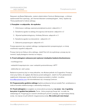 Powiększanie piersi Nazywam się Beata Rajkowska , jestem właścicielem Centrum Medycznego , w którym zaplanowała Pani operację, jak również lekarzem anestezjologiem , który będzie się Panią opiekował w trakcie zabiegu. I. Przesyłam w załączniku do wydruku: 1. Informacja o zabiegu operacji powiększenia piersi- załącznik nr 1 2. Świadoma zgoda na zabieg chirurgiczny lub leczenie -załącznik nr 2 3. Wywiad epidemiologiczny i Ankietę Zdrowia- załącznik nr 3 4. Świadoma zgoda na znieczulenie - załącznik nr 4 5. Zalecenia pooperacyjne- załącznik nr 5 Proszę zapoznać się z opisem zabiegu i postępowaniem pooperacyjnym, w miarę możliwości wypełnić załączniki. Proszę mieć je ze Sobą w dniu zabiegu. Jeżeli Pani ich nie wydrukuje proszę się nie martwić, będą dostępne również na miejscu. II. Przed zabiegiem wskazane jest wykonać niezbędne badania biochemiczne: - morfologia krwi - wskaźniki krzepnięcia tzn: czas i wskaźnik protrombinowy i APTT - elektrolity tzn: sód i potas Badania te powinny być w miarę aktualne, nie dłuższe jednak niż 2 tygodnie. Proszę je mieć przy Sobie, do wglądu dla lekarza przed zabiegiem. Jeżeli ma Pani jakiekolwiek wątpliwości dotyczące wyniku badań proszę je przesłać e-mailem na adres [email protected] lub skontaktować się z recepcją Centrum. III. Przypuszczalna godzina zabiegu będzie podawana lub już została Pani przekazana w trakcie kontaktu telefonicznego z sekretarką medyczną. IV. Przed zabiegiem ze względu na znieczulenie proszę być na czczo - tzn. 2 godziny bez picia i 6 godzin bez jedzenia. Panie , które przyjmują Swoje leki na stałe nie odstawiają ich. Przyjmują je w swoich określonych porach, popijają je najmniejszą ilością wody, nie więcej niż pół szklanki niegazowanej wody. Nie wolno pić rano kawy!. [email protected] www.przyteatrze.com Powiększanie piersi V. W trakcie zabiegu będzie pani przebrana w sukienkę zabiegową, dostanie Pani jednorazowe obuwie i bieliznę. VI. W ramach kosztów zabiegu ma Pani zagwarantowane dwa posiłki kolację i śniadanie. Zabezpieczona jest opieka pooperacyjna pod nadzorem pielęgniarki i lekarza . VII. Po zabiegu pozostaje Pani w Centrum na jedną dobę. Proszę wziąć ze Sobą przybory toaletowe, bieliznę na przebranie. Koszulę jednorazową dostanie Pani od nas. Następnego dnia po zabiegu, po porannej konsultacji chirurgicznej, w trakcie której jest zdjęty opatrunek, wyciągnięte dreny i założony biustonosz może Pani opuścić Centrum pod opieką osoby dorosłej. Właściwy rozmiar biustonosza zostanie dobrany po zdjęciu opatrunku. Koszt biustonosza ponosi dodatkowo pacjentka 130 zł. SAMODZIELNE PROWADZENIE POJAZDU JEST NIEDOZWOLONE. Mam nadzieję , że odpowiedziałam na wszystkie nurtujące pytania. Jeśli jednak jakieś się pojawią proszę o kontakt z recepcją Centrum Medycznego Przy Teatrze ul. Więckowskiego 20 lok 5 Łódź pod nr tel. 422071100. Będę przy wszystkich pacjentkach w trakcie zabiegu. Z racji wykonywanego zawodu obiecuję, że ból przy mnie nie istnieje. [email protected] tel. kom. +48607996161 [email protected] www.przyteatrze.com Powiększanie piersi Załącznik nr 1 INFORMACJA O ZABIEGU OPERACJI POWIĘKSZENIA PIERSI Imię i nazwisko pacjenta……………………………………………………………… Adres zamieszkania…………………………………………………………………… Data urodzenia………............................................................................……………… PESEL………………………………........................................................................... Rodzaj planowanego zabiegu………………………………………………………… POWIĘKSZENIE PIERSI Instrukcja Poniższa zgoda jest dokumentem napisanym w celu poinformowania pacjenta o zabiegu powiększenia piersi, ryzyku zabiegu operacyjnego oraz innych, alternatywnych metodach leczenia. Bardzo ważne jest, aby Pan/Pani przeczytała te informacje dokładnie i do końca. Proszę podpisać każdą stronę, co będzie potwierdzeniem zapoznania się z całym dokumentem. Istota i cel zabiegu: · POWIĘKSZANIE PIERSI Wiele kobiet jest niezadowolonych z kształtu i rozmiaru swoich piersi. Niektóre uważają, że ich piersi są zbyt małe w stosunku do budowy ciała lub straciły jędrność np. po ciąży czy odchudzaniu i wyglądają nieestetycznie. Widoczna może być też różnica w ich wielkości. To wszystko może być powodem złego samopoczucia i utraty pewności siebie. Rozwiązaniem w takim wypadku może być operacja powiększania piersi, może ona wpłynąć na zwiększenie poczucia pewności siebie. 1. PODNIESIENIE PIERSI Upływ czasu, przebyte ciąże, karmienie piersią, rozrost lub zanik tkanki podskórnej może powodować niekorzystne zmiany w wyglądzie kobiecych piersi. W zależności od rozmiaru piersi i konsystencji skóry oraz tkanki podskórnej oraz życzenia pacjentki może być wykonane podniesienie piersi wraz z wprowadzeniem wkładek silikonowych lub bez. Rodzaj zastosowanej techniki jest omawiany szczegółowo z chirurgiem. [email protected] www.przyteatrze.com Powiększanie piersi Pierwsza konsultacja i zabieg W czasie rozmowy z chirurgiem plastykiem, mają Panie możliwość określenia swoich życzeń i oczekiwań w stosunku do wielkości i kształtu piersi. Specjalista opowie o możliwościach wykonania zabiegu, omówi sprawy medyczne i zdrowotne. Poinformuje o możliwych komplikacjach związanych z zabiegiem Przed zabiegiem operacyjnym w Centrum robione są zdjęcia, które stanowią dokumentację pacjentki. Chirurg plastyk zaznacza dokładnie pole operacyjne, gdzie będą przeprowadzone cięcia, następnie zostaje podane znieczulenie w większości przypadków miejscowe z analgosedacją. Po wykonaniu cięć w miejscach poprzednio umówionych z pacjentką, specjalista robi miejsce pod mięśniem piersiowym , nastę
