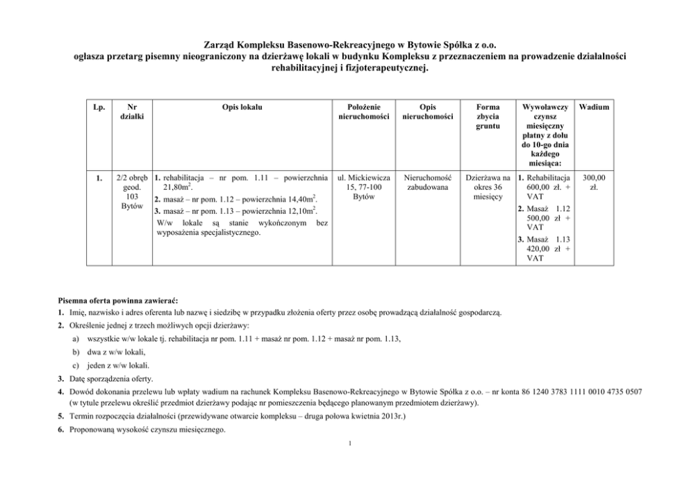 Zarząd Kompleksu Basenowo-Rekreacyjnego w Bytowie Spółka z o.o. ogłasza przetarg pisemny nieograniczony na dzierŜawę lokali w budynku Kompleksu z przeznaczeniem na prowadzenie działalności rehabilitacyjnej i fizjoterapeutycznej. Lp. 1. Nr działki Opis lokalu 2/2 obręb 1. rehabilitacja – nr pom. 1.11 – powierzchnia geod. 21,80m2. 103 2. masaŜ – nr pom. 1.12 – powierzchnia 14,40m2. Bytów 3. masaŜ – nr pom. 1.13 – powierzchnia 12,10m2. W/w lokale są stanie wykończonym bez wyposaŜenia specjalistycznego. PołoŜenie nieruchomości Opis nieruchomości ul. Mickiewicza 15, 77-100 Bytów Nieruchomość zabudowana Forma zbycia gruntu Wywoławczy czynsz miesięczny płatny z dołu do 10-go dnia kaŜdego miesiąca: DzierŜawa na 1. Rehabilitacja okres 36 600,00 zł. + miesięcy VAT 2. MasaŜ 1.12 500,00 zł + VAT 3. MasaŜ 1.13 420,00 zł + VAT Wadium 300,00 zł. Pisemna oferta powinna zawierać: 1. Imię, nazwisko i adres oferenta lub nazwę i siedzibę w przypadku złoŜenia oferty przez osobę prowadzącą działalność gospodarczą. 2. Określenie jednej z trzech moŜliwych opcji dzierŜawy: a) wszystkie w/w lokale tj. rehabilitacja nr pom. 1.11 + masaŜ nr pom. 1.12 + masaŜ nr pom. 1.13, b) dwa z w/w lokali, c) jeden z w/w lokali. 3. Datę sporządzenia oferty. 4. Dowód dokonania przelewu lub wpłaty wadium na rachunek Kompleksu Basenowo-Rekreacyjnego w Bytowie Spółka z o.o. – nr konta 86 1240 3783 1111 0010 4735 0507 (w tytule przelewu określić przedmiot dzierŜawy podając nr pomieszczenia będącego planowanym przedmiotem dzierŜawy). 5. Termin rozpoczęcia działalności (przewidywane otwarcie kompleksu – druga połowa kwietnia 2013r.) 6. Proponowaną wysokość czynszu miesięcznego. 1 7. Oświadczenie o przyjęciu warunków przetargu oraz o zapoznaniu się z projektem umowy i przyjęciu tych warunków i projektu umowy bez zastrzeŜeń (projekt umowy do wglądu w biurze MOSIR). 8. Zaświadczenia o niezaleganiu z opłatami na rzecz gminy, w której oferent dotychczas prowadził działalność gospodarczą. 9. Zaświadczenia o niezaleganiu w opłacaniu składek ZUS oraz niezaleganiu w podatkach z właściwego Urzędu Skarbowego. Pisemne oferty w zaklejonych kopertach z napisem „Przetarg – Rehabilitacja/MasaŜ + nr pomieszczenia planowanego do wydzierŜawienia” naleŜy składać w sekretariacie MOSiR w Bytowie, ul. Mickiewicza 13 do dnia 20.03.2013r. do godz. 13.15 (decyduje data wpływu). Publiczne otwarcie ofert odbędzie się w dniu 20.03.2013r. o godz. 13:30 w Klubie Olimpijczyka MOSiR w Bytowie w obecności oferentów. Podstawowe warunki dzierŜawy i przetargu: 1. DzierŜawca zobowiązany jest do prowadzenia usług rehabilitacyjnych i/lub fizjoterapeutycznych. 2. Nakłady związane z funkcjonowaniem lokalu uŜytkowego ponosi dzierŜawca. 3. Wpłata kaucji tytułem zabezpieczenia naleŜności wynikających z umowy na konto wydzierŜawiającego w dniu podpisania umowy. 4. Wysokość kaucji wynosi: • 2.000,00 zł. – rehabilitacja pom. nr 1.11, • 1.500,00 zł. – masaŜ pom. nr 1.12, • 1.500,00 zł. – masaŜ pom. nr 1.13. 5. PoddzierŜawianie nieruchomości lub wprowadzanie nowej działalności będzie moŜliwe jedynie za pisemną zgody WydzierŜawiającego. 6. Warunkiem dopuszczenia do uczestnictwa w przetargu jest wpłacenie wadium na rachunek bankowy Kompleksu Basenowo-Rekreacyjnego w Bytowie Spółka z o.o. lub gotówką w kasie Spółki (siedziba MOSiR Bytów, ul. Mickiewicza 13) – nr konta 86 1240 3783 1111 0010 4735 0507 (tytuł: „Przetarg – Rehabilitacja/MasaŜ” + nr pomieszczenia planowanego do wydzierŜawienia). O dotrzymaniu wyznaczonego terminu świadczy data wpływu wadium na konto Kompleksu Basenowo-Rekreacyjnego w Bytowie Spółka z o.o. Wadium wpłacone przez osobę, która wygra przetarg zostaje zatrzymane i zaliczone na poczet zapłaty czynszu dzierŜawnego, w przypadku uchylenia się przez osobę do zawarcia umowy dzierŜawy wadium przepada na rzecz WydzierŜawiającego. Pozostałym uczestnikom przetargu wadium zostanie wypłacone przelewem w dniu 20.03.2013r. 7. Do stawki wylicytowanej dolicza się podatek VAT. 8. O wyborze najkorzystniejszej oferty będzie decydować spełnienie wszystkich warunków przetargu i dzierŜawy oraz zaoferowanie najwyŜszego czynszu dzierŜawnego. 9. Lokale przeznaczone do wydzierŜawienia będą udostępnione zainteresowanym po wcześniejszym umówieniu terminu z Prezesem p. Krzysztofem Stępieniem – tel. 59/82222-57. 10. W przypadku równorzędnych ofert Kompleks Basenowo-Rekreacyjny w Bytowie Spółka z o.o. przeprowadzi negocjacje ze stronami zainteresowanymi wydzierŜawieniem sklepu. Negocjacje dotyczyć będą wysokości czynszu dzierŜawnego. Umowa dzierŜawy zostanie zawarta z podmiotem, który podczas przedmiotowych negocjacji zaoferuje najwyŜszą stawkę czynszu dzierŜawnego. 11. Komisja przetargowa ma prawo zamknięcia przetargu bez wyboru jakiejkolwiek oferty. 12. Komisja przetargowa ma prawo uniewaŜnienia przetargu bez podania przyczyn. 2 Szczegółowych informacji dot. przetargu udziela Krzysztof Stępień – Prezes Kompleksu Basenowo-Rekreacyjnego w Bytowie Spółka z o.o. (tel. 59/822-22-57) od poniedziałku do piątku w godz. 7.30 – 15.30 Krzysztof Stępień Prezes Zarządu Kompleks Basenowo-Rekreacyjny w Bytowie Sp. z o.o. 3