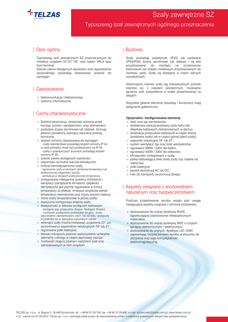 Szafy zewnętrzne SZ Typoszereg szaf zewnętrznych ogólnego przeznaczenia | Opis ogólny: Typoszereg szaf zewnętrznych SZ przeznaczonych do instalacji urządzeń 23”/21”/19” oraz baterii VRLA typu front terminal. Szeroki zakres dostępnych wysokości oraz wyposażenia opcjonalnego pozwalają dostosować produkt do wymagań. | Zastosowanie: + telekomunikacja i teletransmisja; + systemy informatyczne. | Budowa: Szafy posiadają pojedyncze (IP20) lub podwójne (IP54/IP55) ściany aluminiowe lub stalowe i są jest przystosowane do montażu na fundamencie betonowym lub stojaku metalowym przystosowanym do montażu szafy. Szafy są dostępne w trzech różnych wysokościach. Wykonujemy również szafy wg indywidualnych potrzeb klientów np. z cokołem podziemnym, modularne łączenie szaf, przeszklenia w szafie prezentowanej na targach. Wszystkie główne elementy obudowy i konstrukcji mają połączenie galwaniczne. | Cechy charakterystyczne: + Solidna konstrukcja: doskonała ochrona przed korozją, kurzem, wandalizmem oraz włamaniami; + podwójne ściany aluminiowe lub stalowe formują płaszcz powietrzny tworzący naturalną izolację termiczną; + stopień ochrony dopasowany do wymagań: - szafy standardowo posiadają stopień ochrony IP 54, w razie potrzeby może być podwyższony na IP 55, - szafy o pojedynczych ścianach posiadają stopień ochrony IP 20; + szeroki zakres dostępnych wysokości; + odporność na trudne warunki klimatyczne; + funkcje termodynamiczne szafy: - ogrzewanie szafy w okresach obniżonej temperatury lub podwyższonej wilgotności (opcja), - wentylacja w okresach podwyższonej temperatury; + zintegrowane inteligentne systemy chłodzenia i wentylacji (zarządzanie klimatem): prędkość wentylatorów jest płynnie regulowana w funkcji temperatury (w efekcie: mniejsza amplituda wahań temperatury wewnętrznej oraz niższy poziom hałasu); + różne strefy temperaturowe w jednej szafie; + elastyczna konfiguracja wnętrza szafy; + elastyczność w zakresie podłączeń kablowych: - dostępne typy przepustów (Ergom, Multigate, Roxtec): - możliwość podłączenia przewodów od góry - przez odpowiednio zaprojektowany dach, lub od dołu - przepusty w podłodze lub w specjalnie wykonanym cokole; + wewnątrz szafy można instalować urządzenia 23”, po zamontowaniu wsporników redukcyjnych 19” lub 21”; + regulowane półki bateryjne; + łatwość transportu poprzez wykorzystanie uchwytów (elementy udźwigu w części dachowej) (opcja); + możliwość objęcia zdalnym nadzorem szaf oraz zainstalowanych w nich urządzeń. Opcjonalne / konfigurowalne elementy: + ilość oraz typ wentylatorów; + dodatkowa izolacja podstawy szafy (tylko dla dławików kablowych zlokalizowanych w dachu); + lokalizacja przepustów kablowych w części dolnej (podstawa szafy) lub w części górnej (dach szafy); + wsporniki redukcyjne 19” lub 21”; + system wentylacji: typ oraz ilość wentylatorów; + ogrzewacz 500W / 230V dla baterii; + ogrzewacz 500W / 230V dla odbiorów; + klimatyzator zintegrowany z szafą; + półka oddzielająca dwie strefy szafy (np. baterie od odbiorów); + półki bateryjne; + panele dystrybucji AC lub DC; + haki do transportu za pomocą dźwigu. | Aspekty związane z środowiskiem naturalnym oraz bezpieczeństwem: Podczas projektowania wyrobu wzięto pod uwagę następujące aspekty związane z ochroną środowiska: + dostosowanie do unijnej dyrektywy RoHS ograniczającej zastosowanie niebezpiecznych materiałów; + dostosowanie do unijnej dyrektywy WEE o zużytym sprzęcie elektronicznym i elektrycznym; + dostosowanie do unijnych dyrektyw LVD i EMC zapewniając bezpieczeństwo wyrobu w stosunku do otoczenia oraz jego kompatybilność elektromagnetyczną. TELZAS sp. z o.o. ul. Bugno 3, 78-400 Szczecinek, tel. +48 94 37 29 750, fax +48 94 37 29 800, e-mail: [email protected], www.telzas.com.pl v1.0 - ważne od: 07.05.2014 Telzas sp. z o.o. zastrzega sobie prawo do wprowadzania zmian i modyfikacji powyższych danych bez powiadomienia. Podstawowe parametry: Dane ogólne: Wymiary zewnętrzne mm Wymiary zewnętrzne mm Wysokość robocza - Maksymalna nośność Stopień ochrony kg - 756 x 803 (S x G) 1321 / 1500 / 1748 (W) 19U / 27U / 31U / 36U 1000 IP 20 / IP 54 / IP 55 Odporność na włamanie - RC2* zgodnie z normą PN-EN 1630 : 2011 Zamek - trzypunktowy Materiał - stal / aluminium Powłoka - farba proszkowa kolor: RAL 7035 Liczba wentylatorów* - 1/2/3/4 Moc went. / Przepływ powietrza - Wentylacja: Hałas Klasa filtracji dB - 34W / 6 m3/min 96W / 17,5 m3/min 67 @ 34W fan 74 @ 96W fan G3 * - Klasa RC3 dostępna na zapytanie. ** - Liczba i rodzaj wentylatorów zależy od wysokości szafy i rodzaju drzwi TELZAS sp. z o.o. ul. Bugno 3, 78-400 Szczecinek, tel. +48 94 37 29 750, fax +48 94 37 29 800, e-mail: [email protected], www.telzas.com.pl v.01 - ważne od: 07.05.2014 Telzas sp. z o.o. zastrzega sobie prawo do wprowadzania zmian i modyfikacji powyższych danych bez powiadomienia.
