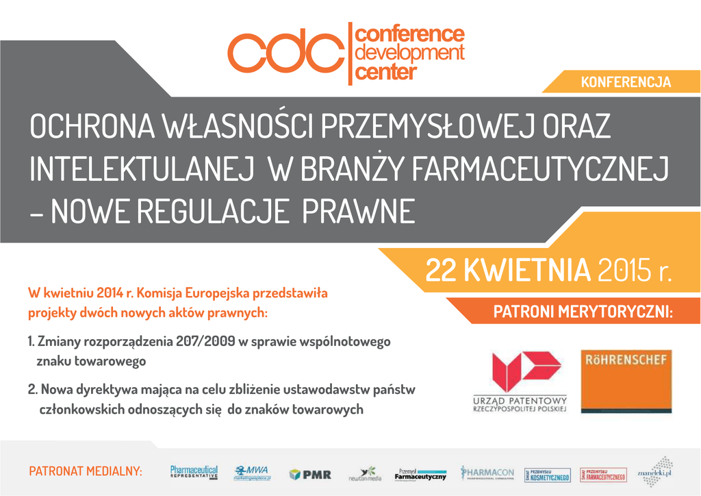 KONFERENCJA OCHRONA WŁASNOŚCI PRZEMYSŁOWEJ ORAZ INTELEKTULANEJ W BRANŻY FARMACEUTYCZNEJ – NOWE REGULACJE PRAWNE W kwietniu 2014 r. Komisja Europejska przedstawiła projekty dwóch nowych aktów prawnych: 1. Zmiany rozporządzenia 207/2009 w sprawie wspólnotowego znaku towarowego 2. Nowa dyrektywa mająca na celu zbliżenie ustawodawstw państw członkowskich odnoszących się do znaków towarowych PATRONAT MEDIALNY: 22 KWIETNIA 2015 r. PATRONI MERYTORYCZNI: Szanowni Państwo, zapraszamy do udziału w konferencji „Ochrona własności przemysłowej oraz intelektulanej w branży farmaceutycznej – nowe regulacje prawne”, która odbędzie się 22 kwietnia 2015 r., w hotelu Regent Warsaw (dawny Hyatt) ul. Belwederska 23 w Warszawie. W kwietniu 2014 r. Komisja Europejska przedstawiła projekty dwóch nowych aktów prawnych: 1. Zmiany rozporządzenia 207/2009 w sprawie wspólnotowego znaku towarowego 2. Nowa dyrektywa mająca na celu zbliżenie ustawodawstw państw członkowskich odnoszących się do znaków towarowych Są one przedmiotem prac grupy roboczej Rady EU ds. znaków towarowych , w wyniku których powstały teksty kompromisowe zarówno dyrektywy jak i rozporządzenia. Podczas konferencji zostaną omówione przez panią Ewę Demby - Siwek – Dyrektor Badań Znaków Towarowych Urzędu Patentowego RP. Ponadto główne tematy konferencji to: ¥ŬŬKlif patentowy. Ochrona patentów na drugie i kolejne zastosowania medyczne ¥ŬŬPraktyka on-label, off-label i cross-label ¥ŬŬOchrona patentowa a ochrona wyłączności danych referencyjnych produktów leczniczych ¥ŬŬReżim ochrony wyłączności danych i obrotu w procedurze centralnej ¥ŬŬZnak towarowy w procesie rejestracji i zmian porejestracyjnych Produktów leczniczych Zadaj pytanie ekspertom! Każdy uczestnik ma możliwość uzyskania szczegółowej odpowiedzi w trakcie konferencji. Prześlij swoje pytanie na adres: [email protected] Elementem wyróżniającym konferencję jest możliwość zadania pytań wykładowcom terminie 7 dni od daty zakończenia na adres mailowy: [email protected]. Odpowiedź uzyskają Państwo również w terminie 7 dni od daty przesłania zapytania. Sylwia Nowińska CEO CONFERENCE DEVELOPMENT CENTER AGENDA KONFERENCJI 22 kwietnia 9.30 - 10.00 Kawa powitalna oraz rejestracja uczestników 10.00 - 11.30 WYKŁAD 11.30 - 11.45 Przerwa kawowa 11.45 – 13.15 WYKŁAD 13.15 - 14.00 LUNCH 14.00 -16.30 WYKŁAD 16.30 Wręczenie certyfikatów oraz zakończenie konferencji PROGRAM 9.30 – 10.00 Kawa powitalna oraz rejestracja uczestników 10.00 - 11.30 Zmiany w prawie unijnym : dyrektywa i rozporządzenie o znakach towarowych: zmiany rozporządzenia 207/2009 w sprawie wspólnotowego znaku towarowego oraz nowe dyrektywy mającej na celu zbliżenie ustawodawstw państw członkowskich odnoszących się do znaków towarowych a) Proponowane zmiany w zakresie prawa materialnego. b) Zmiany w zakresie procedury uzyskania oraz utrzymania prawa na znak towarowy. c) Wpływ proponowanych zmian na polskie prawo. Prelegentka: Ewa Demby –Siwek - Dyrektor Departamentu Znaków Towarowych Urzędu RP 11.30 - 11.45 Przerwa kawowa 11.45 – 13.15 Klif patentowy. Ochrona patentów na drugie i kolejne zastosowania medyczne ŬŬ¥ŬIstota wynalazku, brzmienie zastrzeżeń patentowych: patent na sposób czy produkt ŬŬ¥ŬPraktyka on-label, off-label i cross-label ŬŬ¥ŬNaruszenie patentu: bezpośrednie czy pośrednie ŬŬ¥ŬUdowodnienie naruszenia: ulotka czy praktyka ŬŬ¥ŬSformułowanie roszczeń: zakazy czy nakazy Prelegentka: Dr Justyna Tokarzewska - Kancelaria RöHRENSCHEF 13.15 – 14.00 LUNCH 14.00 - 16.30 Kwestie związane z ochroną patentową z punktu widzenia organu regulacyjnego – urzędu rejestracji 1. Ochrona patentowa a ochrona wyłączności danych referencyjnych produktów leczniczych ŬŬ¥Ŭczy po zakończeniu ochrony wyłączności danych referencyjnego produktu leczniczego można złożyć wniosek o dopuszczenie do obrotu odpowiednika referencyjnego produktu leczniczego mimo obowiązywania ochrony patentowej? ŬŬ¥Ŭomówienie poszczególnych etapów okresów wyłączności danych: 8 + 2 + 1, czym różni się okres wyłączności podstawowej od wyłączności rynkowej oraz wyłączności dotyczącej dodatkowego wskazania ŬŬ¥ŬJak skutecznie wydłużyć okres wyłączności danych aby zmaksymalizować zyski sprzedawanego referencyjnego (oryginalnego) produktu leczniczego? 2. Reżim ochrony wyłączności danych i obrotu w procedurze centralnej ŬŬ¥ŬW tej części zostanie przedstawiony reżim wyłączności danych referencyjnych produktów leczniczych na gruncie procedury centralnej uregulowanej w rozporządzeniu nr 726/2004 Parlamentu Europejskiego i Rady z dnia 31 marca 2004 r. ustanawiające wspólnotowe procedury wydawania pozwoleń dla produktów leczniczych stosowanych u ludzi do celów weterynaryjnych i nadzoru nad nimi oraz ustanawiające Europejską Agencję Leków. 3. Sieroce produkty lecznicze – wyłączność obrotu na rynku ŬŬ¥ŬW tej części zostanie przedstawiony reżimu wyłączności danych referencyjnych produktów leczniczych na gruncie procedury związanej z sierocymi produktami leczniczymi, o których mowa w rozporządzeniu 141/2000 Parlamentu Europejskiego i Rady w sprawie sierocych produktów leczniczych. 4. Znak towarowy w procesie rejestracji i zmian porejestracyjnych Produktów leczniczych ŬŬ¥ŬPrelegent podzieli się z uczestnikami szkolenia swoim praktycznym doświadczeniem związanym z problemami na tle znaków towarowych, które m.in.,. stanowią część nazwy produktu leczniczego. 5. Tajemnica przedsiębiorcy ŬŬ¥ŬNiezwykle istotne zagadnienie związane z możliwością zastrzegania przez firmy farmaceutyczne danych, ŬŬ¥ŬPrelegent wskaże jak zastrzec wrażliwe dane w dokumentacji produktu leczniczego. 6. Dostęp do akt administracyjnych ze szczególnym uwzględnieniem dostępu do dokumentacji produktów leczniczych względem dostępu do in