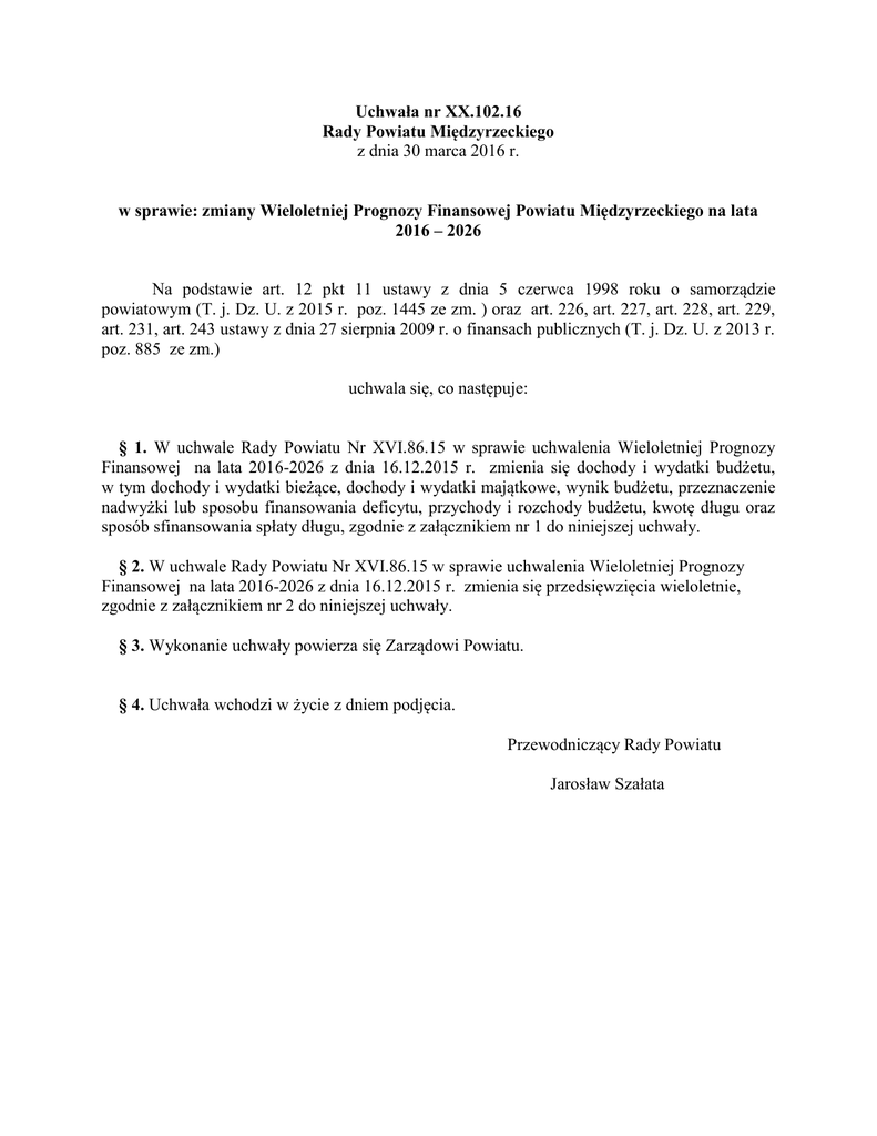 Uchwała nr XX.102.16 Rady Powiatu Międzyrzeckiego z dnia 30