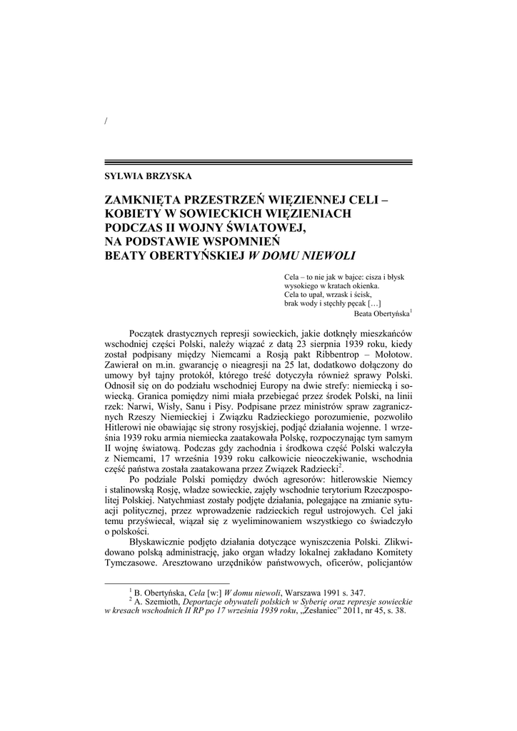 / SYLWIA BRZYSKA ZAMKNIĘTA PRZESTRZEŃ WIĘZIENNEJ CELI – KOBIETY W SOWIECKICH WIĘZIENIACH PODCZAS II WOJNY ŚWIATOWEJ, NA PODSTAWIE WSPOMNIEŃ BEATY OBERTYŃSKIEJ W DOMU NIEWOLI Cela – to nie jak w bajce: cisza i błysk wysokiego w kratach okienka. Cela to upał, wrzask i ścisk, brak wody i stęchły pęcak […] Beata Obertyńska1 Początek drastycznych represji sowieckich, jakie dotknęły mieszkańców wschodniej części Polski, należy wiązać z datą 23 sierpnia 1939 roku, kiedy został podpisany między Niemcami a Rosją pakt Ribbentrop – Mołotow. Zawierał on m.in. gwarancję o nieagresji na 25 lat, dodatkowo dołączony do umowy był tajny protokół, którego treść dotyczyła również sprawy Polski. Odnosił się on do podziału wschodniej Europy na dwie strefy: niemiecką i sowiecką. Granica pomiędzy nimi miała przebiegać przez środek Polski, na linii rzek: Narwi, Wisły, Sanu i Pisy. Podpisane przez ministrów spraw zagranicznych Rzeszy Niemieckiej i Związku Radzieckiego porozumienie, pozwoliło Hitlerowi nie obawiając się strony rosyjskiej, podjąć działania wojenne. 1 września 1939 roku armia niemiecka zaatakowała Polskę, rozpoczynając tym samym II wojnę światową. Podczas gdy zachodnia i środkowa część Polski walczyła z Niemcami, 17 września 1939 roku całkowicie nieoczekiwanie, wschodnia część państwa została zaatakowana przez Związek Radziecki2. Po podziale Polski pomiędzy dwóch agresorów: hitlerowskie Niemcy i stalinowską Rosję, władze sowieckie, zajęły wschodnie terytorium Rzeczpospolitej Polskiej. Natychmiast zostały podjęte działania, polegające na zmianie sytuacji politycznej, przez wprowadzenie radzieckich reguł ustrojowych. Cel jaki temu przyświecał, wiązał się z wyeliminowaniem wszystkiego co świadczyło o polskości. Błyskawicznie podjęto działania dotyczące wyniszczenia Polski. Zlikwidowano polską administrację, jako organ władzy lokalnej zakładano Komitety Tymczasowe. Aresztowano urzędników państwowych, oficerów, policjantów 1 B. Obertyńska, Cela [w:] W domu niewoli, Warszawa 1991 s. 347. A. Szemioth, Deportacje obywateli polskich w Syberię oraz represje sowieckie w kresach wschodnich II RP po 17 września 1939 roku, „Zesłaniec” 2011, nr 45, s. 38. 2 SYLWIA BRZYSKA 40 i działaczy politycznych, organizowano milicję, zarządzono godzinę policyjną, wprowadzono ruble, jako środek płatniczy, nakazano także usunięcie godła państwowego i portretów polskich mężów stanu z wszelkich miejsc publicznych3. W październiku 1939 roku, przeprowadzone zostały wybory dotyczące przyłączenia Kresów Wschodnich Rzeczypospolitej do ZSRR oraz wyznaczenia osób do władz lokalnych. Głosowanie przeprowadzane było pod ścisłą kontrolą funkcjonariuszy NKWD, sfałszowane wyniki zdecydowały, że wszyscy mieszkańcy stali się obywatelami ZSRR. Konsekwencją tego było wcielenie Polaków do Armii Czerwonej, zarówno mężczyzn, jak i kobiet, które miały przygotowanie medyczne4. Włączenie terenów okupowanych do ZSRR sprawiło, że sytuacja mieszkańców natychmiast uległa pogorszeniu. Nie mieli praw do własnego mienia, właściciele wszelkich majątków – fabryk, sklepów byli pozbawieni swoich własności i bezpodstawnie aresztowani lub zabijani. Brakowało podstawowych artykułów, ludzie w kolejkach po chleb stali całą noc, problem był ze zdobyciem opału na zimę. Dokonano zmiany w szkolnictwie, jego system został podporządkowany rosyjskiemu, gdzie obowiązywała struktura 10-klasowa. Zlikwidowano łacinę, wprowadzono język rosyjski, nauczano historii, geografii i konstytucji Związku Radzieckiego5. W natychmiastowym czasie wydano rozporządzenie, nakazujące rejestrację ludności. Sowieci dokładnie zbierali informację na temat każdego człowieka mieszkającego na okupowanym terenie. Chcieli wszystkich z osobna ocenić pod kątem tego, czy nadaje się na „lojalnego sowieckiego obywatela”6. Wszelkie dane uzyskane przy spisie ludności, pozwalały w szybki sposób odnaleźć tego, kto został zakwalifikowany do kategorii „wrogów nowego społeczeństwa”7, a to z kolei prowadziło do aresztowań. Rosjanom chodziło nie tylko o pozbawienie wolności, eliminację określonych osób uważanych za przeciwników władzy sowieckiej, ale również o „zastraszenie i psychiczne złamanie całego społeczeństwa” 8 . Główne zarzuty jakie był stawiane skazanemu, pochodziły przede wszystkim z artykułu 58 kodeksu karnego RFSRR, czyli: zdrada i walka przeciw ZSRR, szpiegostwo, dywersja, propaganda, czy różne inne działalności, także prowadzone w przeszłości9. Wśród licznych aresztowań, znalazły się również kobiety, które na równi z mężczyznami przeżywały piekło upodlenia i zniewolenia przez władze sowieckie. Jedną z takich kobiet była Beata Obertyńska – polska poetka, pisarka, aktorka. W swoich wspomnieniach W domu niewoli, opisuje zamkniętą i osaczającą człowieka przestrzeń celi, której granice wyznaczają mury więzienia. Aresztowania, przeprowadzane przez NKWD, miały miejsce głównie w nocy. Ludzie, czując się zagrożeni we własnych domach, tygodniami w nich nie nocowali. Mieszkania podejrzanych osób były ściśle obserwowane, gdy 3 J.T. Gross, I. Grudzińska-Gross, W czterdziestym nas Mamo na Sybir zesłali… Polska a Rosja 1939-1942, Kraków 2008, s. 25-26. 4 A. Szemioth, Deportacje…, s. 40. 5 D. Boćkowski, Jak pisklęta w gniazd. Dzieci polskie w ZSRR w okresie II wojny światowej, Warszawa – Wrocław 1995, s. 30. 6 J.T. Gross, I. Grudzińska-Gross, W czterdziestym…, s. 27. 7 Ibidem, s. 27. 8 Ibidem, s. 12. 9 Ibidem, s. 13. Zamknięta przestrzeń więziennej celi… 41 tylko ktoś wrócił po jakieś niezbędne rzeczy, czy pożegnać się z rodziną, natychmiast zjawiała się tajna policja. Innym przykładem aresztowań były tzw. łapanki. Polegały one na tym, że obstawiano milicją np. kawiarnię, po czy