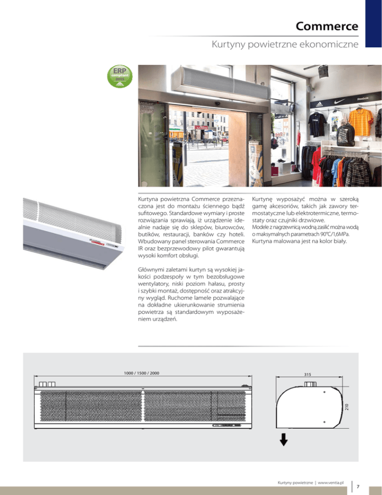 Commerce Kurtyny powietrzne ekonomiczne Kurtyna powietrzna Commerce przeznaczona jest do montażu ściennego bądź sufitowego. Standardowe wymiary i proste rozwiązania sprawiają, iż urządzenie idealnie nadaje się do sklepów, biurowców, butików, restauracji, banków czy hoteli. Wbudowany panel sterowania Commerce IR oraz bezprzewodowy pilot gwarantują wysoki komfort obsługi. Kurtynę wyposażyć można w szeroką gamę akcesoriów, takich jak zawory termostatyczne lub elektrotermiczne, termostaty oraz czujniki drzwiowe. Modele z nagrzewnicą wodną zasilić można wodą o maksymalnych parametrach 90°C/1,6MPa. Kurtyna malowana jest na kolor biały. Głównymi zaletami kurtyn są wysokiej jakości podzespoły w tym bezobsługowe wentylatory, niski poziom hałasu, prosty i szybki montaż, dostępność oraz atrakcyjny wygląd. Ruchome lamele pozwalające na dokładne ukierunkowanie strumienia powietrza są standardowym wyposażeniem urządzeń. 315 210 1000 / 1500 / 2000 Kurtyny powietrzne | www.ventia.pl 7 Commerce Kurtyny powietrzne ekonomiczne Długość mm Kurtyny powietrzne Commerce zimne 100 150 200 S S S 1000 1500 2000 Przepływ powietrza m3/h 1380 2200 2650 1100 1650 2200 Przepływ powietrza m3/h Moc grzewcza 80/60˚C Ti = 18˚C kW - - - 8,1 12,8 17,8 Moc grzewcza Straty ciśnienie kPa - - - 6,2 2,5 3,3 Przepływ czynnika m3/h - - - 0,32 0,54 0,76 Moc grzewcza 60/40˚C Ti = 18˚C kW - - - 4,6 7,2 10,1 Straty ciśnienie kPa - - - 2,4 0,9 1,3 Przepływ czynnika m3/h - - - 0,18 0,29 0,43 Stopnie grzania Napięcie wentylaV torów Moc wentylaW torów Natężenie wentyA latorów Napięcie wentylatorów V 230 230 230 230 230 230 Klasa ochrony Moc wentylatorów W 227 240 244 227 240 244 Natężenie wentylatorów A 1,2 1,3 1,3 1,2 1,3 1,3 Klasa ochrony IP 22 22 22 22 22 22 Poziom hałasu dB (A)* 52 52 53 52 52 53 Masa kg 12 17 21 17 24 30 Dane techniczne. Rodzaj sterowania Kurtyny powietrzne Commerce wodne 100 150 200 w w w 1000 1500 2000 Długość Dane techniczne: mm Kurtyny powietrzne Commerce - z nagrzewnicą elektryczną 100 100 100 150 150 150 200 200 200 E3 E6 E 9 E 7,5 E 12,5 E 15 E 10 E 15 E 17,5 1000 1000 1000 1000 1500 1500 1500 2000 2000 2000 100 E 3/230 1290 1290 1250 1220 1880 1880 1850 2550 2480 2480 3 3 6 9 7,5 12,5 15 10 15 17,5 230 400 400 400 400 400 400 400 400 400 2 2 2 2 2 2 2 2 2 2 230 230 230 230 230 230 230 230 230 230 227 227 227 227 240 240 240 244 244 244 1,2 1,2 1,2 1,2 1,3 1,3 1,3 1,3 1,3 1,3 IP 22 22 22 22 22 22 22 22 22 22 Poziom hałasu dB (A)* 52 52 52 52 52 52 52 53 53 53 Masa kg 17 17 18 18 24 25 26 30 31 31 kW V Rodzaj sterowania Commerce IR Commerce IR *) ciśnienie akustyczne dB(A) mierzone w odległości 3m od źródła Akcesoria: Elektryczne (zob. str. 51) Mechaniczne (zob. str. 54) Pilot zdalnego sterowania Mechaniczny czujnik drzwiowy DKM Sterownik Ditronic - LCD Zawory 2 lub 3 drożne - zawory termostatyczne lub elektrotermiczne (zob. str. 59) Sterownik Econ Podsufitowe lub ścienne zawiesia Magnetyczny czujnik drzwiowy DKMG Elastyczne przewody przyłączeniowe Czujnik pomieszczeniowy Filtry zamienne - EU2 Termostat pokojowy - TP 8 Kurtyny powietrzne | www.ventia.pl