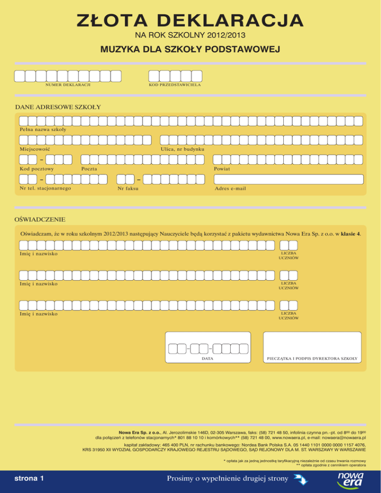ZŁOTA DEKLARACJA NA ROK SZKOLNY 2012/2013 MUZYKA DLA SZKOŁY PODSTAWOWEJ NUMER DEKLARACJI KOD PRZEDSTAWICIELA DANE ADRESOWE SZKOŁY Pełna nazwa szkoły Miejscowość Kod pocztowy Nr tel. stacjonarnego Ulica, nr budynku Poczta Powiat Adres e-mail Nr faksu OŚWIADCZENIE Oświadczam, że w roku szkolnym 2012/2013 następujący Nauczyciele będą korzystać z pakietu wydawnictwa Nowa Era Sp. z o.o. w klasie 4. Imię i nazwisko LICZBA UCZNIÓW Imię i nazwisko LICZBA UCZNIÓW Imię i nazwisko LICZBA UCZNIÓW DATA PIECZĄTKA I PODPIS DYREKTORA SZKOŁY Nowa Era Sp. z o.o., Al. Jerozolimskie 146D, 02-305 Warszawa, faks: (58) 721 48 50, infolinia czynna pn.–pt. od 800 do 1900 dla połączeń z telefonów stacjonarnych* 801 88 10 10 i komórkowych** (58) 721 48 00, www.nowaera.pl, e-mail: [email protected] kapitał zakładowy: 465 400 PLN, nr rachunku bankowego: Nordea Bank Polska S.A. 05 1440 1101 0000 0000 1157 4076, KRS 31950 XII WYDZIAŁ GOSPODARCZY KRAJOWEGO REJESTRU SĄDOWEGO, SĄD REJONOWY DLA M. ST. WARSZAWY W WARSZAWIE * opłata jak za jedną jednostkę taryfikacyjną niezależnie od czasu trwania rozmowy ** opłata zgodnie z cennikiem operatora strona 1 Prosimy o wypełnienie drugiej strony W związku z podpisaniem deklaracji wyboru pakietu Nowej Ery Nauczycielom przysługują do pracy w szkole poniższe bezpłatne publikacje z zadeklarowanej serii (wysyłka realizowana od 15 sierpnia 2012): 0 8 7 2 9 KOD ZESTAWU 3 „I gra muzyka” – Podręcznik wraz z dodatkami „Zagrajmy!” i „Zaśpiewajmy!” i płytą CD „Muzyka na ekranie”, kl. 4–6 3 „I gra muzyka” – Zeszyt ucznia, kl. 4–6 3 „I gra muzyka” – Książka Nauczyciela, kl. 4–6 3 „I gra muzyka” – Płyta Nauczyciela, kl. 4–6 3 Audioteka z utworami do śpiewania, 3 CD, kl. 4–6 3 Audioteka z utworami do słuchania, 3 CD, kl. 4–6 3 Audioteka z utworami na flet i dzwonki, 2 CD, kl. 4–6 3 Dwustronna plansza dydaktyczna Proszę o wysłanie ........................................... Proszę o wysłanie ........................................... Proszę o wysłanie ........................................... PODPIS NAUCZYCIELA PODPIS NAUCZYCIELA PODPIS NAUCZYCIELA W związku z podpisaniem deklaracji wyboru pakietu Nowej Ery Nauczycielom przysługują do pracy w szkole poniższe bezpłatne publikacje z zadeklarowanej serii (wysyłka realizowana od 15 sierpnia 2012): 0 8 7 3 0 KOD ZESTAWU 3 „Lekcja muzyki” – Podręcznik dla kl. 4 wraz z dodatkiem „Zagrajmy!” i płytą CD „Muzyka na ekranie” dla kl. 4–6 3 „Lekcja muzyki” – Zeszyt ćwiczeń, kl. 4 3 „Lekcja muzyki” – Książka Nauczyciela, kl. 4 3 „Lekcja muzyki” – Płyta Nauczyciela, kl. 4 3 Audioteka z utworami do śpiewania, 3 CD, kl. 4–6 3 Audioteka z utworami do słuchania, 3 CD, kl. 4–6 3 Audioteka z utworami na flet i dzwonki, 2 CD, kl. 4–6 3 Dwustronna plansza dydaktyczna Proszę o wysłanie ........................................... Proszę o wysłanie ........................................... Proszę o wysłanie ........................................... PODPIS NAUCZYCIELA PODPIS NAUCZYCIELA PODPIS NAUCZYCIELA Uwaga! Wyjątkowa okazja! Nauczyciele, którzy podpiszą deklarację otrzymają bezpłatnie Zestaw dla Zdecydowanych. Promocja trwa do wyczerpania nakładów. Szczegóły u Przedstawicieli Oświatowych lub na Infolinii. Nowa Era Sp. z o.o., Al. Jerozolimskie 146D, 02-305 Warszawa, faks: (58) 721 48 50, infolinia czynna pn.–pt. od 800 do 1900 dla połączeń z telefonów stacjonarnych* 801 88 10 10 i komórkowych** (58) 721 48 00, www.nowaera.pl, e-mail: [email protected] kapitał zakładowy: 465 400 PLN, nr rachunku bankowego: Nordea Bank Polska S.A. 05 1440 1101 0000 0000 1157 4076, KRS 31950 XII WYDZIAŁ GOSPODARCZY KRAJOWEGO REJESTRU SĄDOWEGO, SĄD REJONOWY DLA M. ST. WARSZAWY W WARSZAWIE * opłata jak za jedną jednostkę taryfikacyjną niezależnie od czasu trwania rozmowy ** opłata zgodnie z cennikiem operatora strona 2 Prosimy o wypełnienie pierwszej strony