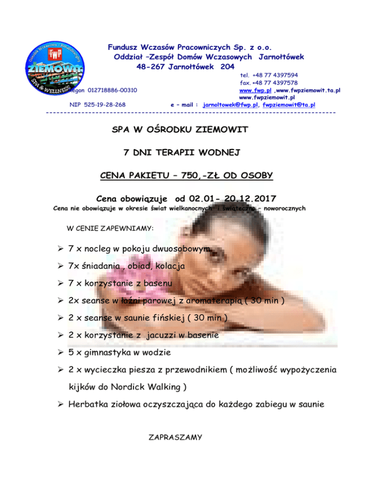 Fundusz Wczasów Pracowniczych Sp. z o.o. Oddział –Zespół Domów Wczasowych Jarnołtówek 48-267 Jarnołtówek 204 tel. +48 77 4397594 fax. +48 77 4397578 Regon 012718886-00310 www.fwp.pl ,www.fwpziemowit.ta.pl www.fwpziemowit.pl NIP 525-19-28-268 e – mail : [email protected], [email protected] ---------------------------------------------------------------------------------- SPA W OŚRODKU ZIEMOWIT 7 DNI TERAPII WODNEJ CENA PAKIETU – 750,-ZŁ OD OSOBY Cena obowiązuje od 02.01- 20.12.2017 Cena nie obowiązuje w okresie świat wielkanocnych i świąteczno – noworocznych W CENIE ZAPEWNIAMY: Ø 7 x nocleg w pokoju dwuosobowym Ø 7x śniadania , obiad, kolacja Ø 7 x korzystanie z basenu Ø 2x seanse w łaźni parowej z aromaterapią ( 30 min ) Ø 2 x seanse w saunie fińskiej ( 30 min ) Ø 2 x korzystanie z jacuzzi w basenie Ø 5 x gimnastyka w wodzie Ø 2 x wycieczka piesza z przewodnikiem ( możliwość wypożyczenia kijków do Nordick Walking ) Ø Herbatka ziołowa oczyszczająca do każdego zabiegu w saunie ZAPRASZAMY