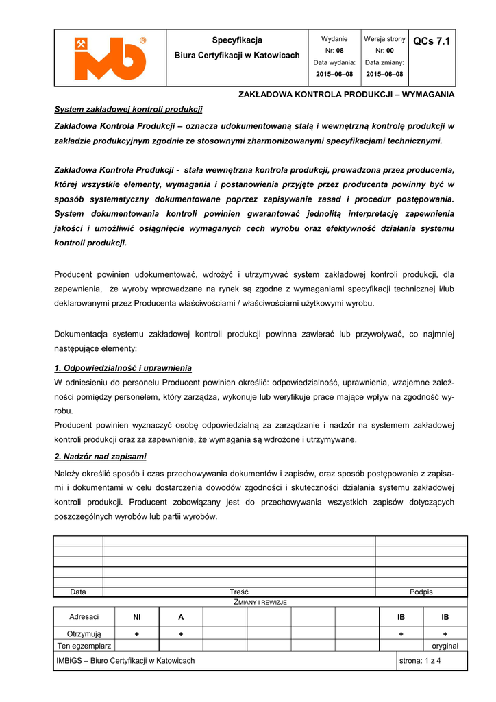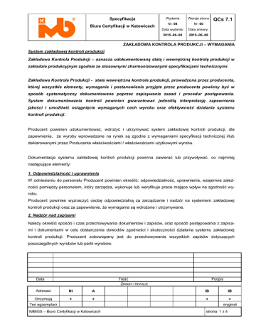Specyfikacja Biura Certyfikacji w Katowicach Wydanie Wersja strony Nr: 08 Nr: 00 Data wydania: Data zmiany: 2015–06–08 2015–06–08 QCs 7.1 ZAKŁADOWA KONTROLA PRODUKCJI – WYMAGANIA System zakładowej kontroli produkcji Zakładowa Kontrola Produkcji – oznacza udokumentowaną stałą i wewnętrzną kontrolę produkcji w zakładzie produkcyjnym zgodnie ze stosownymi zharmonizowanymi specyfikacjami technicznymi. Zakładowa Kontrola Produkcji - stała wewnętrzna kontrola produkcji, prowadzona przez producenta, której wszystkie elementy, wymagania i postanowienia przyjęte przez producenta powinny być w sposób systematyczny dokumentowane poprzez zapisywanie zasad i procedur postępowania. System dokumentowania kontroli powinien gwarantować jednolitą interpretację zapewnienia jakości i umożliwić osiągnięcie wymaganych cech wyrobu oraz efektywność działania systemu kontroli produkcji. Producent powinien udokumentować, wdrożyć i utrzymywać system zakładowej kontroli produkcji, dla zapewnienia, że wyroby wprowadzane na rynek są zgodne z wymaganiami specyfikacji technicznej i/lub deklarowanymi przez Producenta właściwościami / właściwościami użytkowymi wyrobu. Dokumentacja systemu zakładowej kontroli produkcji powinna zawierać lub przywoływać, co najmniej następujące elementy: 1. Odpowiedzialność i uprawnienia W odniesieniu do personelu Producent powinien określić: odpowiedzialność, uprawnienia, wzajemne zależności pomiędzy personelem, który zarządza, wykonuje lub weryfikuje prace mające wpływ na zgodność wyrobu. Producent powinien wyznaczyć osobę odpowiedzialną za zarządzanie i nadzór na systemem zakładowej kontroli produkcji oraz za zapewnienie, że wymagania są wdrożone i utrzymywane. 2. Nadzór nad zapisami Należy określić sposób i czas przechowywania dokumentów i zapisów, oraz sposób postępowania z zapisami i dokumentami w celu dostarczenia dowodów zgodności i skuteczności działania systemu zakładowej kontroli produkcji. Producent zobowiązany jest do przechowywania wszystkich zapisów dotyczących poszczególnych wyrobów lub partii wyrobów. Treść ZMIANY I REWIZJE Data Podpis Adresaci NI A IB Otrzymują + + + Ten egzemplarz IMBiGS – Biuro Certyfikacji w Katowicach IB + oryginał strona: 1 z 4 Specyfikacja Wydanie Wersja strony Nr: 08 Nr: 00 Data wydania: Data zmiany: 2015–06–08 2015–06–08 Biura Certyfikacji w Katowicach QCs 7.1 ZAKŁADOWA KONTROLA PRODUKCJI – WYMAGANIA 3. Kontrola i sprawdzenie surowców oraz innych materiałów składowych Producent powinien ustalić i nadzorować sposób dokonywania zakupów surowców i materiałów do produkcji. Powinny zostać określone wymagania i kryteria oceny dla surowców i materiałów składowych. Przy wyborze sposobu sprawdzenia należy uwzględnić kontrolę przeprowadzaną przez Producenta oraz udokumentowany dowód zgodności. Producent powinien gwarantować, że dostarczone surowce lub inne materiały składowe zostały zastosowane lub przetworzone po zweryfikowaniu ich zgodności z określonymi wymaganiami. Z działalności tej powinny być prowadzone zapisy. 4. Kontrola i badania w czasie produkcji Producent powinien nadzorować proces wytwarzania wyrobu i dokonywać kontroli i badań, w celu otrzymania wyrobu zgodnego z wymaganiami. Powinny zostać określone, co najmniej: rodzaj i zakres kontroli prowadzonych w czasie produkcji, kontrolowane parametry, metody i częstość kontroli, kryteria oceny wyników kontroli i badań. Z działalności tej powinny być prowadzone zapisy. 5. Kontrola i badania wyrobu gotowego Producent powinien przeprowadzać kontrole i badania wyrobu gotowego zgodnie z planem badań. W planie kontroli i badań wyrobu gotowego opracowanym przez producenta na podstawie wymagań specyfikacji technicznej należy określić, co najmniej: wielkość partii wyrobu, liczność próbki, miejsce i sposób jej pobrania, badane właściwości, metodę badań wskazaną w specyfikacji technicznej, częstość wykonywania badań, wartość lub ustalenie ( kryteria przyjęcia ) badanych właściwości. Plan kontroli i badań powinien zawierać wszystkie deklarowane przez Producenta właściwości wyrobu. Producent powinien prowadzić zapisy, będące dowodem wykonania kontroli i badań. Zapisy wyników kontroli i badań powinny zawierać, co najmniej: identyfikację wyrobu, datę produkcji, zastosowane metody badań poszczególnych właściwości, wyniki kontroli i badań, ocenę zgodności wyników kontroli i badań z wymaganiami ( kryteria przyjęcia ) określonymi w planie badań. Zapisy te powinny być podpisane przez upoważnioną osobę, która przeprowadzała kontrole / badania. W przypadku gdy wyrób nie spełnia wymagań, Producent powinien podjąć niezbędne działania dotyczące wyrobu niezgodnego a także, w razie potrzeby, działania korekcyjne i korygujące/zapobiegawcze przewidziane w systemie zakładowej kontroli produkcji. IMBiGS – Biuro Certyfikacji w Katowicach strona: 2 z 4 Wydanie Wersja strony Nr: 08 Nr: 00 Data wydania: Data zmiany: 2015–06–08 2015–06–08 Specyfikacja Biura Certyfikacji w Katowicach QCs 7.1 ZAKŁADOWA KONTROLA PRODUKCJI – WYMAGANIA 6. Wyposażenie do pomiarów, kontroli i badań Producent powinien ustalić sposób nadzorowania, wzorcowania / sprawdzania i utrzymywania w należytym stanie wyposażenia do kontroli, pomiarów i badań w celu zachowania spójności pomiarowej. Producent powinien prowadzić nadzór nad wymienionym wyposażeniem . Należy określić: jakie przyrządy są niezbędne do prowadzenia pomiarów, kontroli i badań, wykaz posiadanych przyrządów, harmonogram sprawdzeń metrologicznych przyrządów i nadzorować jego realizację, posiadać instrukcję obsługi i sprawdzeń bieżących przyrządów. Jeżeli Producent nie posiada odpowiednich kompetencji technicznych do prowadzenia kontroli i badań może korzystać z usług podwykonawców. Z powyższej działalnośc