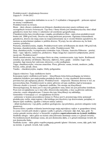 Produktywność i eksploatacja biocenoz Zajęcia 9 / 19-04-2012 Prezentacja – (generalnie dokładnie to co na 2 i 3 wykładzie z biogeografii – polecam zajrzeć na stronę z notatkami) Produktywność na świecie. Biom – duży obszar o jednakowym klimacie charakterystycznej szacie roślinnej oraz szczególnym świecie zwierzęcym. Typ flory i fauny biomu jest charakterystyczny choć skład gatunkowy może być różny w zależności od szerokości geograficznej. Charakterystyka lasu równikowego i mapka, przykładowa flora - najwyższa produktywność brutto (ok. 2000 g/m2/rok). Drzewa nie mają pierścieni przyrostu. Ogromna różnorodność gatunkowa, drzewa nie mają szans na rozprzestrzenianie się w swoim bliskim sąsiedztwie, bo nasiona są natychmiast zjadane w pobliżu drzewa. Wycięty las nie odtwarza się, bo brak warstwy próchnicy. Pustynia, charakterystyka, mapka. Produktywność netto od kilkunastu do około 100 g/m2/rok. Sawanna, charakterystyka, mapka, cechy roślin. Produktywność 700. Step, charakterystyka, występowanie (centralna Azja, Ukraina, Ameryka Północna – preria), flora – typy: łąkowe, ostnicowe, piołunowe. Stepy mogą być częściowo półpustynne, prerie raczej nie. Produktywność? Strefa umiarkowana, lasy zrzucające liście na zimę, rozmieszczenie, typy lasów. Roślinność zonalna, typ zależny od klimatu. Buczyny, dąbrowy, bory, grądy – zonalne. Łęgi i olsy azonalne, łęgi muszą być zalewane okresowo, a olsy podtapiane. Tajga, charakterystyka, wieczna zmarzlina. Flora, głównie: sosna, świerk, modrzew, jodła; brzoza, osika, jarząb, olsza. Tundra – charakterystyka, mapka. Gleby poligonalne. Zajęcia właściwe: Typy siedliskowe lasów Koncepcja typów siedliskowych lasów – klasyfikacja leśna którą posługują się leśnicy; zadaniem leśników jest maksymalna produkcja drewna. A więc zasobność drzewostanu powinna być jak najlepszej jakości. Produktywność – miąższość. Biomasa drewna w m3, na powierzchnię (ha). Produktywność ta zależy głównie od typu siedliska stąd ta koncepcja. Głównie chodzi o żyzność i wilgotność siedliska. Nie stosuje się klasyfikacji fitosocjologicznej, bo duża jest w niej rola gatunków runa, które nie jest potrzebne leśnikom. Poza tym uwzględnione są w niej tylko zbiorowiska naturalne, a lasy są głównie sadzone, sztuczne, często zdegradowane. Czasem oba typy klasyfikacji się nakładają. Generalnie w koncepcji s.t.l. uwzględniono kryteria: - położenie w krainie przyrodniczo-leśnej (w Polsce jest 8, przestawiają różny potencjał produkcyjny roślin, mają regiony i dla każdego jest docelowy typ drzewostanu, pożądany w danym typie siedliska, zgodnie z którym należy sadzić); - skład mechaniczny i typ gleby, podłoże geologiczne, typ próchnicy, poziom zalegania wody gruntowej. Drzewa które z punktu widzenia lasotwórczego mają największy wpływ w gospodarce leśnej to sosna i świerk jeśli chodzi o iglaste i jodła w górach, a liściaste: dąb, buk, lipa, grab. Te ważne gatunki można ułożyć w hierarchii względem zapotrzebowania na żyzność siedliska: Siedliska ubogie - takie gdzie na nizinie zdecydowanie dominuje sosna a w górach świerk); Na średniożyznych dominuje sosna, ale jest domieszka dębu, a w górach dominuje świerk ale jest domieszka buka. Siedliska żyzne – takie gdzie współwystępują gatunki iglaste i liściaste, sosna, dąb, garb, buk na nizinie, w górach: świerk, buk i jodła. Na bardzo żyznych – dominują las liściaste, na nizinie dąb, grab, buk, lipa i inne. Sosna jest wyeliminowana konkurencyjnie. W górach podobnie: dominuje buk, świerk eliminowany. Klasyfikacja pod względem wilgotności: Siedliska suche (poziom wody poniżej 2m, ciągły niedostatek wody) Siedliska świeże (drzewa rosną pod wpływem okresowego dostępu do wód gruntowych) Siedliska wilgotne (wody pod dostatkiem, lasy kształtują się pod stałym wpływem wody gruntowej) Siedliska mokre, bagienne (nadmiar wody, niekorzystny, czynnik ograniczający produktywność i występowanie wielu drzew. Olsza czarna jest w stanie tu występować.) Grądy przykładowo rozwijają się w średnio żyznych i żyznych, świeżych i wilgotnych. Łęgi – wilgotne i bardzo żyzne (najwięcej pomników przyrody). Kotlina warszawska – bez świerka, buka i jodły. Regionalizacja przyrodniczo-leśna Ważne dla opracowania tzw. operatów leśnych, dla określenia docelowego drzewostanu. Jest to przestrzenne zróżnicowanie potencjału produkcyjnego siedlisk. Geograficzne zróżnicowanie przyrodniczych warunków uprawy lasu. Krainy – podstawowe jednostki (podział najbardziej używany – Trampler’a, 1990): Bałtycka, Mazursko-Podlaska, Wielkopolsko-Pomorska, Mazowiecko-Podlaska, Śląska, Małopolska, Sudecka, Karpacka. Oparte na tym, że w podobnych warunkach klimatycznych i podłoża, rozwija się ten sam typ drzewostanu. Świerk jest w stanie wytrzymać bardzo krótki okres wegetacji. Może rosnąć w reglu górnym, ale mają tam bardzo kiepskie drewno (słaba gleba, liczne huragany, poza tym słaby do nich dostęp). Krainy różnią się lesistością, udziałem siedlisk borowych i produktywnością. Największa lesistość w krainach górskich (Karpaty – ponad 40% lasy). Na nizinach najwięcej lasów w krainie Mazursko-Podlaskiej. Dość dużo też w Bałtyckiej, a najmniej w MazowieckoPodlaskiej (dwukrotne zróżnicowanie między krainami). Najwięcej ubogich siedlisk jest w krainie wielkopolsko-pomorskiej. Najmniej w mazursko-podlaskiej. Produktywność ma związek z udziałem siedlisk borowych, ale w ogóle siedliska górskie znacznie większe produktywności niż nizinne, najwięcej kraina Karpacka. Sporo też Bałtycka. Najmniej – wielkopolsko-pomorska, bo ubogie siedliska. Krainy różnią się też udziałem poszczególnych gatunków drzew. Sosna w ogóle dominuje (69,3% w skali kraju), na wielu powierzchniach wprowadzona dla 