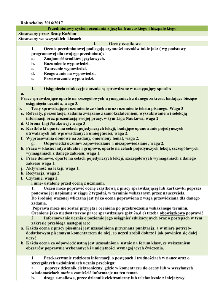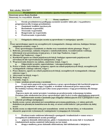 Rok szkolny 2016/2017 Przedmiotowy system oceniania z języka francuskiego i hiszpańskiego Stosowany przez Beatę Kożdoń Stosowany we wszystkich klasach I. Oceny cząstkowe 1. Ocenie przedmiotowej podlegają czynności uczniów takie jak: ( wg podstawy programowej dla twojego przedmiotu): a. Znajomość środków językowych. b. Rozumienie wypowiedzi. c. Tworzenie wypowiedzi. d. Reagowanie na wypowiedzi. e. Przetwarzanie wypowiedzi. 1. Osiągnięcia edukacyjne ucznia są sprawdzane w następujący sposób: a. Prace sprawdzające oparte na szczegółowych wymaganiach z danego zakresu, badające bieżące osiągnięcia uczniów, waga 3. b. Testy sprawdzające rozumienie ze słuchu oraz rozumienie tekstu pisanego. Waga 3 c. Referaty, prezentacje, zadania związane z samokształceniem, wyszukiwaniem i selekcją informacji oraz prezentacją swojej pracy, w tym Liga Naukowa, waga 2 d. Obrona Ligi Naukowej : waga 3 e. Kartkówki oparte na celach pojedynczych lekcji, badające opanowanie pojedynczych utrwalanych lub wprowadzanych umiejętności, waga 2. f. Wypracowania domowe na zadany, omówiony temat, waga 2. g. Odpowiedzi uczniów zapowiedziane i niezapowiedziane , waga 2. h. Praca w klasie: indywidualne i grupowe, oparte na celach pojedynczych lekcji, szczegółowych wymaganiach z danego zakresu, waga 1. i. Prace domowe, oparte na celach pojedynczych lekcji, szczegółowych wymaganiach z danego zakresu waga 1. j. Aktywność na lekcji, waga 1. k. Recytacja, waga 2. l. Czytanie, waga 2. i inne- ustalone przed oceną z uczniami. 1. Uczeń może poprawić ocenę cząstkową z pracy sprawdzającej lub kartkówki poprzez ponowne jej napisanie w ciągu 2 tygodni, w terminie wskazanym przez nauczyciela. Do średniej ważonej wliczana jest tylko ocena poprawiona z wagą przewidzianą dla danego zadania. Poprawa może nie zostać przyjęta i oceniona po przekroczeniu wskazanego terminu. Ocenione jako niedostateczne prace sprawdzające (pkt.2a,d.e) trzeba obowiązkowo poprawić. 2. Informowanie ucznia o poziomie jego osiągnięć edukacyjnych oraz o postępach w tym zakresie przebiega następująco: a. Każda ocena z pracy pisemnej jest uzasadniona przyznaną punktacją, a w miarę potrzebdodatkowym pisemnym komentarzem do niej, co uczeń zrobił dobrze i jak powinien się dalej uczyć. b. Każda ocena za odpowiedź ustną jest uzasadniona ustnie na forum klasy, ze wskazaniem obszarów poprawnie wykonanych i umiejętności wymagających ćwiczenia. 1. Przekazywanie rodzicom informacji o postępach i trudnościach w nauce oraz o szczególnych uzdolnieniach ucznia przebiega: a. poprzez dziennik elektroniczny, gdzie w komentarzu do oceny lub w wysyłanych wiadomościach można zamieścić informacje na ten temat. b. drogą e-mailową, przez dziennik elektroniczny lub telefonicznie z inicjatywy nauczyciela lub rodziców. c. na spotkaniach zorganizowanych z inicjatywy nauczyciela lub rodziców w czasie dni otwartych lub w innym ustalonym czasie. 1. Progi procentowe dla poszczególnych ocen cząstkowych: 0%-50%- stopień niedostateczny >50%-60%- stopień dopuszczający >60%-75%- stopień dostateczny >75%-85%- stopień dobry >85%-95%- stopień bardzo dobry >95%-100%- stopień celujący 1. Skala ocen cząstkowych: stopień Wartość do średniej (wybierz lub wpisz własne) Celujący 6 Celujący z minusem 5,75 Bardzo dobry z plusem 5,5 Bardzo dobry 5 Bardzo dobry z minusem 3,75 Dobry z plusem 4,5 Dobry 4 Dobry z minusem 3,75 Dostateczny z plusem 3,5 Dostateczny 3 Dostateczny z minusem 2,75 Dopuszczający z plusem 2,5 Dopuszczający 2 Dopuszczający z minusem 1,75 Niedostateczny 1 I. Prace ucznia 1. W razie nieobecności w dniu przedstawiania lub wykonywania danej pracy uczeń musi wywiązać się z tego zadania w ustalonym z nauczycielem terminie nie później niż w ciągu 12 dni roboczych po ustaniu nieobecności. 2. Uczeń otrzymuje na przechowanie wszystkie sprawdzone i ocenione prace pisemne zgodnie z terminami zawartymi w Statucie ZS 54. Uczeń jest zobowiązany do przechowywania ich do dnia, w którym mija roczny termin zgłaszania zastrzeżeń rodziców, jeżeli stwierdzą, że roczna ocena klasyfikacyjna z zajęć edukacyjnych została ustalona niezgodnie z przepisami dotyczącymi trybu ustalania tych ocen. 3. Uczeń przechowujący swoje prace udostępnia je swoim rodzicom. I. Nieprzygotowania 1. W przypadku zdarzeń losowych uczeń ma prawo dwa razy w trymestrze skorzystać z tzw. nieprzygotowania bez wyjaśniania jego powodów. 2. Nieprzygotowania zgłasza się z miejsca, ustnie w trakcie sprawdzania obecności na początku zajęć lub bezpośrednio po wejściu do klasy. I. Oceny klasyfikacyjne 1. Podstawą wystawienia oceny klasyfikacyjnej jest wskazana w dzienniku elektronicznym średnia ważona z ocen: w przypadku oceny trymestralnej- z danego trymestru; w przypadku oceny końcoworocznej – z całego roku; 1. Propozycję oceny klasyfikacyjnej wystawia się w następujący sposób: Ocena klasyfikacyjna Średnia ważona Celujący 5,75 - 6 Bardzo dobry 4,74 – 5,74 Dobry 3,75 – 4,74 Dostateczny 2,75 – 3,74 Dopuszczający 1,75 – 2,74 Niedostateczny 1 – 1,74 *Możliwe jest wystawienie oceny celującej przy średniej niższej niż wskazana, jeżeli uczeń: a. jest laureatem konkursu przedmiotowego MKO b. dba o swój rozwój przedmiotowy, realizując zadania Ligi Naukowej i inne niż Liga Naukowa, zadania dodatkowe co najmniej raz w każdym trymestrze c. przygotowywał się na zajęciach dodatkowych do konkursów związanych z przedmiotem, d. w przypadku oceny końcoworocznej lub końcowej – uzyskał ocenę bardzo dobrą z co najmniej dwóch trymestrów i wykonał trzy etapy Ligi Naukowej i obronił je na stopień celujący 1. O niższą niż celująca, ale wyższą o jeden stopień niż przewidywana trymestralną/ końcoworoczną/ końcową ocenę klasyfikacyjną może wystąpić do nauczyciela uczeń spełniający wszystkie poniższe warunki: a. wykonał w trymestrze wszystkie obowiązk