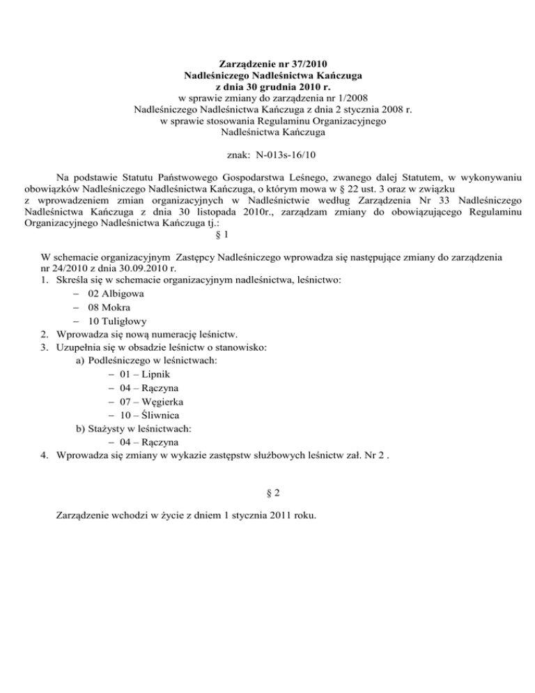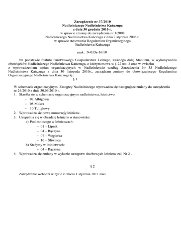 Zarządzenie nr 37/2010 Nadleśniczego Nadleśnictwa Kańczuga z dnia 30 grudnia 2010 r. w sprawie zmiany do zarządzenia nr 1/2008 Nadleśniczego Nadleśnictwa Kańczuga z dnia 2 stycznia 2008 r. w sprawie stosowania Regulaminu Organizacyjnego Nadleśnictwa Kańczuga znak: N-013s-16/10 Na podstawie Statutu Państwowego Gospodarstwa Leśnego, zwanego dalej Statutem, w wykonywaniu obowiązków Nadleśniczego Nadleśnictwa Kańczuga, o którym mowa w § 22 ust. 3 oraz w związku z wprowadzeniem zmian organizacyjnych w Nadleśnictwie według Zarządzenia Nr 33 Nadleśniczego Nadleśnictwa Kańczuga z dnia 30 listopada 2010r., zarządzam zmiany do obowiązującego Regulaminu Organizacyjnego Nadleśnictwa Kańczuga tj.: §1 W schemacie organizacyjnym Zastępcy Nadleśniczego wprowadza się następujące zmiany do zarządzenia nr 24/2010 z dnia 30.09.2010 r. 1. Skreśla się w schemacie organizacyjnym nadleśnictwa, leśnictwo: − 02 Albigowa − 08 Mokra − 10 Tuligłowy 2. Wprowadza się nową numerację leśnictw. 3. Uzupełnia się w obsadzie leśnictw o stanowisko: a) Podleśniczego w leśnictwach: − 01 – Lipnik − 04 – Rączyna − 07 – Węgierka − 10 – Śliwnica b) Stażysty w leśnictwach: − 04 – Rączyna 4. Wprowadza się zmiany w wykazie zastępstw służbowych leśnictw zał. Nr 2 . §2 Zarządzenie wchodzi w życie z dniem 1 stycznia 2011 roku. SCHEMAT ORGANIZACYJNY NADLEŚNICTWA KAŃCZUGA stan na 1.01.2011 r. NADLEŚNICZY N N P Stanowisko ds. Pracowniczych - specjalista ds. osobowych N S Posterunek Straży Leśnej 1 Komendant 2 Strażnik Z N Zastępca Dział Gospodarki Leśnej Z G 1. 2. 3. 5 01 02 Stażyści 03 Specjalista SL ds. ochrony lasu, p.poż., zamówień publicznych i administratora SILP-u 05 S A 1 St. Księgowa 1 Specjalista Referent 2 Kasjer 2 3 Księgowa 3. 4 Księgowa 5 Księgowa Inżynier Nadzoru Rob. obsługi BHP OIN 06 Podleś niczy 07 08 09 Podleś niczy Podleś niczy Podleś niczy 10 Śliwnica Staży sta Dział Administracyjno Gospodarczy Dział Finansowo Księgowy I N Kramarzówka Podleś niczy Sekretarz Borowiec Podleś niczy S Węgierka Staży sta Specj. SL ds. urządzania lasu, stanu posiadania i łowiectwa Główny Księgowy K F Roźwienica Hadle Podleś niczy 04 Specj. SL ds. hodowli lasu, ochrony przyrody i edukacji leśnej Szklary Tarnawka Podleś niczy 4. Specjalista SL ds. użytkowania lasu i gospodarki drewnem Rączyna Lipnik Podleś niczy K Podleś niczy Rob. pom. WYKAZ LEŚNICTW stan 1.01.2011 r. Lp. 1. 3. 4. 5. 6. 7. 9. 11. 12. 13. Nazwa Leśnictwa Leśnictwo Lipnik Leśnictwo Tarnawka Leśnictwo Hadle Leśnictwo Rączyna Leśnictwo Szklary Leśnictwo Roźwienica Leśnictwo Węgierka Leśnictwo Borowiec Leśnictwo Kramarzówka Leśnictwo Śliwnica Nazwisko i Imię Leśniczego Padiasek Emil Kisała Józef Rak Mirosław Barszczak Jerzy Papież Jan Pieczonka Józef Dąbek Zbigniew Orzechowski Paweł Gil Bogusław Daraż Janusz Nazwisko i Imię: Podleśniczego (stażysty) Słonina Hubert (Rupar Paweł) Hajduk Paweł Warchoł Jacek Potoczny Sylwester (Zając Łukasz) Żaczek Bogusław Szybiak Ireneusz Leńczyk Jan Gil Hubert Daraż Wiesław Hałuszka Jan Rob. pomoc.: Warchoł Mariusz WYKAZ ZASTĘPSTW SŁUŻBOWYCH LEŚNICTW Lp. Nazwisko i Imię Padiasek Emil Pracownik Stanowisko L-czy L-ctwa Lipnik L-czy L-ctwa Tarnawka 1. 2. Kisała Józef 3. Rak Mirosław 4. Barszczak Jerzy 5. Papież Jan L-czy L-ctwa Szklary 6. Pieczonka Józef L-czy L-ctwa Roźwienica 7. Dąbek Zbigniew L-czy L-ctwa Węgierka 8. Orzechowski Paweł L-czy L-ctwa Borowiec 9. Gil Bogusław L-czy L-ctwa Kramarzówka 10. Daraż Janusz L-czy L-ctwa Śliwnica 11. Słonina Hubert Podleśniczy 12. 13. 14. 15. 16. 17. 18. Hajduk Paweł Warchoł Jacek Potoczny Sylwester Żaczek Bogusław Szybiak Ireneusz Leńczyk Jan Gil Hubert Podleśniczy Podleśniczy Podleśniczy Podleśniczy Podleśniczy Podleśniczy Podleśniczy 19. 20. Daraż Wiesław Hałuszka Jan Podleśniczy Podleśniczy L-czy L-ctwa Hadle L-czy L-ctwa Rączyna Kańczuga, dnia 1.01.2011 r. Podpis zał. Nr 2 Zastępowany przez Nazwisko i Imię Stanowisko Słonina Hubert Podleśniczy L-ctwa Lipnik Hajduk Paweł Podleśniczy L-ctwa Tarnawka Warchoł Jacek Podleśniczy L-ctwa Hadle Potoczny Podleśniczy Sylwester L-ctwa Raczyna Żaczek Bogusław Podleśniczy L-ctwa Szklary Szybiak Ireneusz Podleśniczy L-ctwa Roźwienica Leńczyk Jan Podleśniczy L-ctwa Węgierka Gil Hubert Podleśniczy L-ctwa Borowiec Daraż Wiesław Podleśniczy L-ctwa Kramarzówka Hałuszka Jan Podleśniczy L-ctwa Śliwnica Padiasek Emil Leśniczy Kisała Józef Rak Mirosław Barszczak Jerzy Papież Jan Pieczonka Józef Dąbek Zbigniew Orzechowski Paweł Gil Bogusław Daraż Janusz Leśniczy Leśniczy Leśniczy Leśniczy Leśniczy Leśniczy Leśniczy Leśniczy Leśniczy Podpis WYKAZ ZASTĘPSTW SŁUŻBOWYCH Lp 1. Wójcik Juliusz 2. Kośmider Jerzy 3. 4. Zastępowany przez Pracownik Nazwisko i imię Stanowisko Nadleśniczy Zastępca Nadleśniczego Litwińska Główna Krystyna Księgowa Inżynier Kulpa Stanisław Nadzoru zał. Nr 1 P o d p i s Nazwisko i imię Kośmider Jerzy Stanowisko Zastępca Nadleśniczego Kulpa Stanisław Inżynier Nadzoru Sołtysiak Jolanta Kośmider Jerzy Starsza Księgowa Zastępca Nadleśniczego Specjalista ds. administracji 5. Żurek Elżbieta Sekretarz 6 Kubicka Maria Specjalista ds. osobowych 7. Żurek Dariusz Specjalista SL Misiewicz Stanisław Misiewicz Stanisław Skó k Kowal Piotr 8. Witold Barszczak Specjalista SL Robert Papież 9. Robert Papież Specjalista SL Barszczak Witold Specjalista SL Specjalista SL Żurek Dariusz Specjalista SL Specjalista ds. administracji Starsza 12. Sołtysiak Jolanta Księgowa Żurek Elżbieta Sekretarz Leniar Zofia Księgowa 10. Kowal Piotr 11. Misiewicz Stanisław Specjalista ds. administracji Księgowa Specjalista SL Specjalista SL 13. Leniar Zofia Księgowa Sołtysiak Jolanta Starsza Księgowa 14. Ruchel Zofia Kasjer Leniar Zofia Księgowa 15. Blok Anna Księgowa Skórska Grażyna Księgo